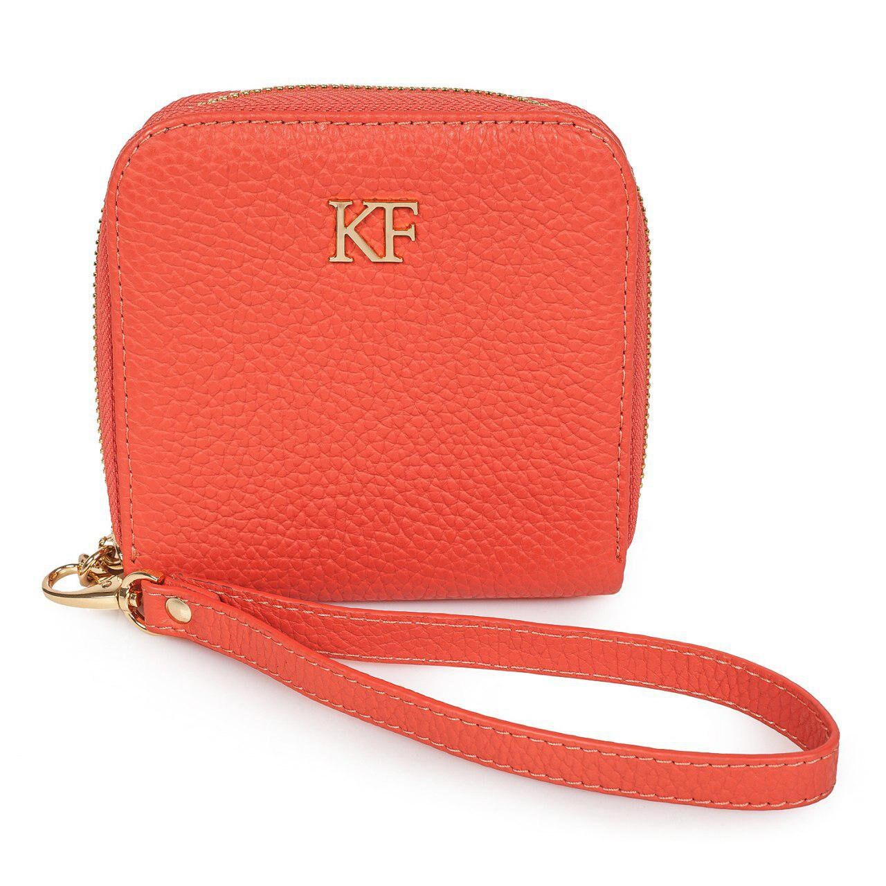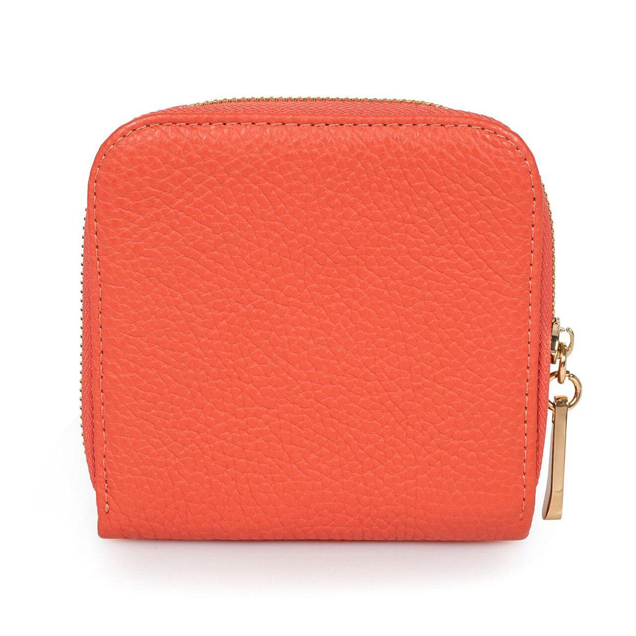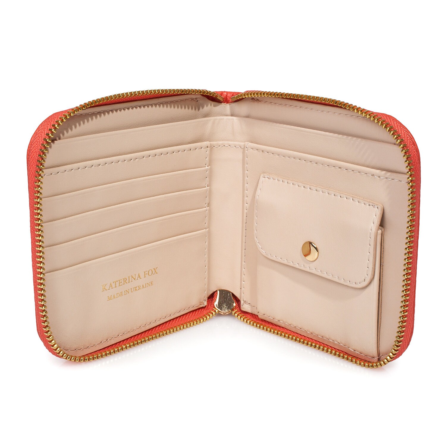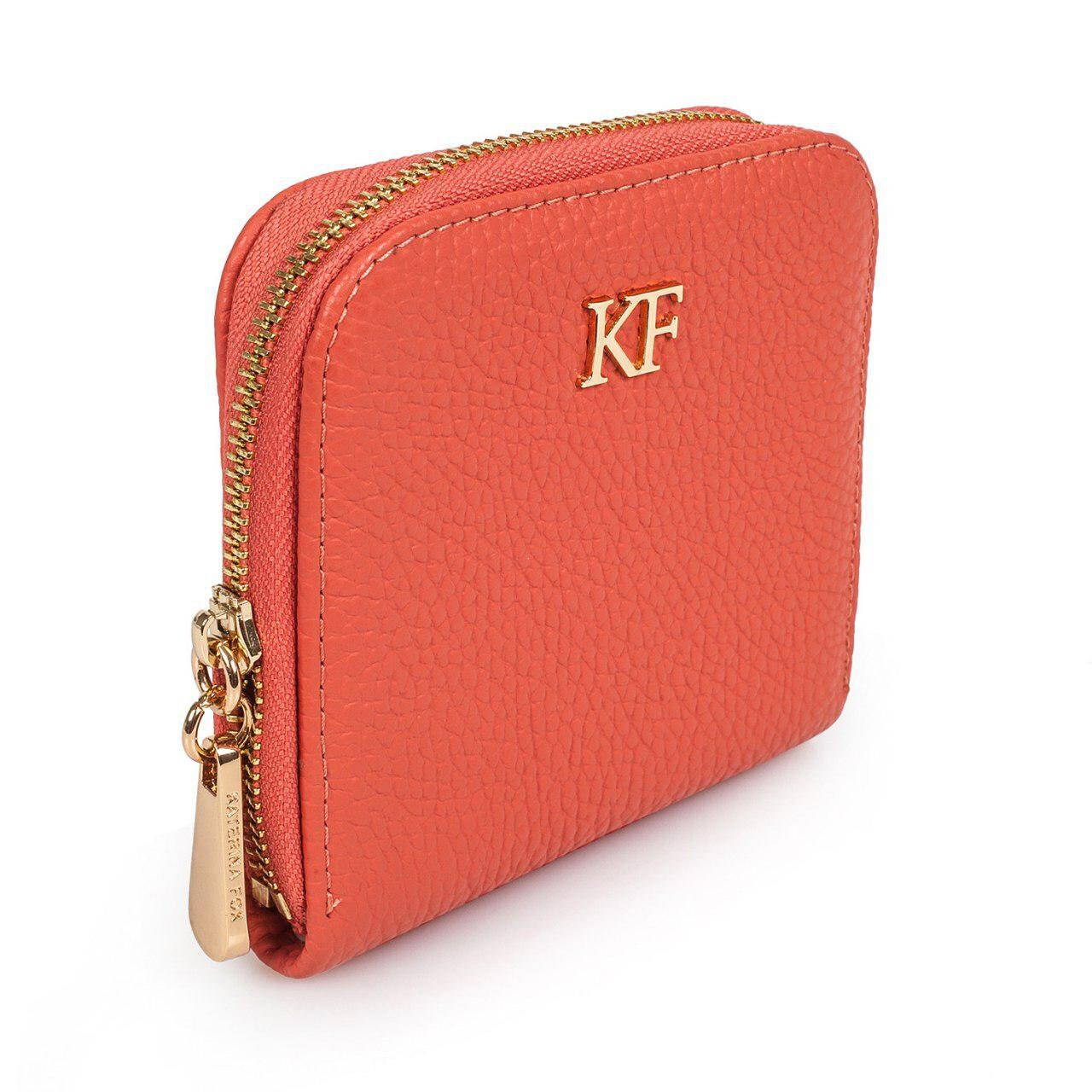 Coral genuine leather woman wallet from ukrainian designer Katerina Fox. The internal space of a wallet is equipped with two large compartments for banknotes, a pocket for coins and four business card compartments and two auxiliary compartments. The wallet is closed with a zipper. The kit also includes a storage bag.