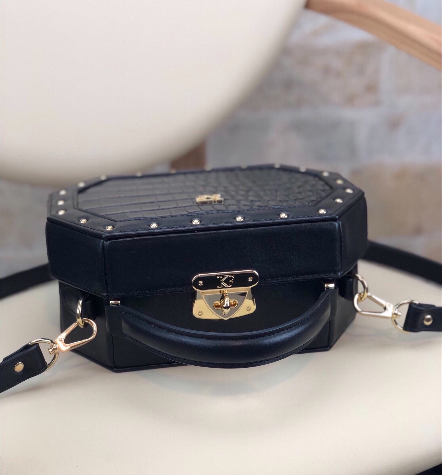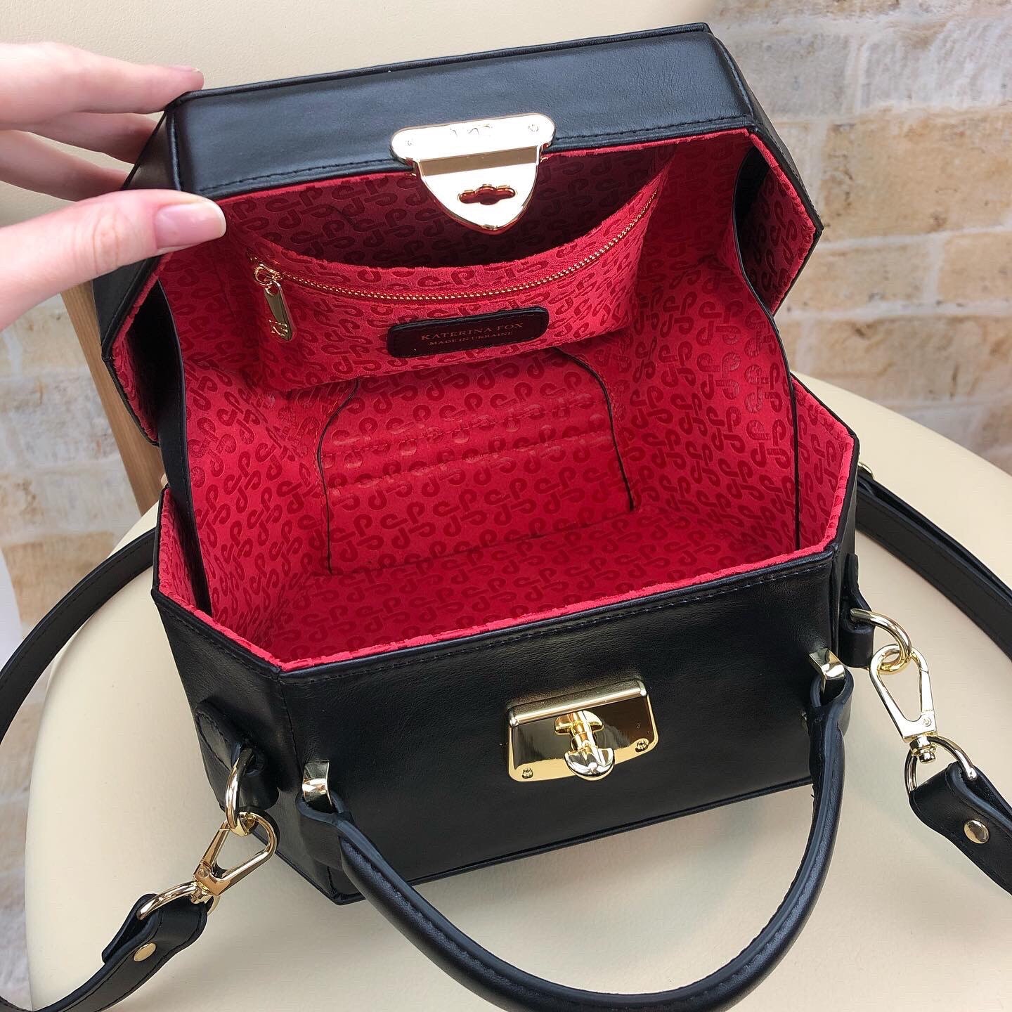 Black genuine leather boxbag from ukrainian designer Katerina Fox. This model is designed for women who appreciate the sleek design combined with functionality and comfort. High-quality and reliable hardware ensure long service bags. The internal space of a bag is equipped with one spacious compartment and two patch-pockets and one zipper pocket. The bag is closed with a clasp. The bottom of the bag is protected with metal legs. There is a long handle that allows you to wear the bag on the shoulder. The kit also includes a storage bag.