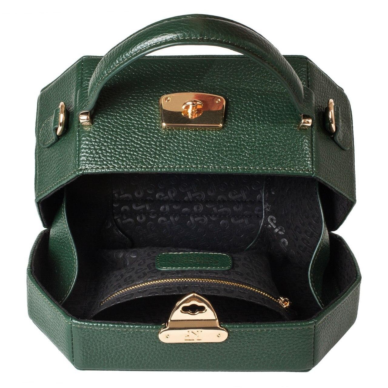 Dark green genuine leather boxbag from ukrainian designer Katerina Fox. This model is designed for women who appreciate the sleek design combined with functionality and comfort. High-quality and reliable hardware ensure long service bags. The internal space of a bag is equipped with one spacious compartment and two patch-pockets and one zipper pocket. The bag is closed with a clasp. The bottom of the bag is protected with metal legs. There is a long handle that allows you to wear the bag on the shoulder. The kit also includes a storage bag.