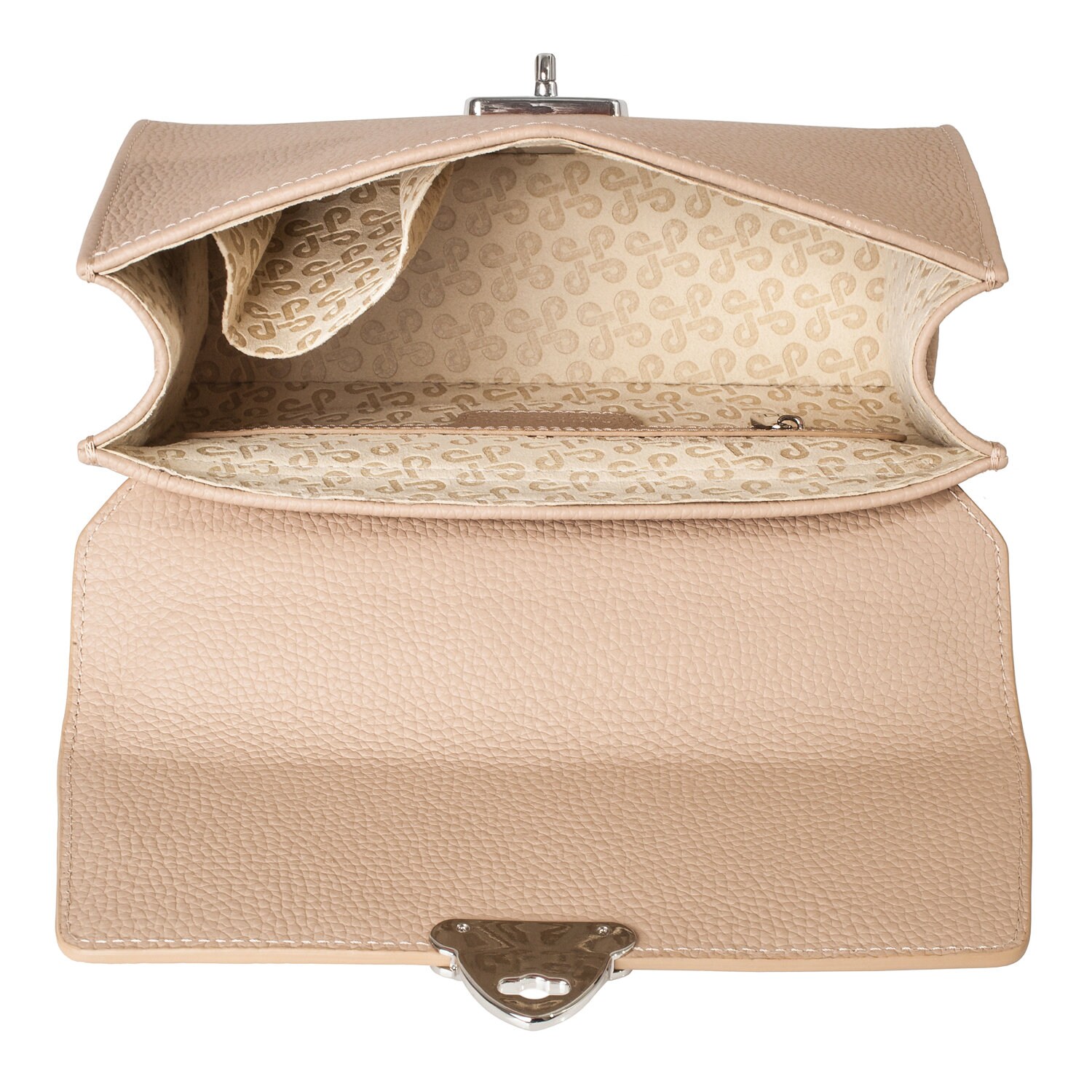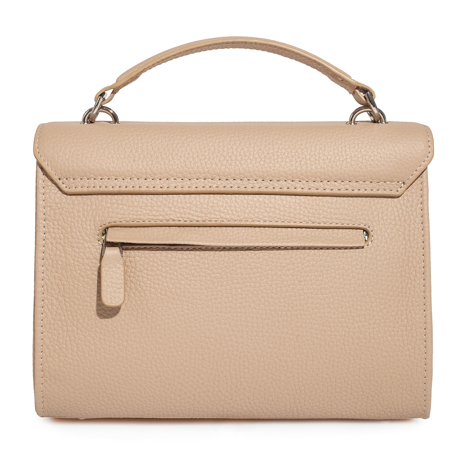 Beige genuine leather handbag from ukrainian designer Katerina Fox. The internal space of a bag is equipped with three spacious compartments and two patch-pockets and one zipper pocket. One of the spacious compartments is closed with a zipper. The bag is closed with a clasp. The bottom of the bag is protected with metal legs. There is a long handle that allows you to wear the bag on the shoulder. The kit also includes a storage bag.