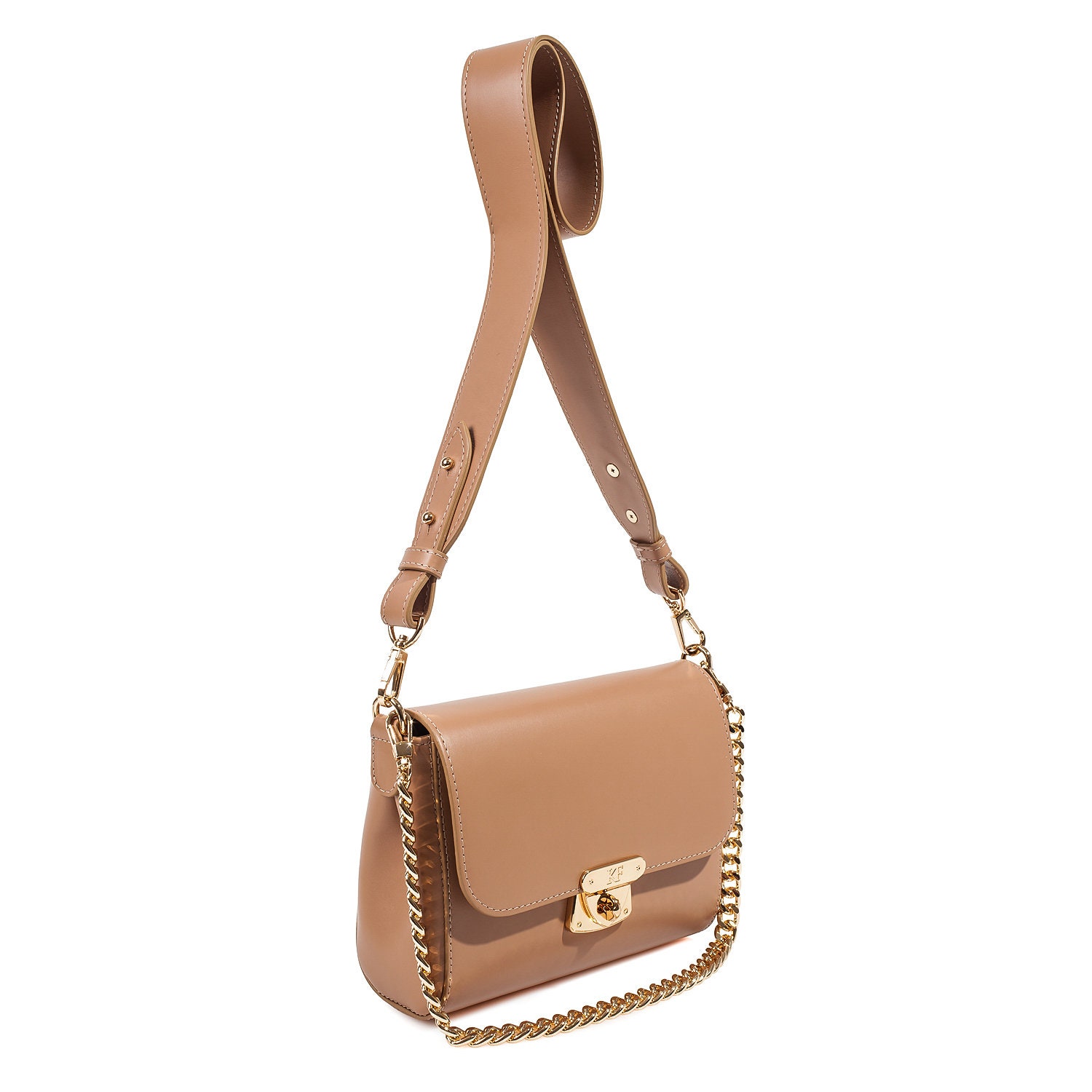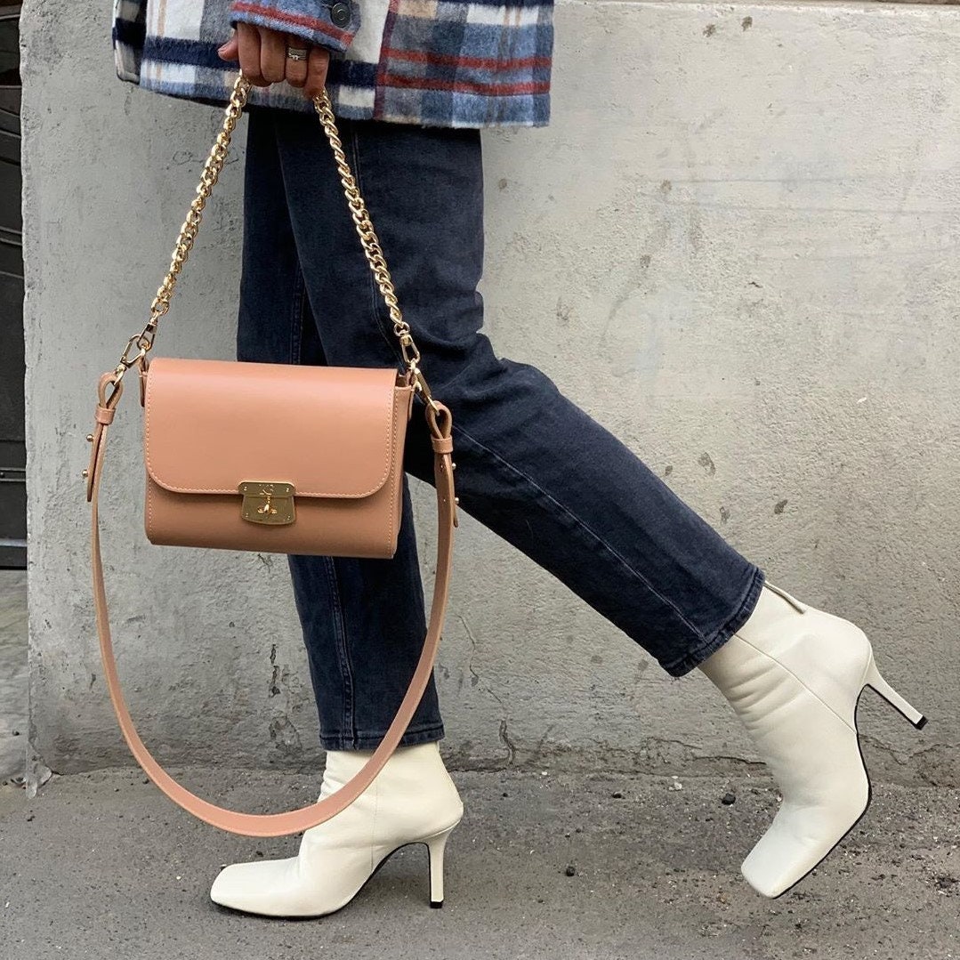 Beige genuine leather woman shoulder bag from ukrainian designer Katerina Fox. Fashionable and elegant modern bag KF for bright girls and women. This bag is able to attract attention and highlight your exquisite taste. Inside the bag is one large compartment and a convenient zippered pocket for small items, closes the bag on the clasp. The bag is comfortable to wear on the shoulder or across the shoulder.