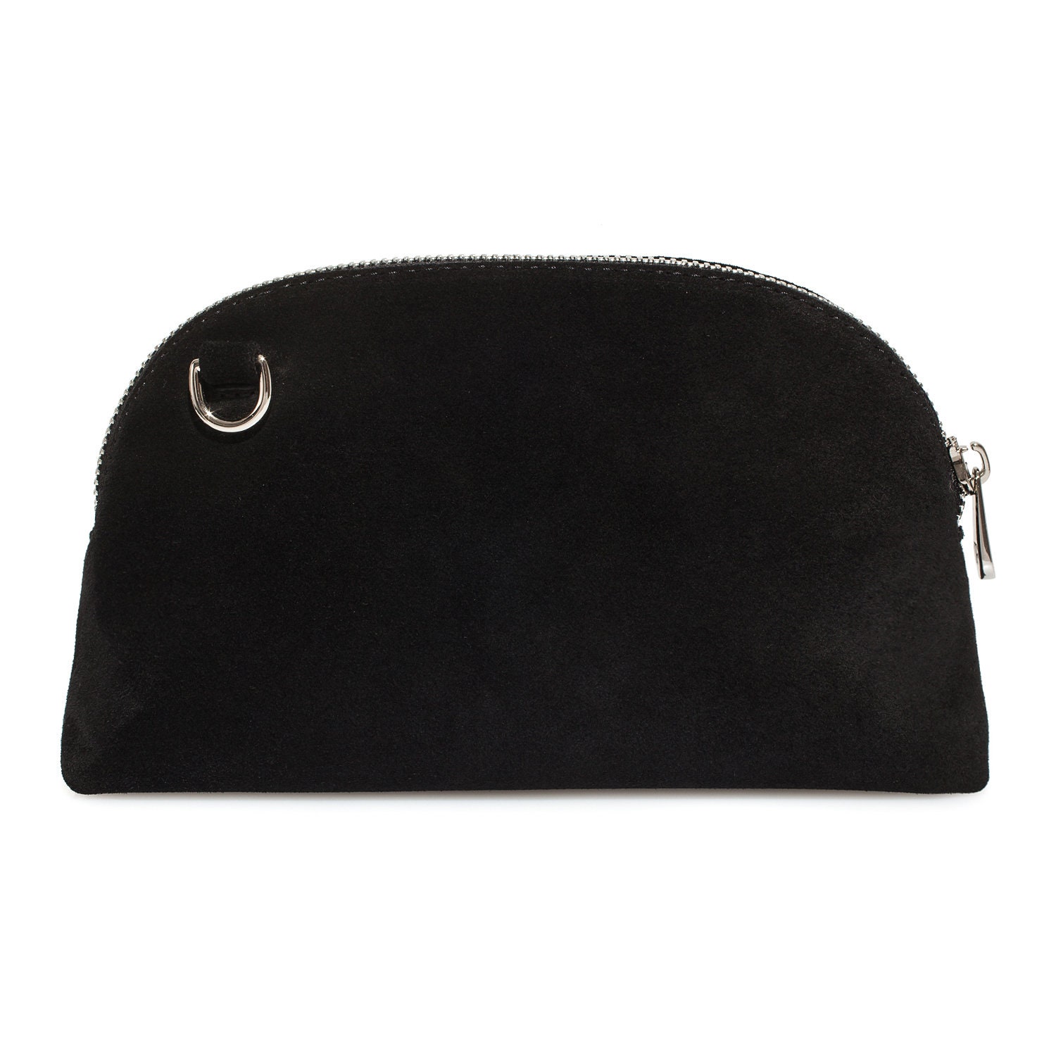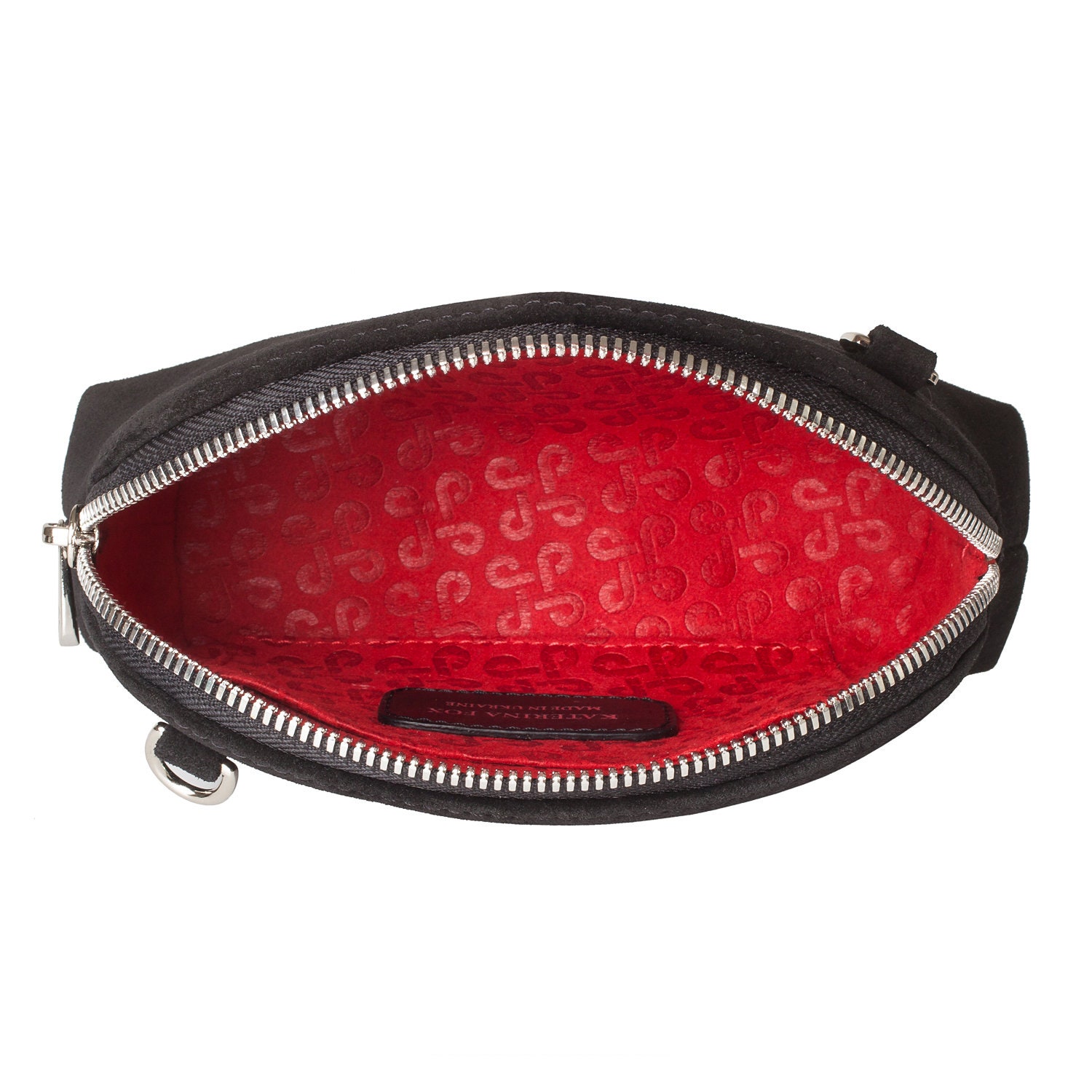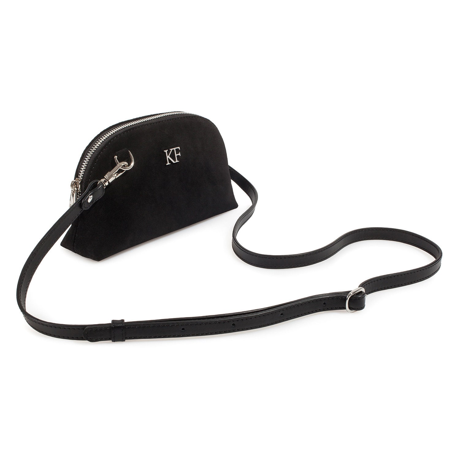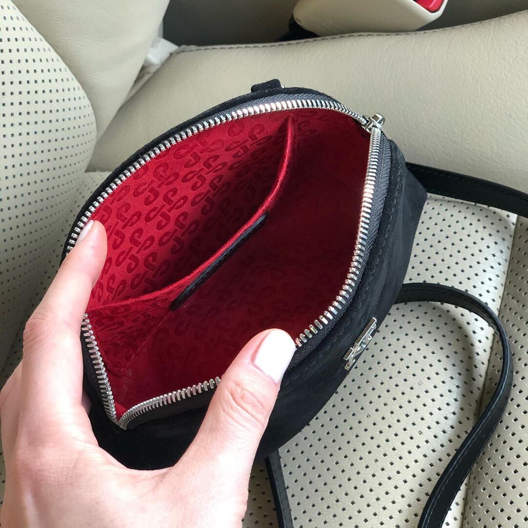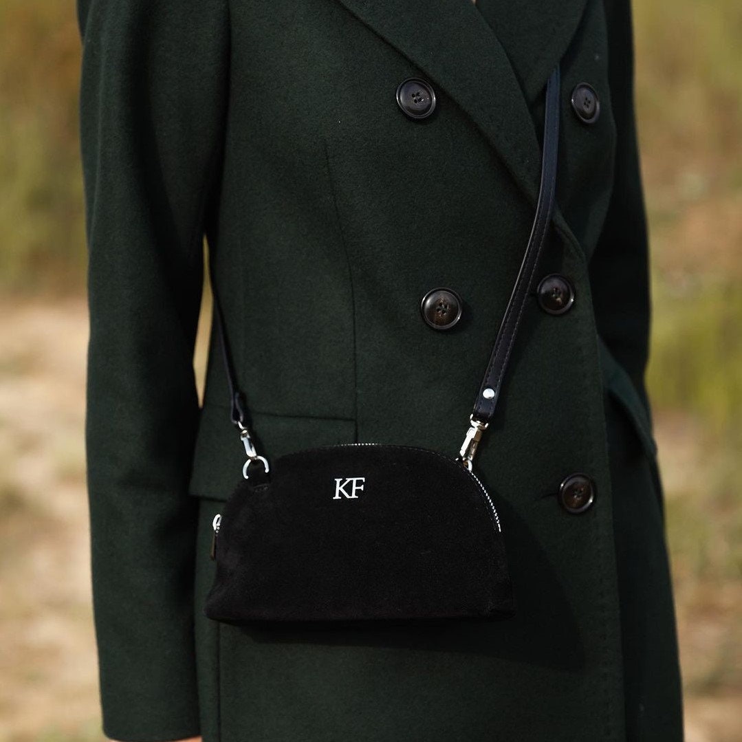 Black genuine suede leather woman crossbody bag from ukrainian designer Katerina Fox. Fashionable and elegant modern bag KF for bright girls and women. This bag is able to attract attention and highlight your exquisite taste. The internal space of a cosmetic bag is equipped with one spacious compartment and one patch-pocket. The bag is closed with a zipper. The kit also includes a storage bag. The kit also includes a storage bag.