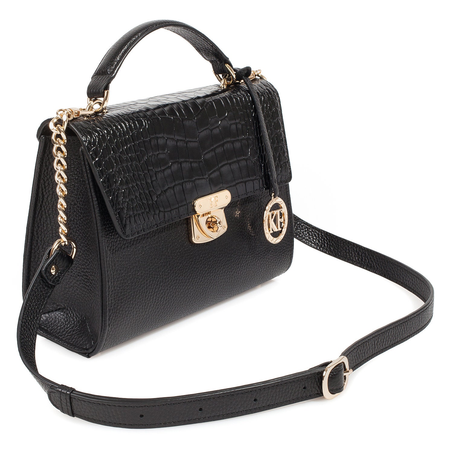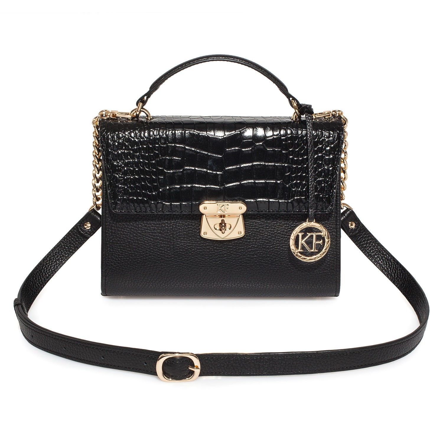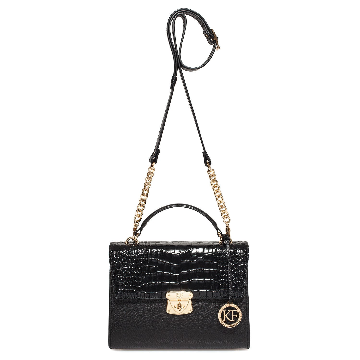 Black genuine leather handbag from ukrainian designer Katerina Fox. The internal space of a bag is equipped with three spacious compartments and two patch-pockets and one zipper pocket. One of the spacious compartments is closed with a zipper. The bag is closed with a clasp. The bottom of the bag is protected with metal legs. There is a long handle that allows you to wear the bag on the shoulder. The kit also includes a storage bag.