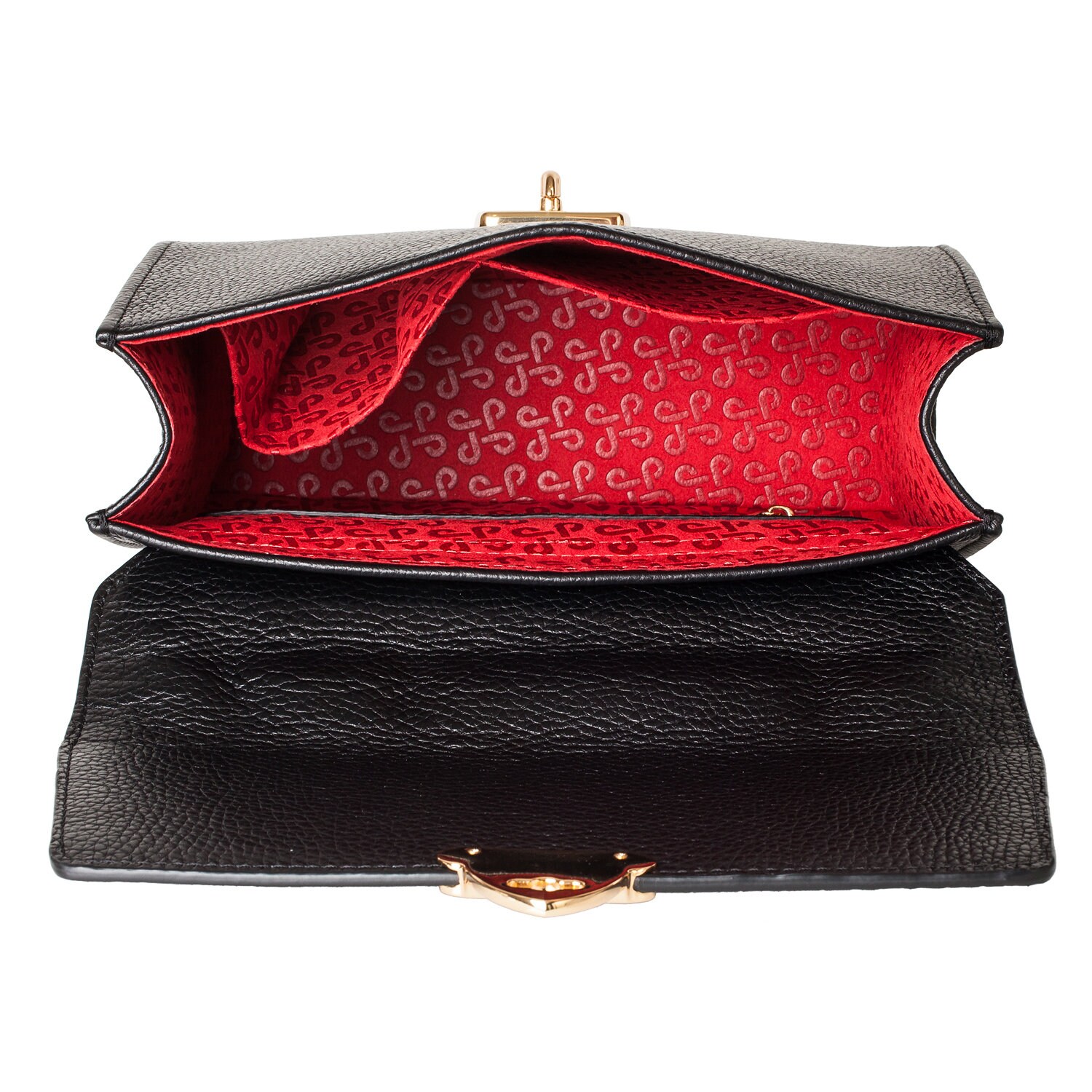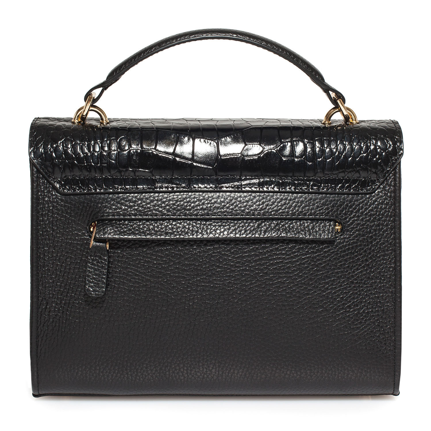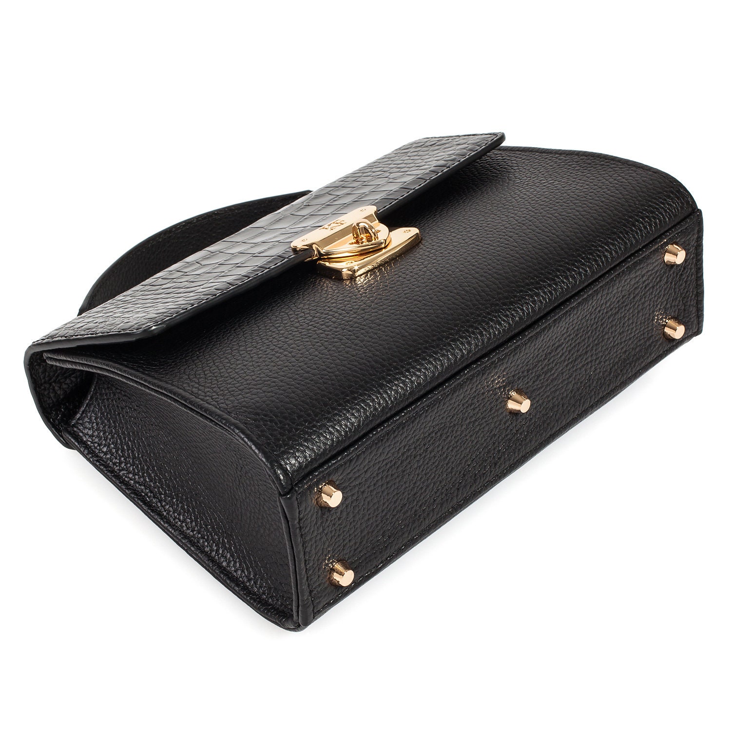 Black genuine leather handbag from ukrainian designer Katerina Fox. The internal space of a bag is equipped with three spacious compartments and two patch-pockets and one zipper pocket. One of the spacious compartments is closed with a zipper. The bag is closed with a clasp. The bottom of the bag is protected with metal legs. There is a long handle that allows you to wear the bag on the shoulder. The kit also includes a storage bag.
