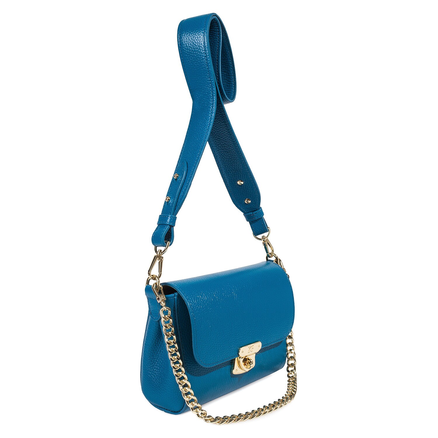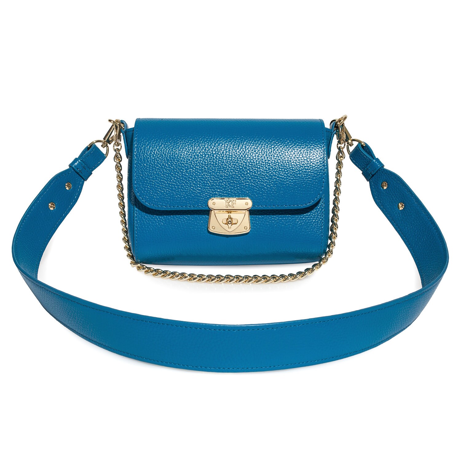 Blue genuine leather woman shoulder bag from ukrainian designer Katerina Fox. Fashionable and elegant modern bag KF for bright girls and women. This bag is able to attract attention and highlight your exquisite taste. Inside the bag is one large compartment and a convenient zippered pocket for small items, closes the bag on the clasp. The bag is comfortable to wear on the shoulder or across the shoulder.