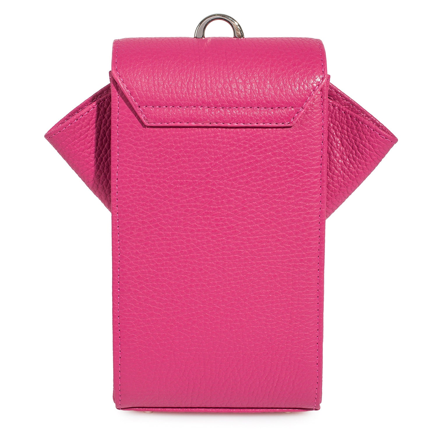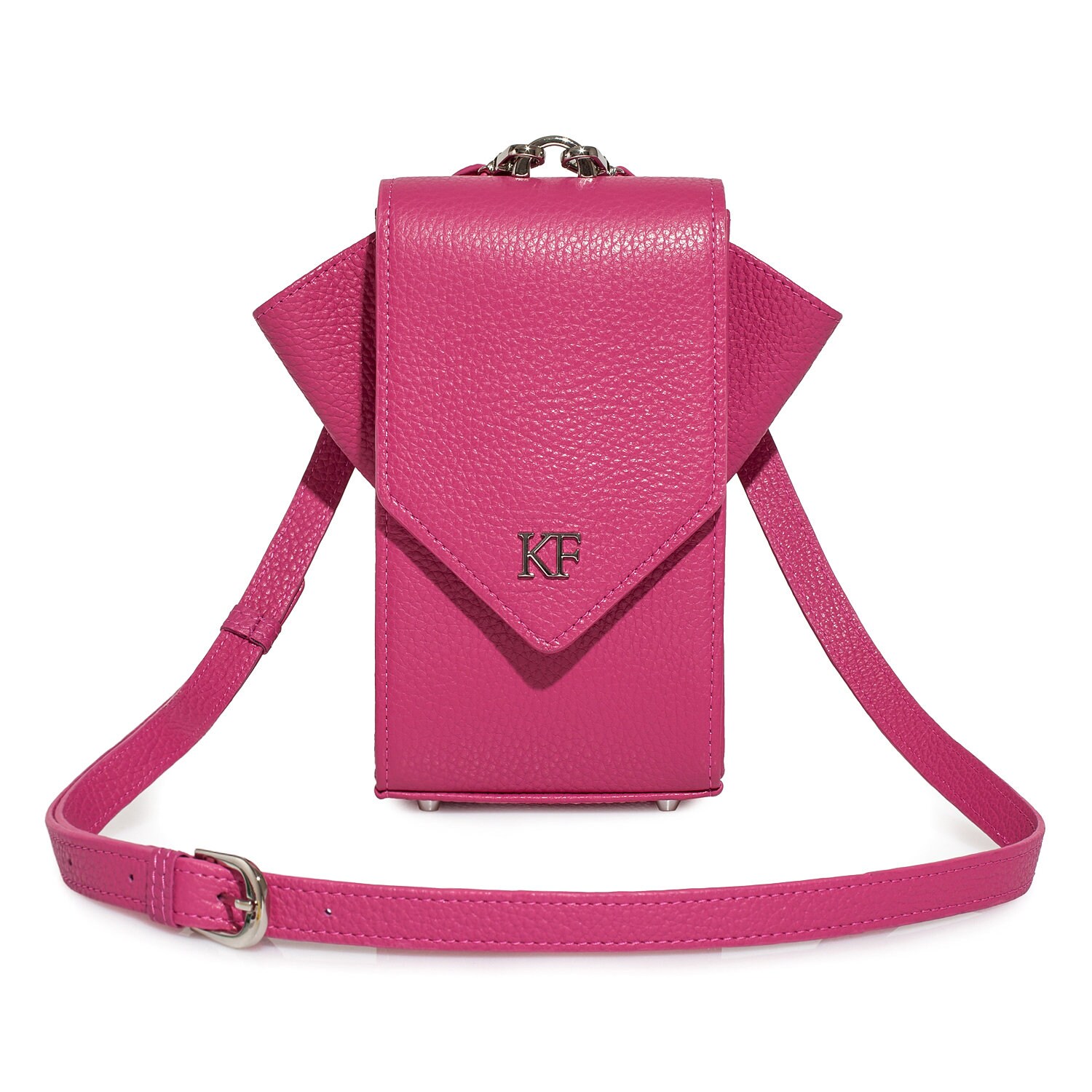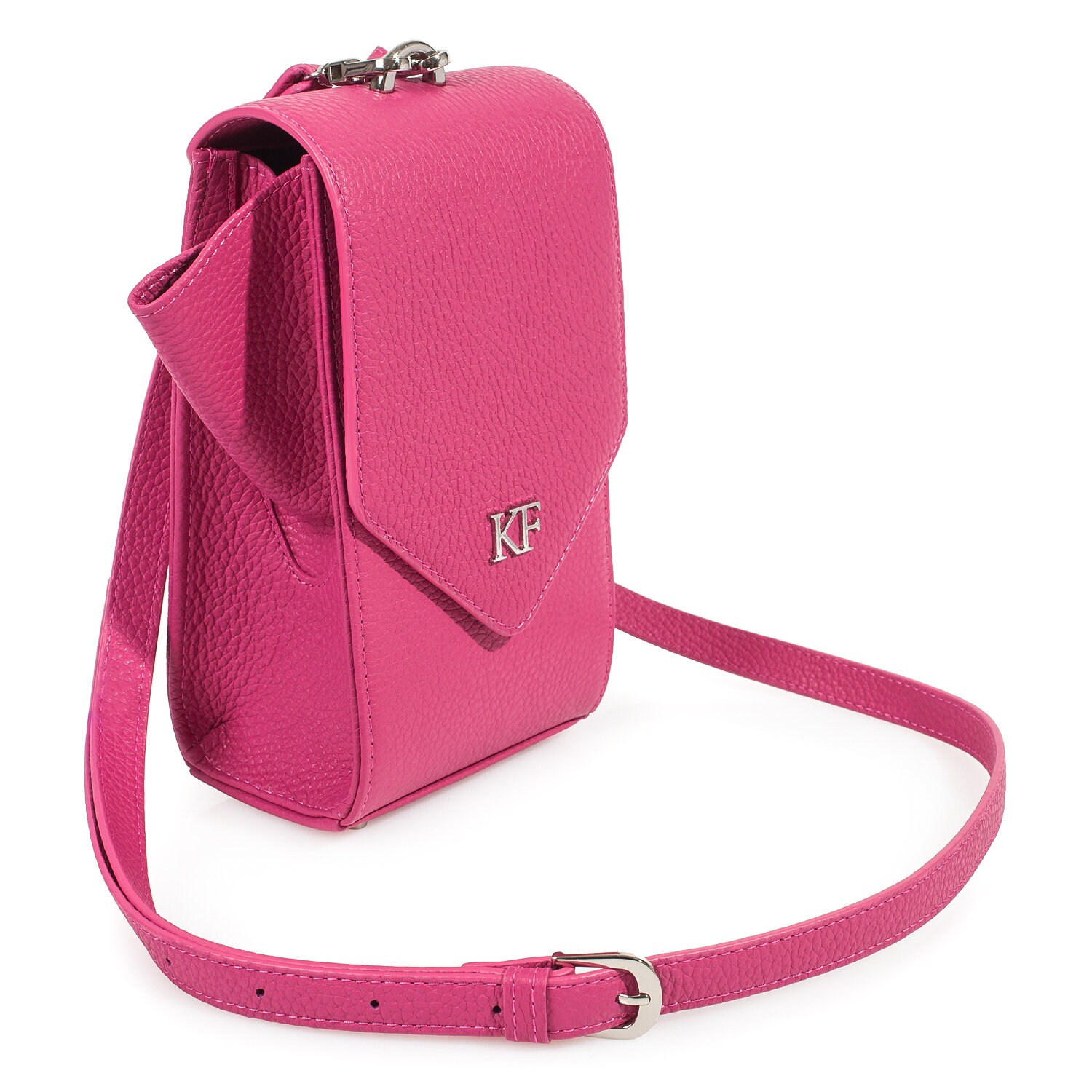Fuchsia genuine leather woman crossbody bag from ukrainian designer Katerina Fox. Fashionable and elegant modern bag KF for bright girls and women. This bag is able to attract attention and highlight your exquisite taste. All accessories for Katerina Fox bags makes the same factory as for Michael §¬ors, Calvin Klein, DKNY and other famous brands.The internal space of a bag is equipped with one spacious compartment, four patch pockets for cards. The bag is closed on the button-magnet. The bag has a short removable handle on wrist.The length of the strap is adjustable. The kit also includes a storage bag.