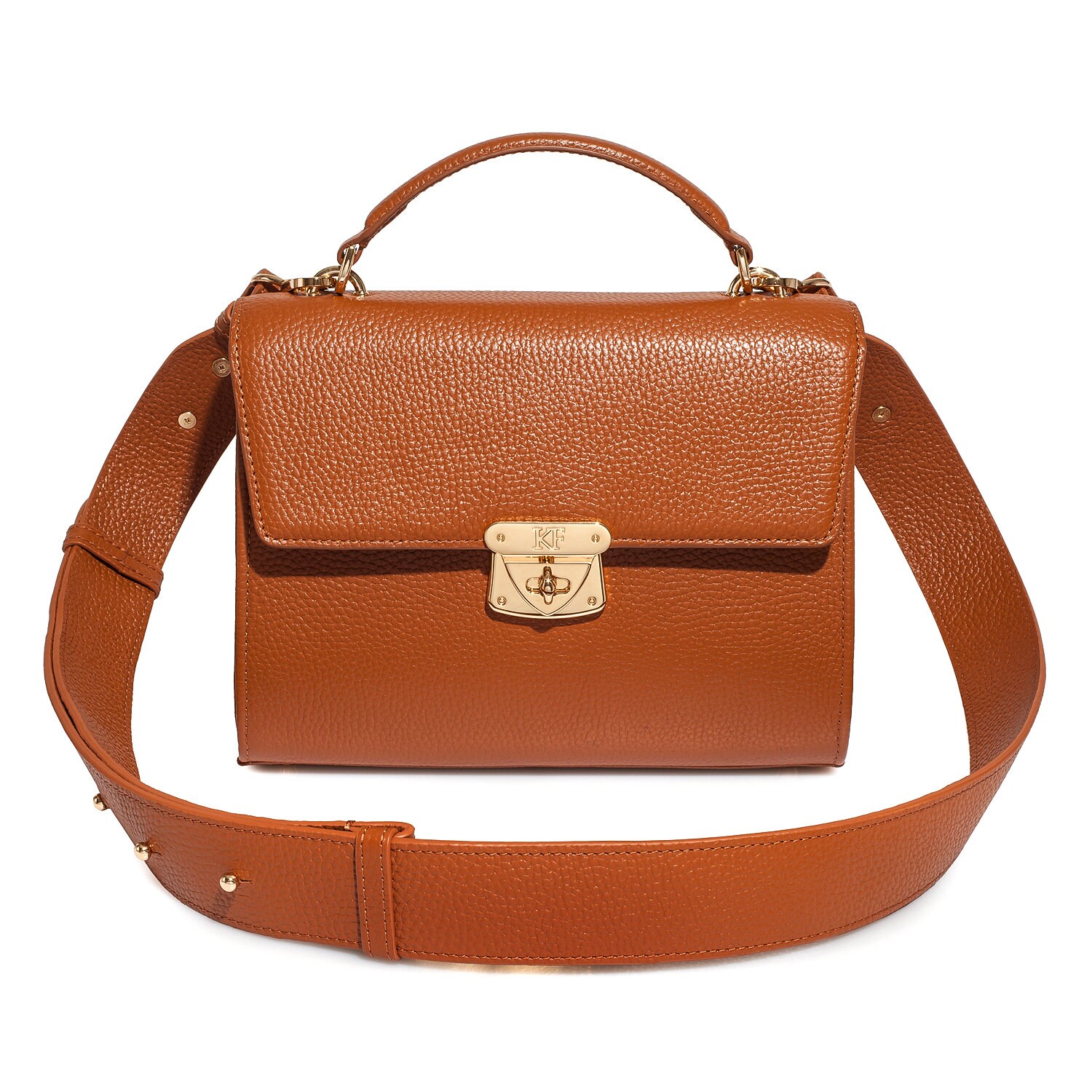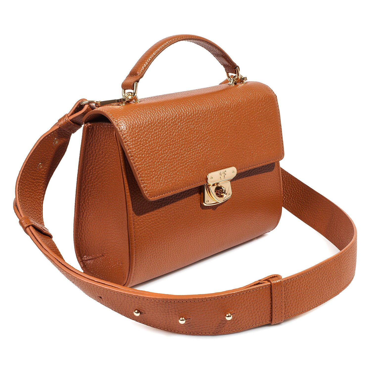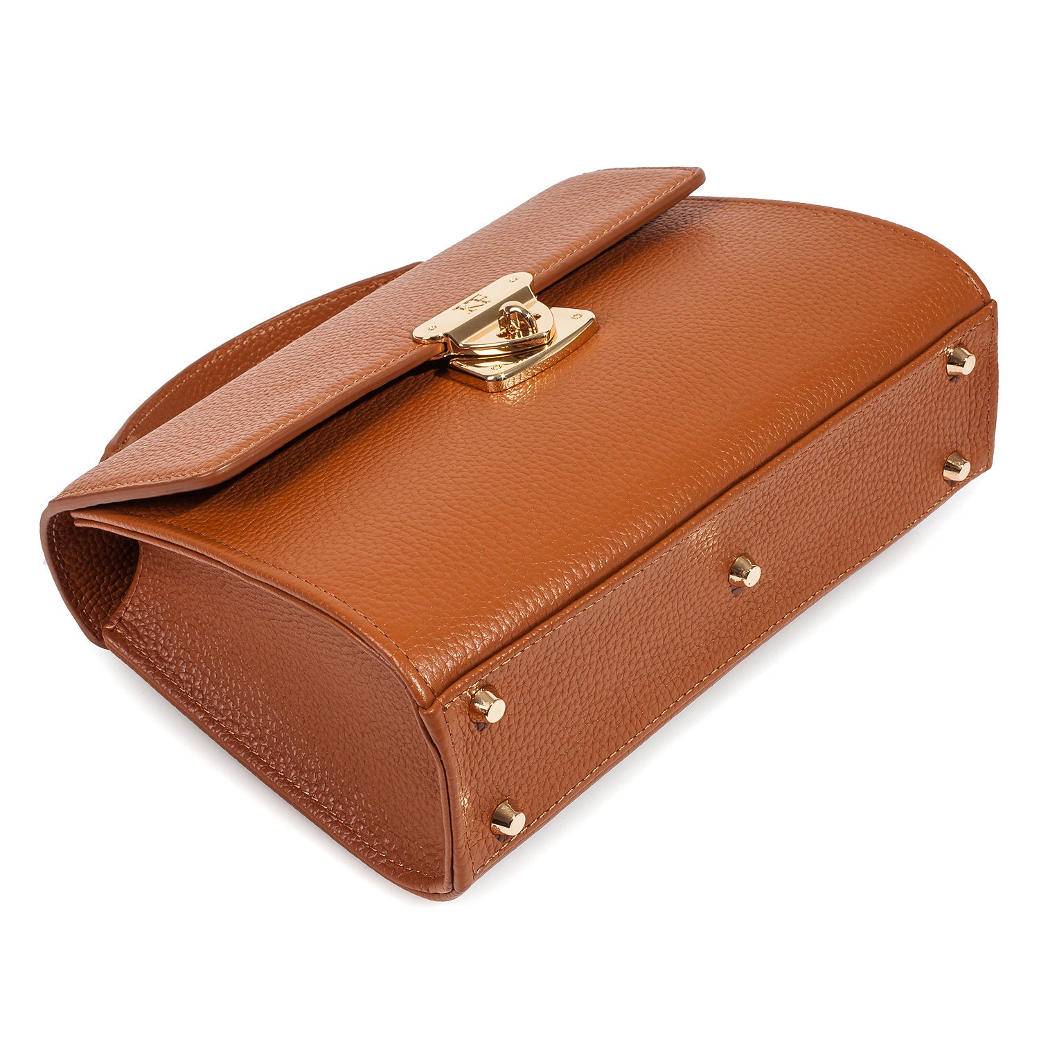 Ginger genuine leather handbag from ukrainian designer Katerina Fox. The internal space of a bag is equipped with three spacious compartments and two patch-pockets and one zipper pocket. One of the spacious compartments is closed with a zipper. The bag is closed with a clasp. The bottom of the bag is protected with metal legs. There is a long handle that allows you to wear the bag on the shoulder. The kit also includes a storage bag.