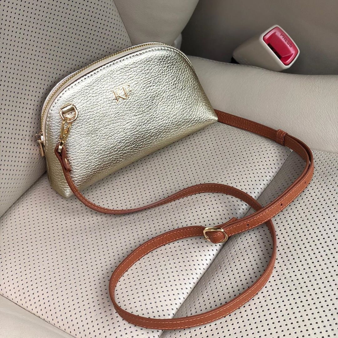 Gold genuine leather woman crossbody bag from ukrainian designer Katerina Fox. Fashionable and elegant modern bag KF for bright girls and women. This bag is able to attract attention and highlight your exquisite taste. The internal space of a cosmetic bag is equipped with one spacious compartment and one patch-pocket. The bag is closed with a zipper. The kit also includes a storage bag. The kit also includes a storage bag.