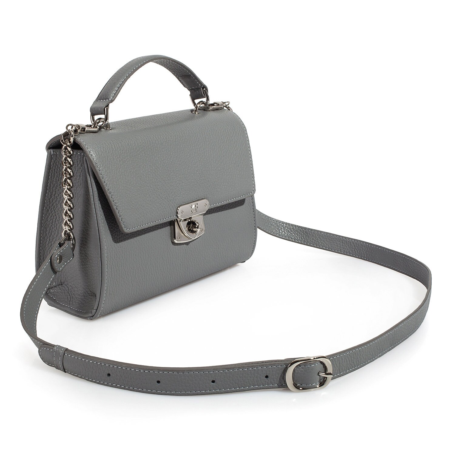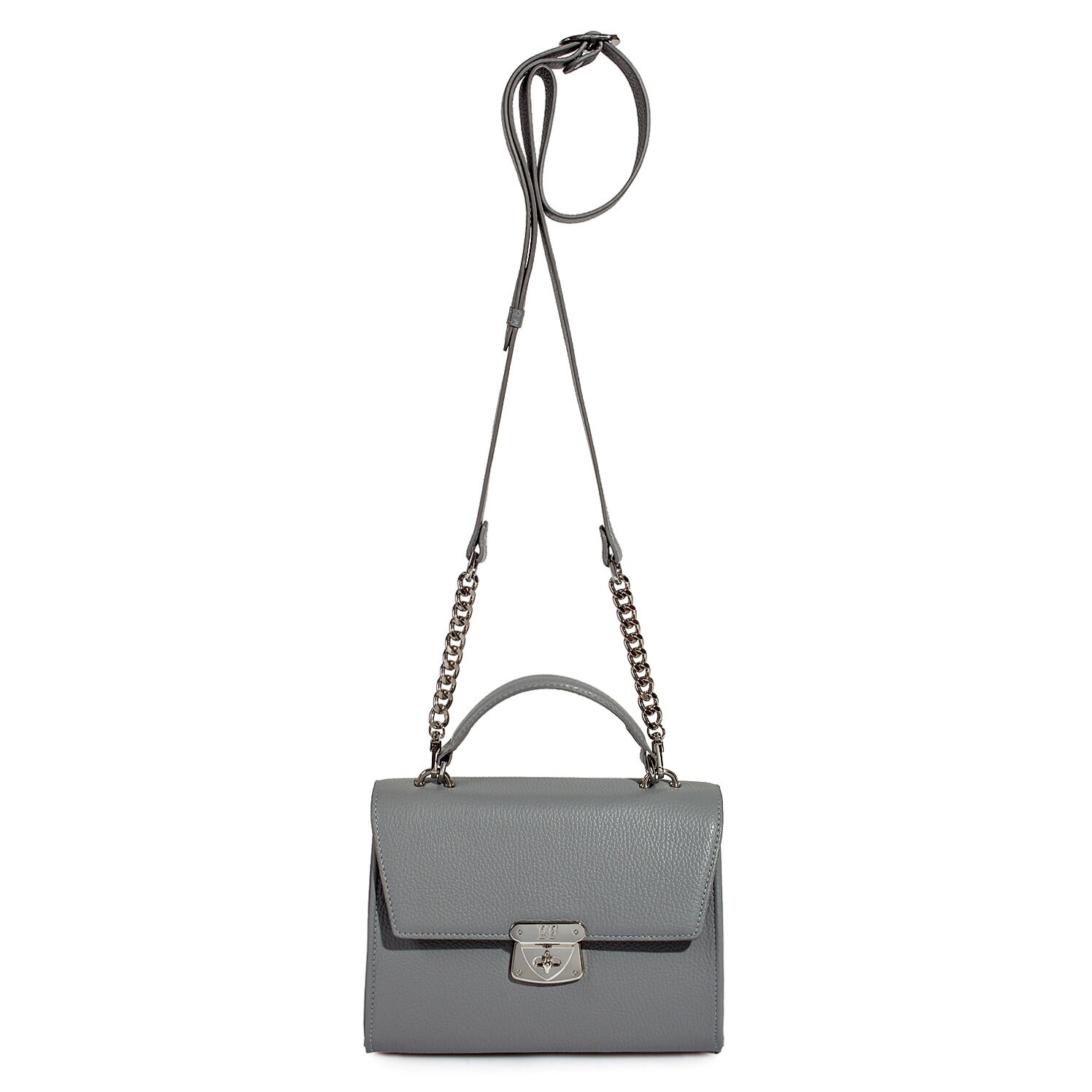 Gray genuine leather handbag from ukrainian designer Katerina Fox. The internal space of a bag is equipped with three spacious compartments and two patch-pockets and one zipper pocket. One of the spacious compartments is closed with a zipper. The bag is closed with a clasp. The bottom of the bag is protected with metal legs. There is a long handle that allows you to wear the bag on the shoulder. The kit also includes a storage bag.