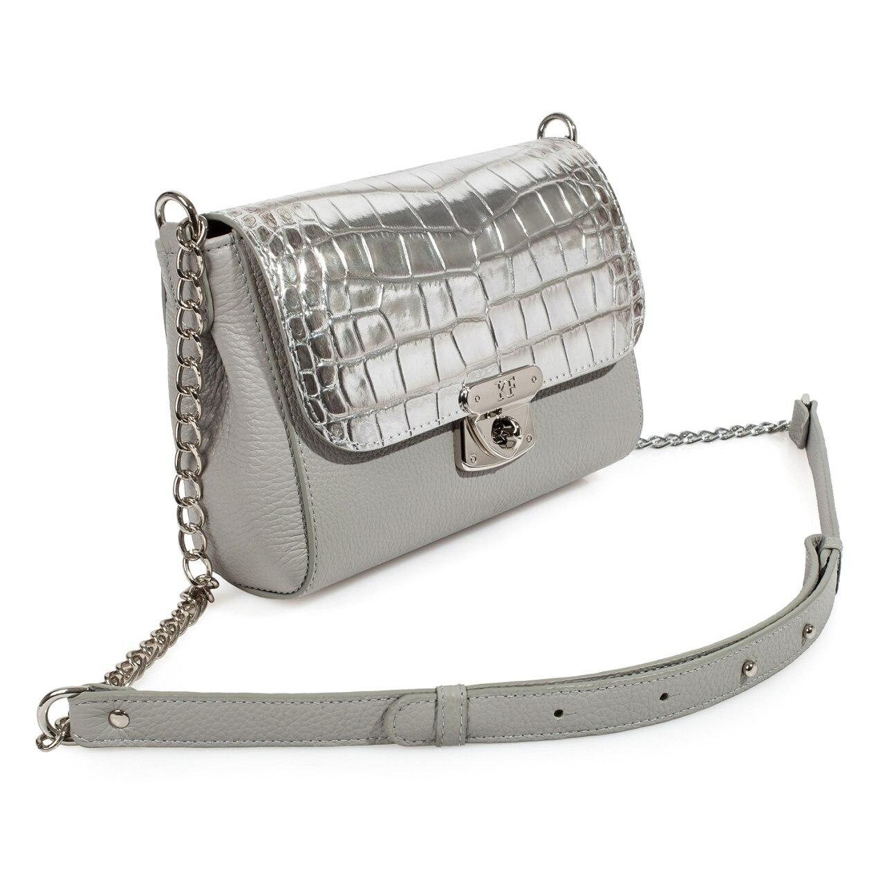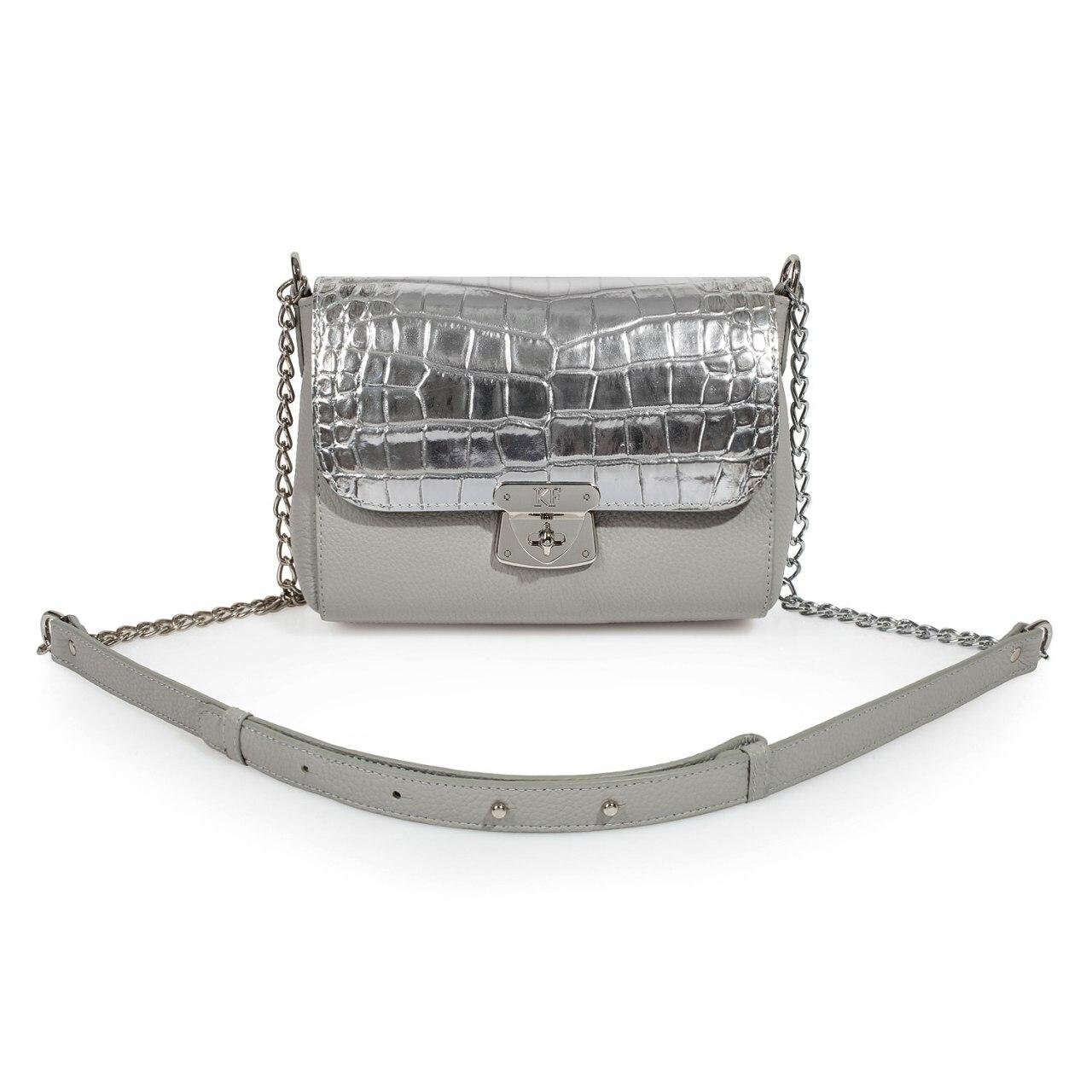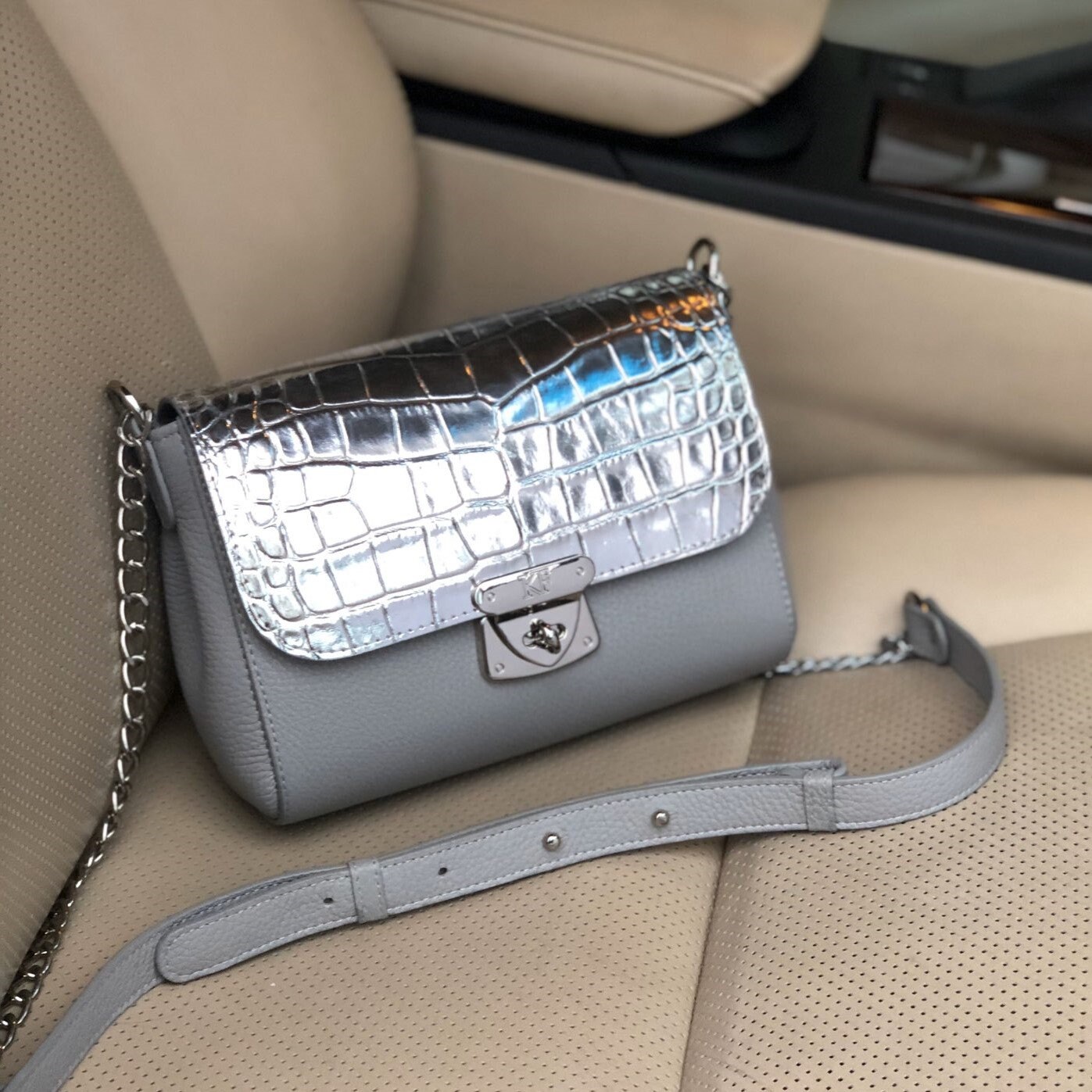 Grey genuine leather woman shoulder bag from ukrainian designer Katerina Fox. Fashionable and elegant modern bag KF for bright girls and women. This bag is able to attract attention and highlight your exquisite taste. Inside the bag is one large compartment and a convenient zippered pocket for small items, closes the bag on the clasp. The bag is comfortable to wear on the shoulder or across the shoulder.