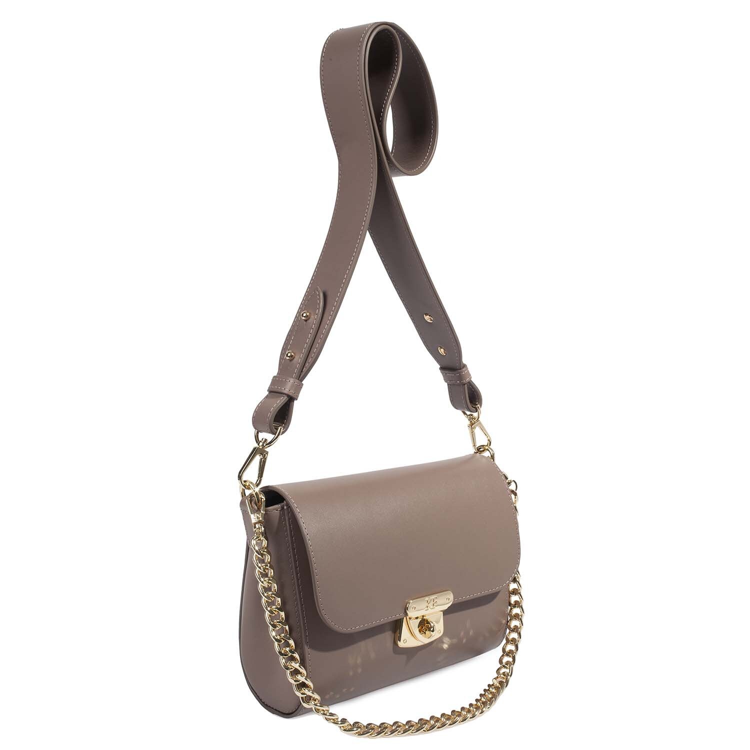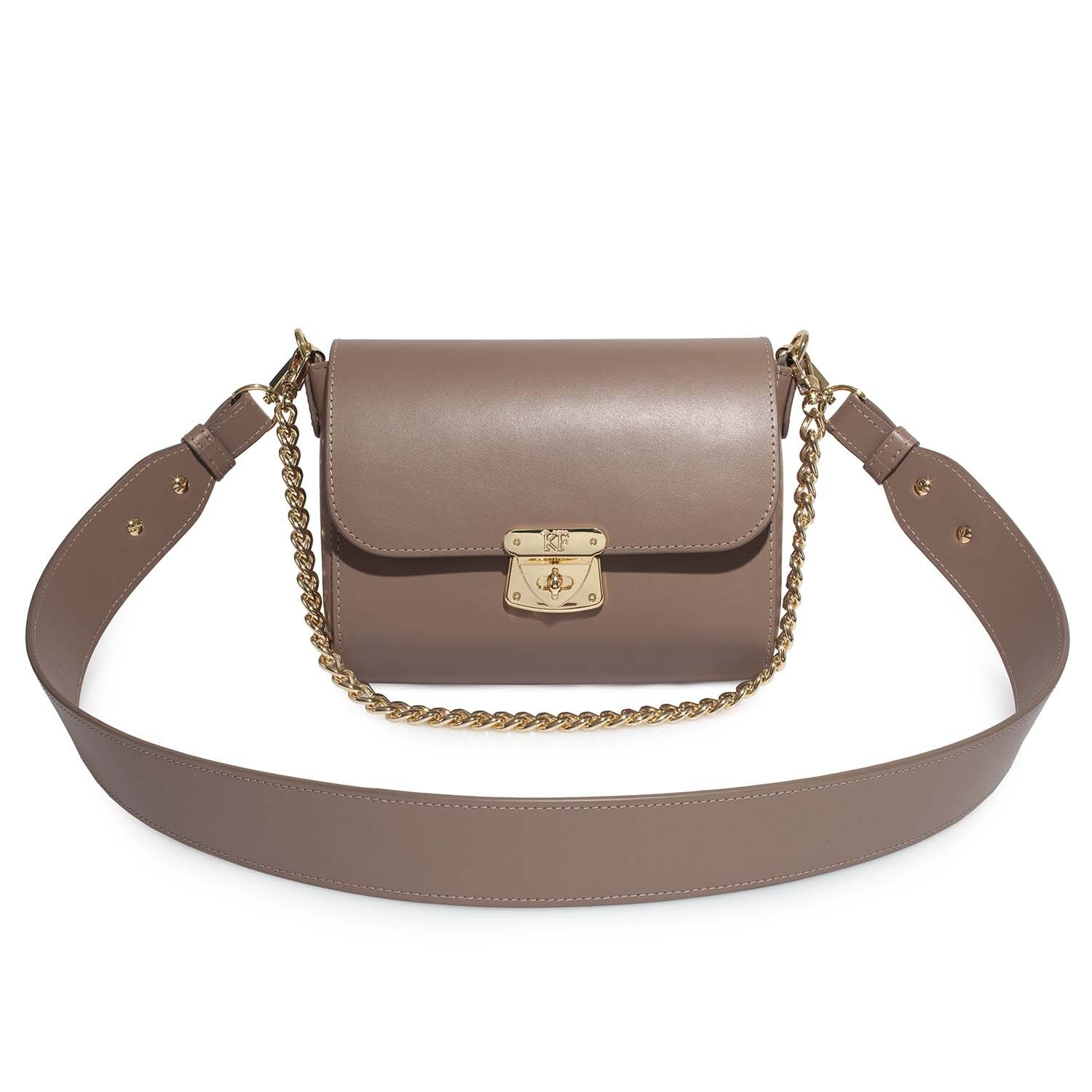 Taupe genuine leather woman shoulder bag from ukrainian designer Katerina Fox. Fashionable and elegant modern bag KF for bright girls and women. This bag is able to attract attention and highlight your exquisite taste. Inside the bag is one large compartment and a convenient zippered pocket for small items, closes the bag on the clasp. The bag is comfortable to wear on the shoulder or across the shoulder.