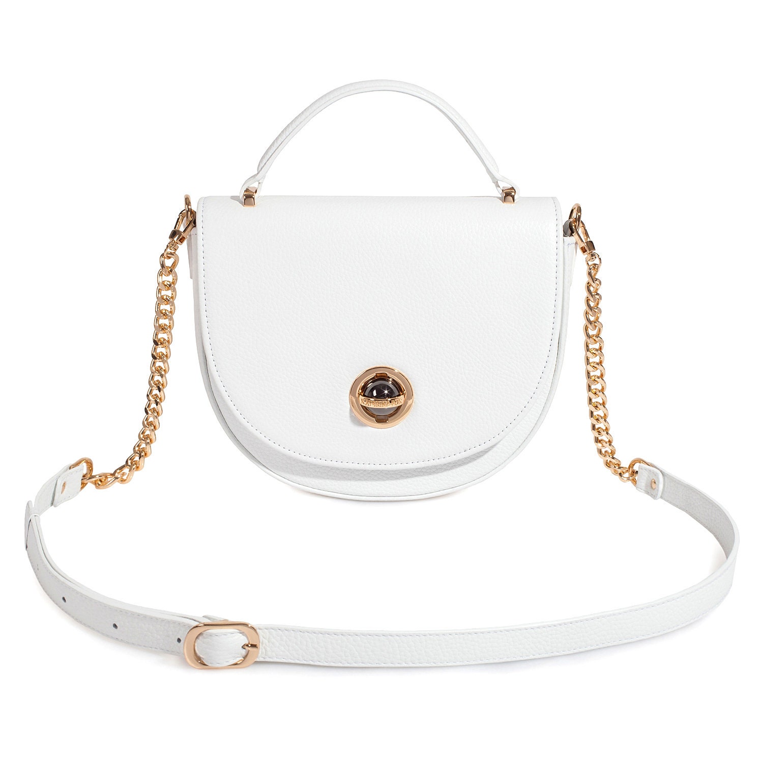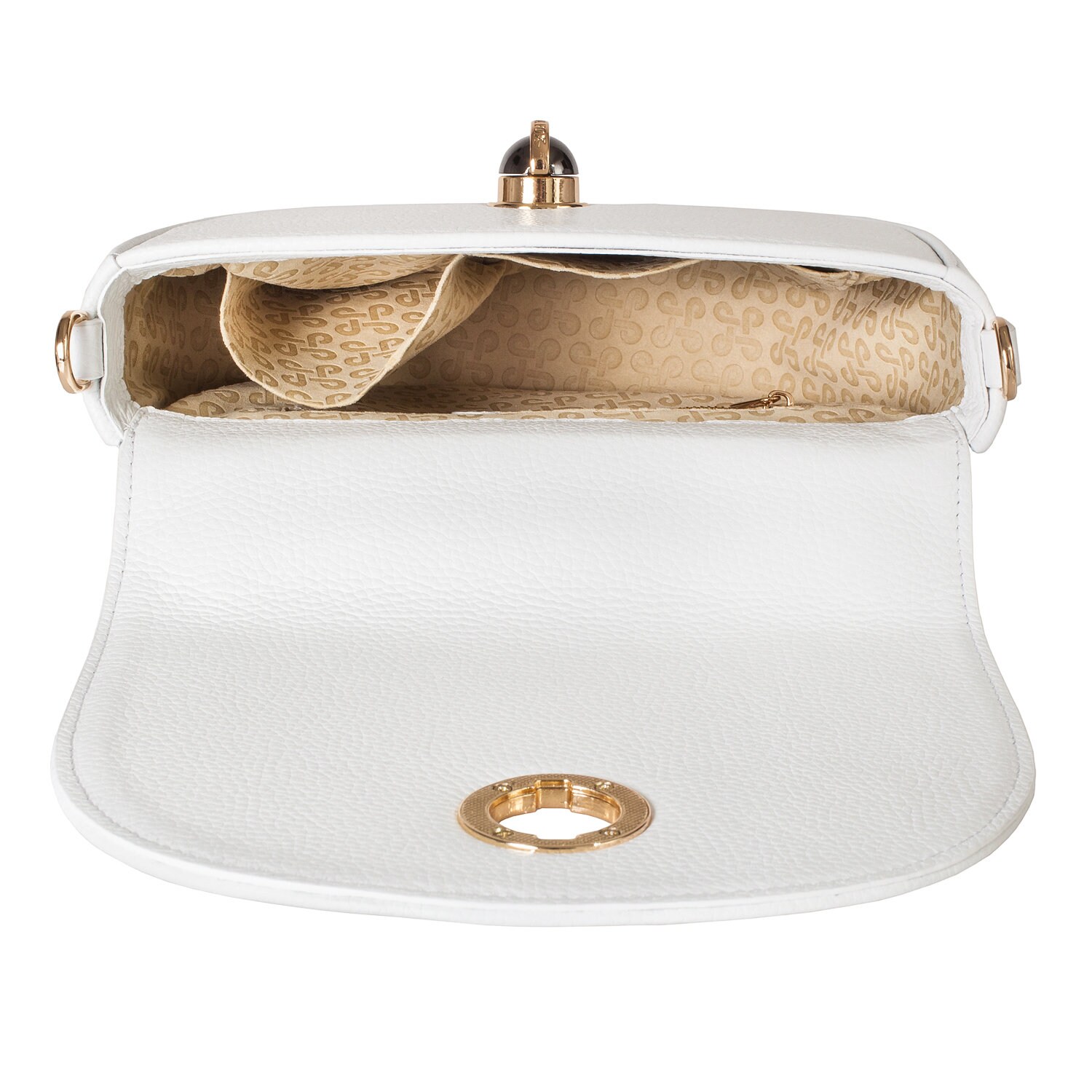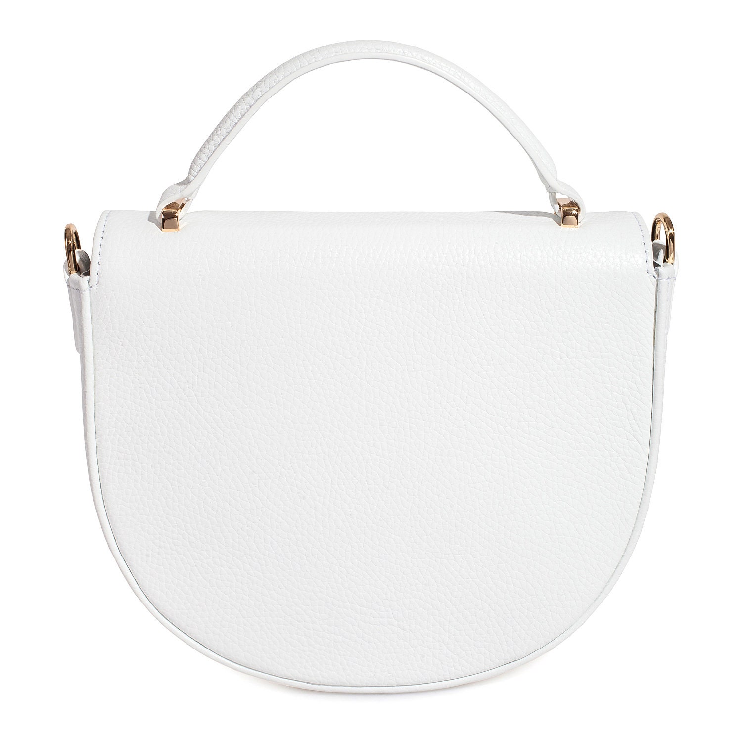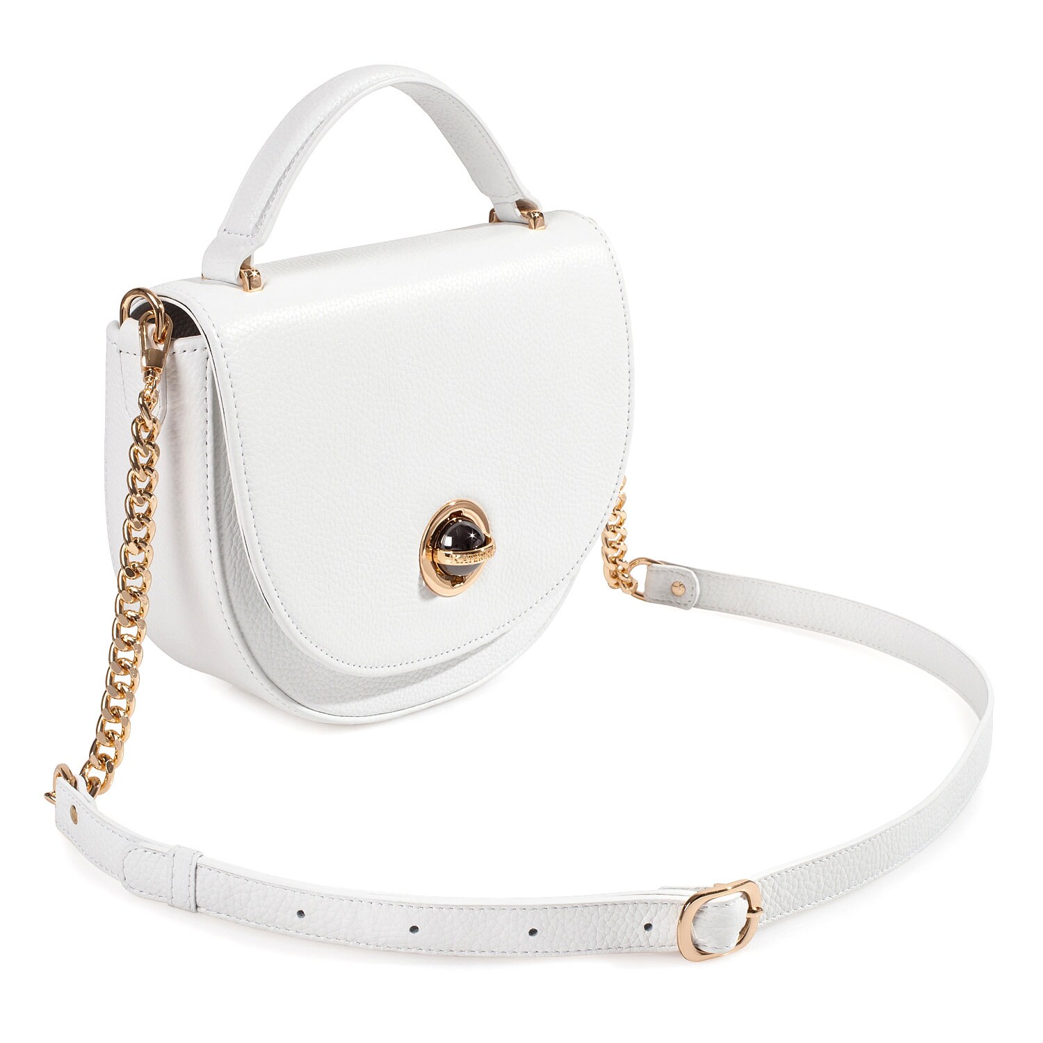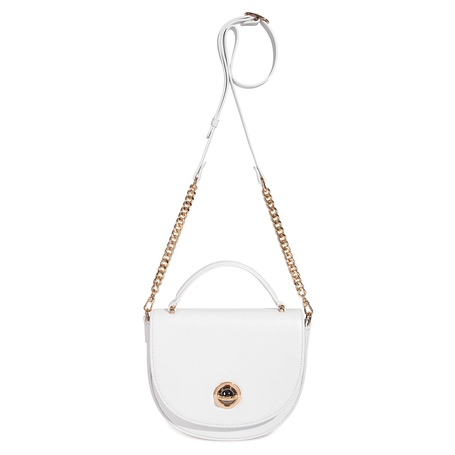 White genuine leather woman shoulder bag from ukrainian designer Katerina Fox. Fashionable and elegant modern bag KF for bright girls and women. This bag is able to attract attention and highlight your exquisite taste. Inside the bag is one large compartment and a convenient zippered pocket for small items, closes the bag on the clasp. The bag is comfortable to wear on the shoulder or across the shoulder.