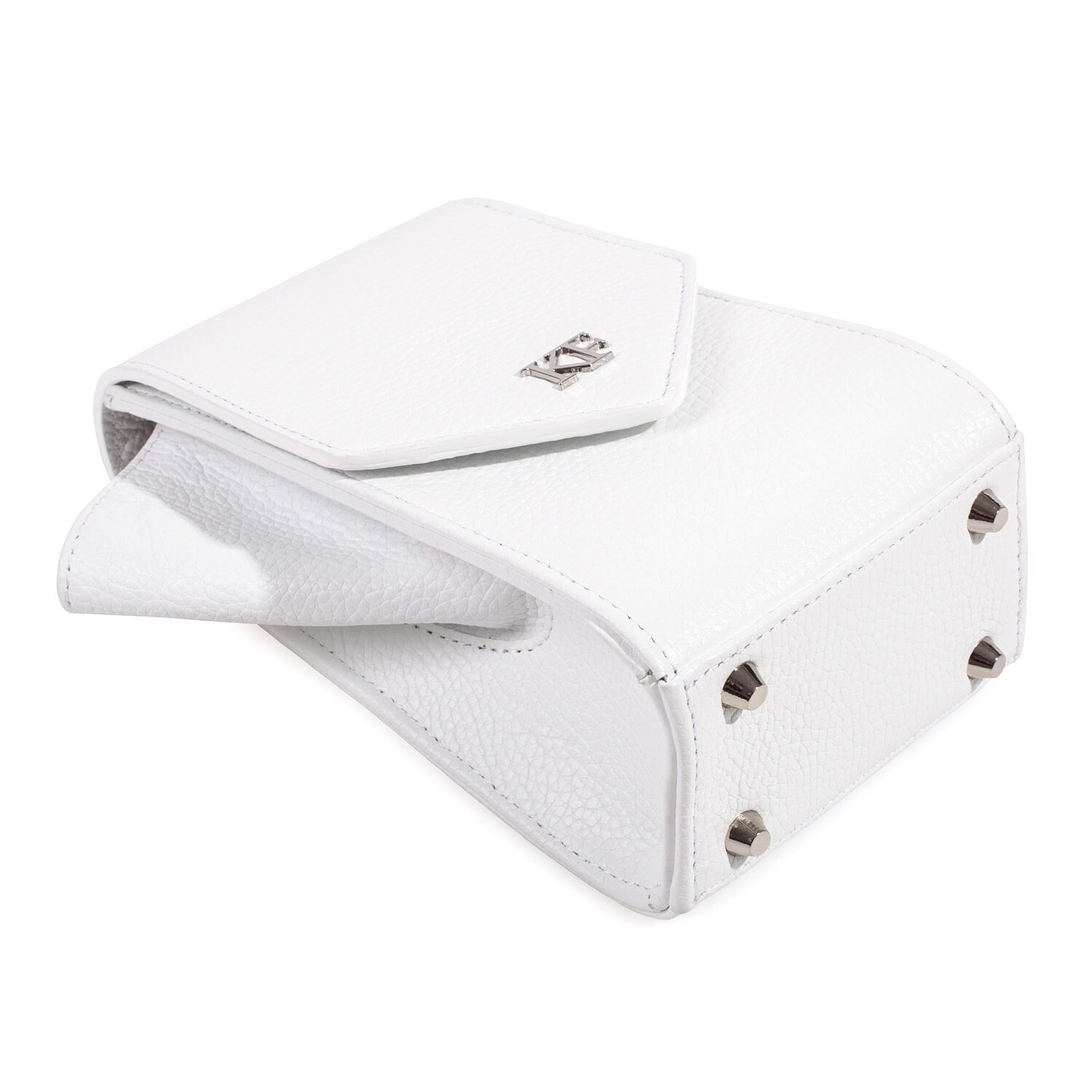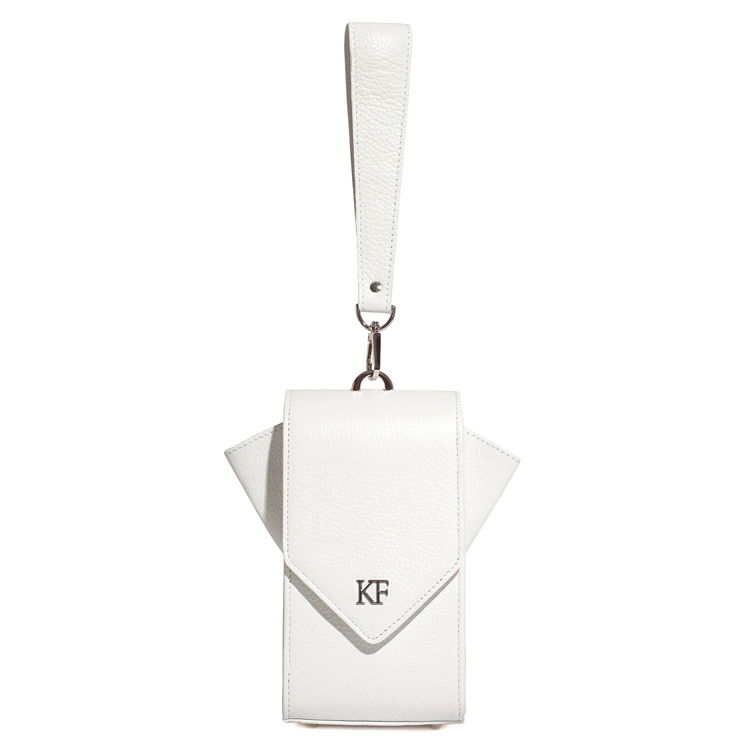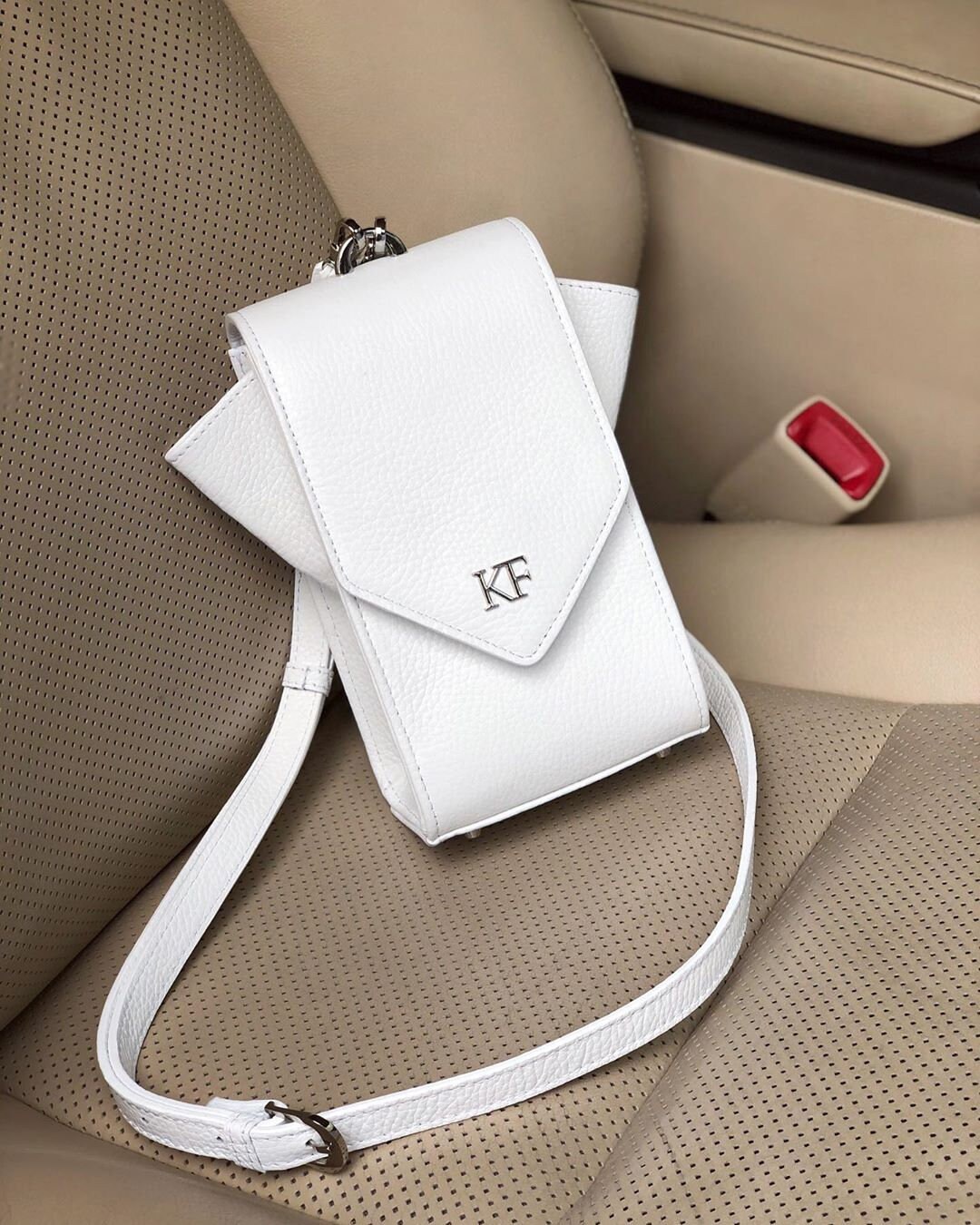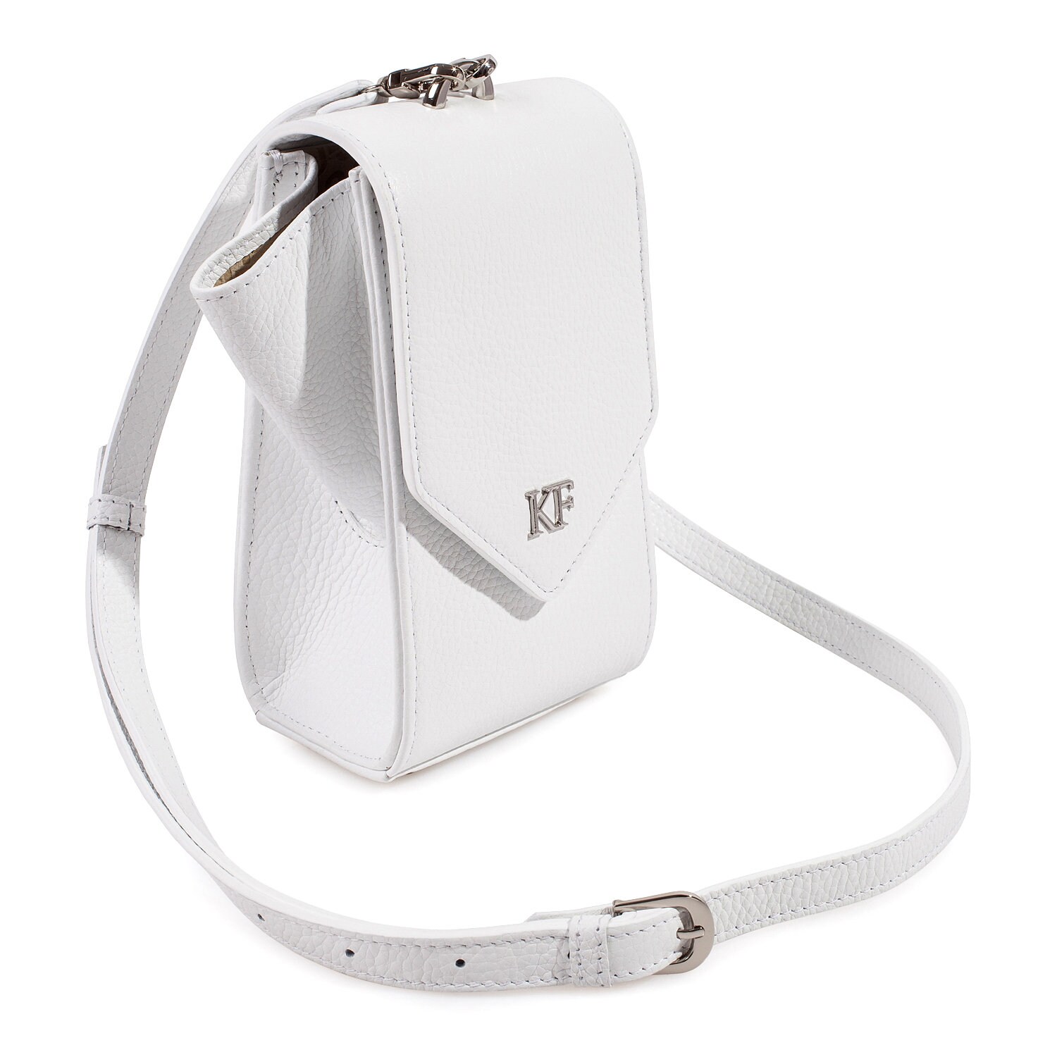 White genuine leather woman crossbody bag from ukrainian designer Katerina Fox. Fashionable and elegant modern bag KF for bright girls and women. This bag is able to attract attention and highlight your exquisite taste. All accessories for Katerina Fox bags makes the same factory as for Michael §¬ors, Calvin Klein, DKNY and other famous brands.The internal space of a bag is equipped with one spacious compartment, four patch pockets for cards. The bag is closed on the button-magnet. The bag has a short removable handle on wrist.The length of the strap is adjustable. The kit also includes a storage bag.