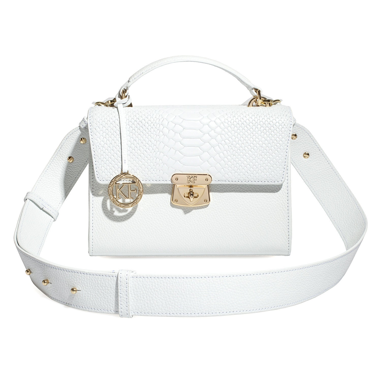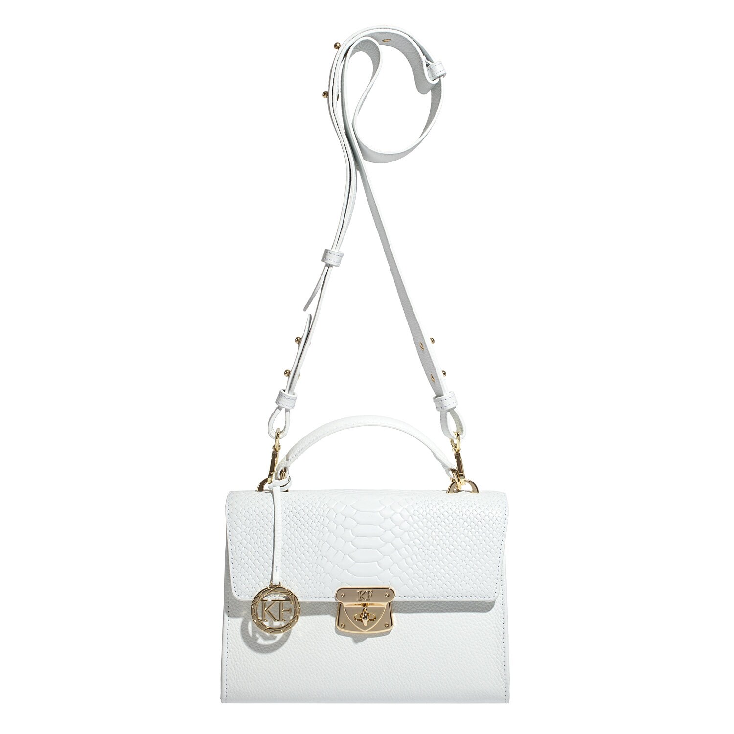 White genuine leather handbag from Ukrainian designer Katerina Fox. The internal space of a bag is equipped with three spacious compartments and two patch-pockets and one zipper pocket. One of the spacious compartments is closed with a zipper. The bag is closed with a clasp. The bottom of the bag is protected with metal legs. There is a long handle that allows you to wear the bag on the shoulder. The kit also includes a storage bag.