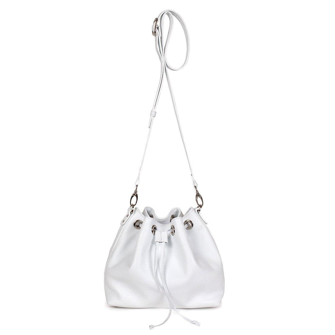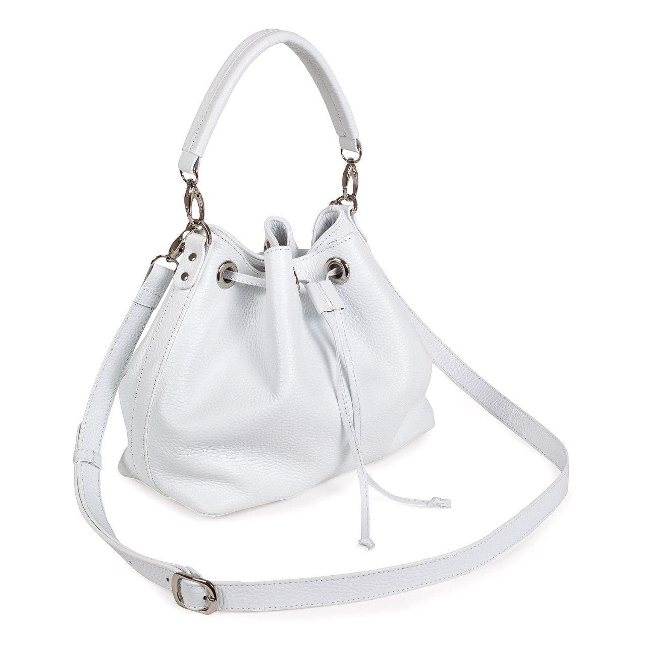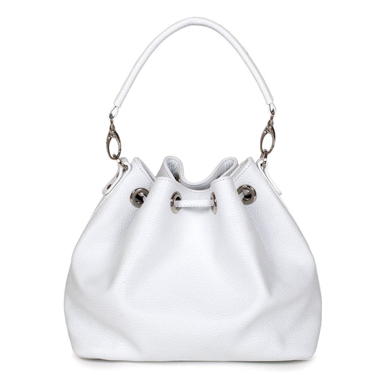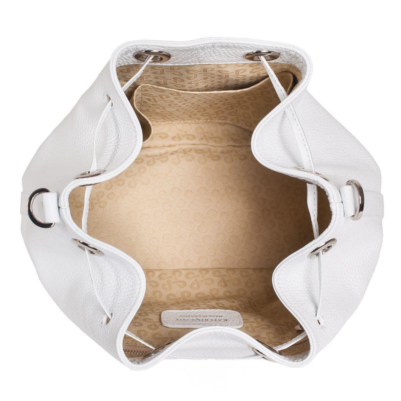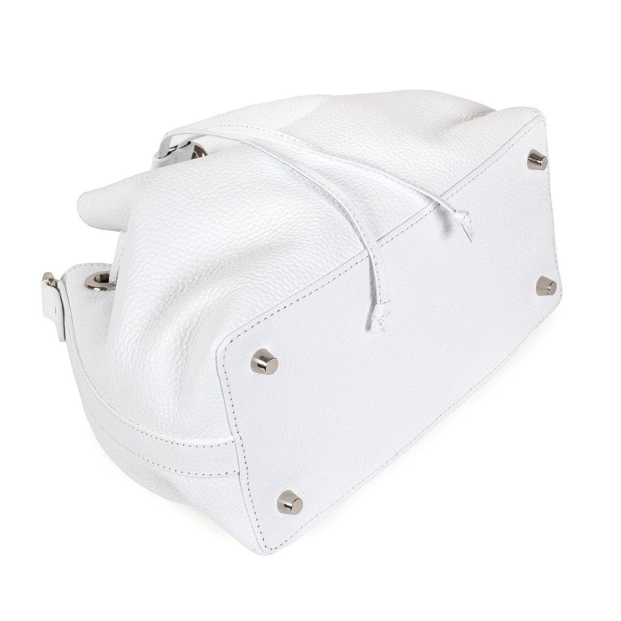 White genuine leather handbag from ukrainian designer Katerina Fox. The advantages of this model is stylish design and excellent leather, from which it is made. All accessories for Katerina Fox bags makes the same factory as for Michael §¬ors, Calvin Klein, DKNY and other famous brands.The internal space of a bag is equipped with one spacious compartment and two patch-pockets and one zipper pocket. The bag is pulled together with a leather lace. The bottom of the bag is protected with metal legs. There is a long handle that allows you to wear the bag on the shoulder. The kit also includes a storage bag.