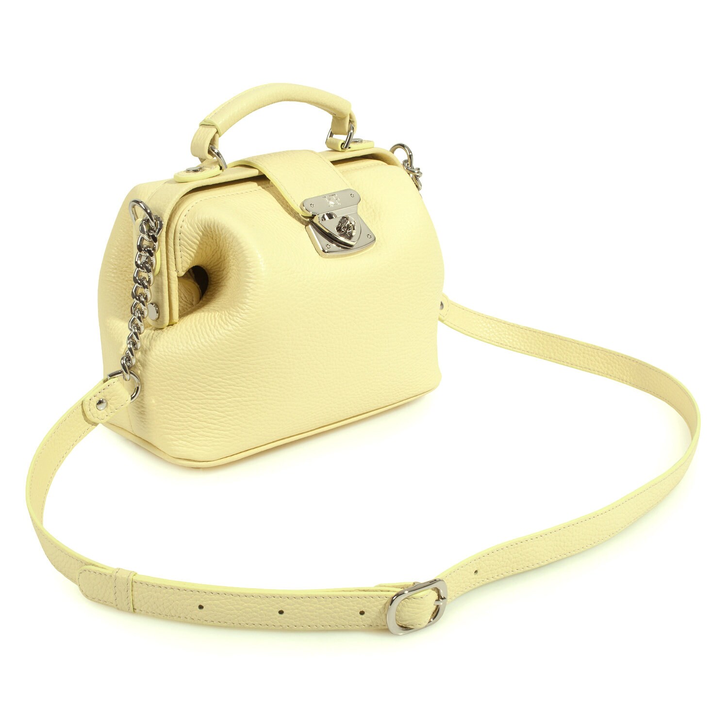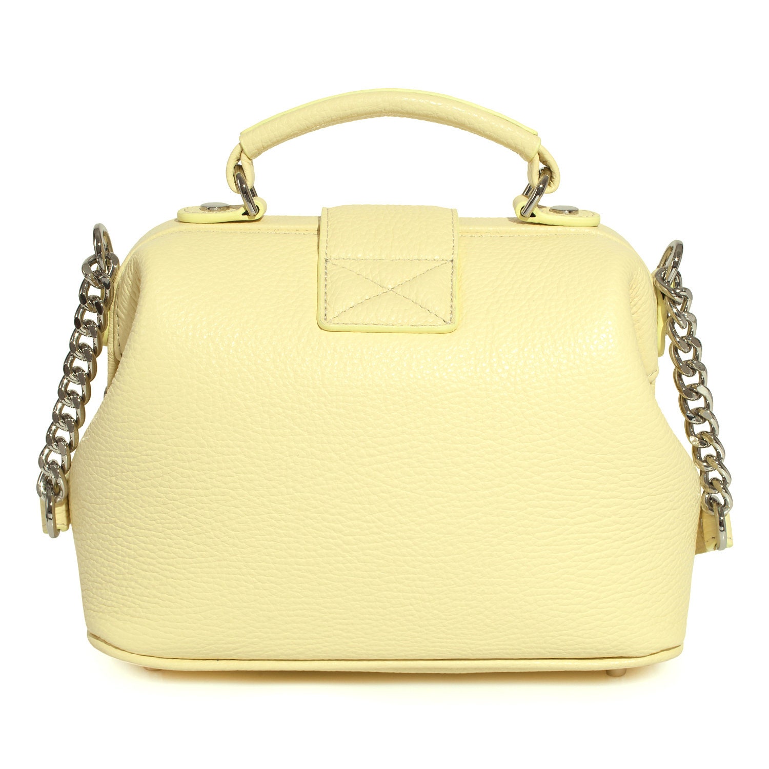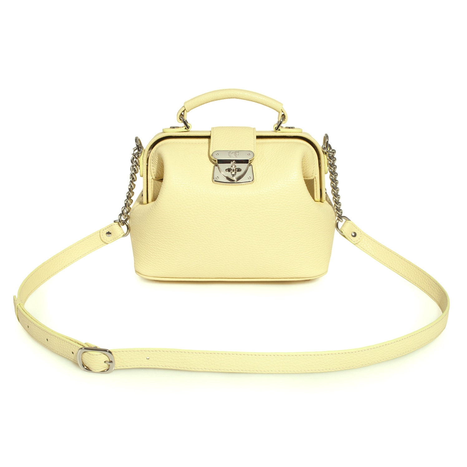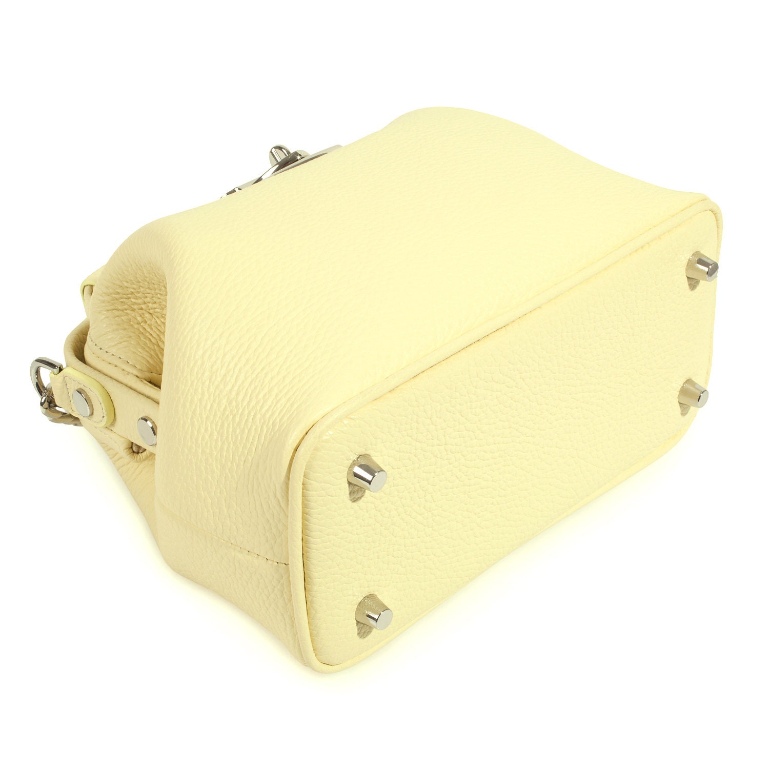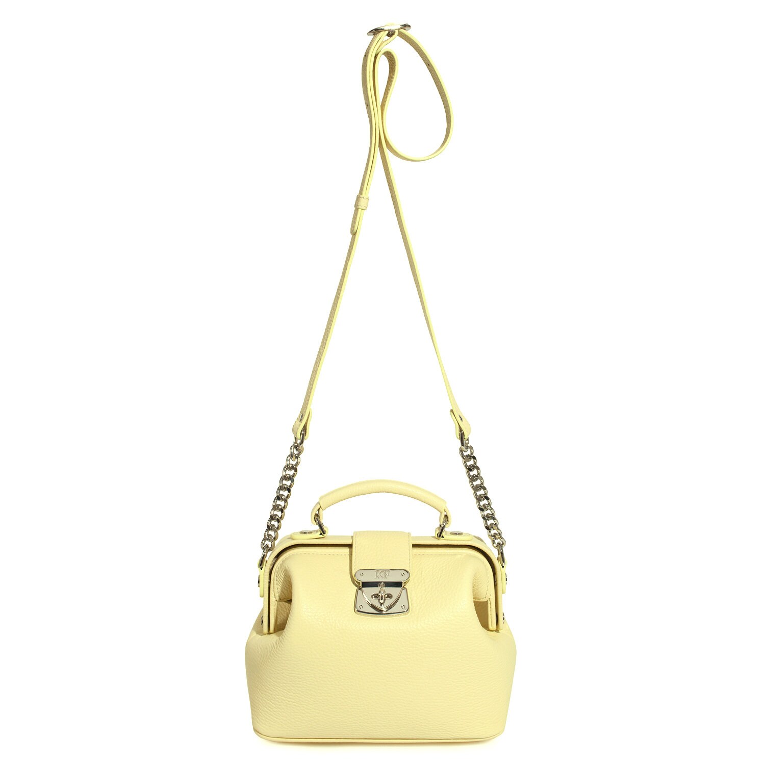 Yellow (lemon) genuine leather handbag from ukrainian designer Katerina Fox. This model is designed for women who appreciate the sleek design combined with functionality and comfort. High-quality and reliable hardware ensure long service bags. The internal space of a bag is equipped with one spacious compartment and two patch-pockets and one zipper pocket. The bag is closed with a clasp. The bottom of the bag is protected with metal legs. There is a long handle that allows you to wear the bag on the shoulder. The kit also includes a storage bag.