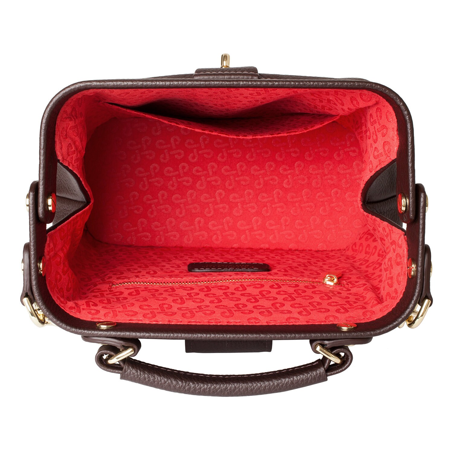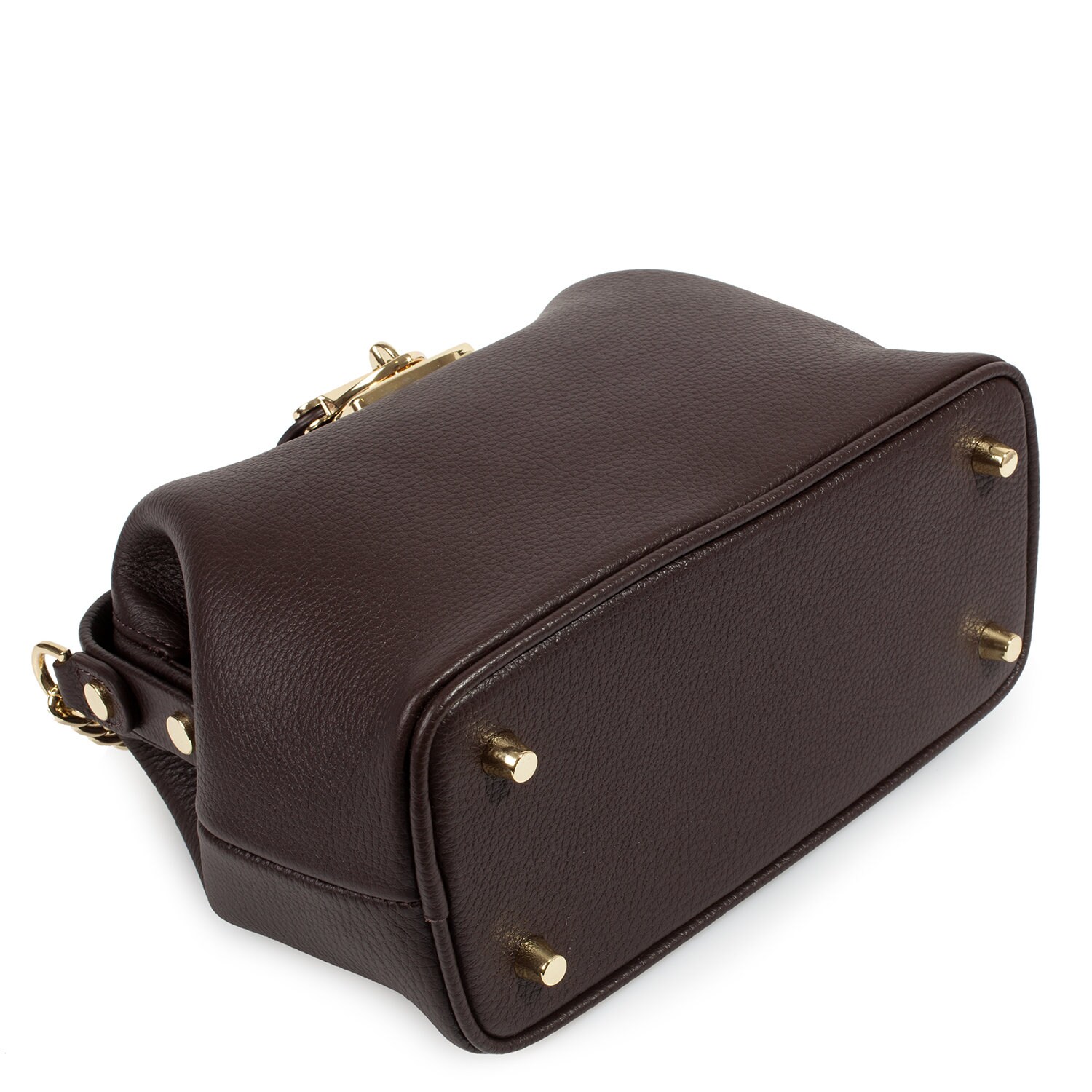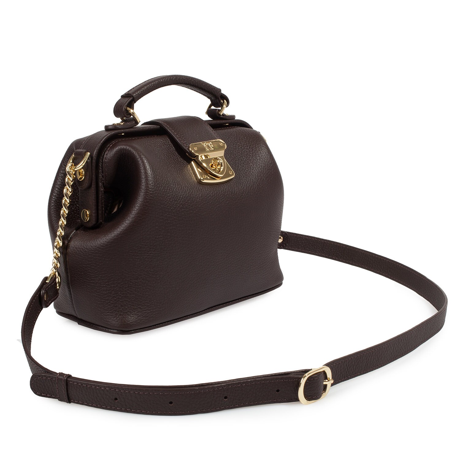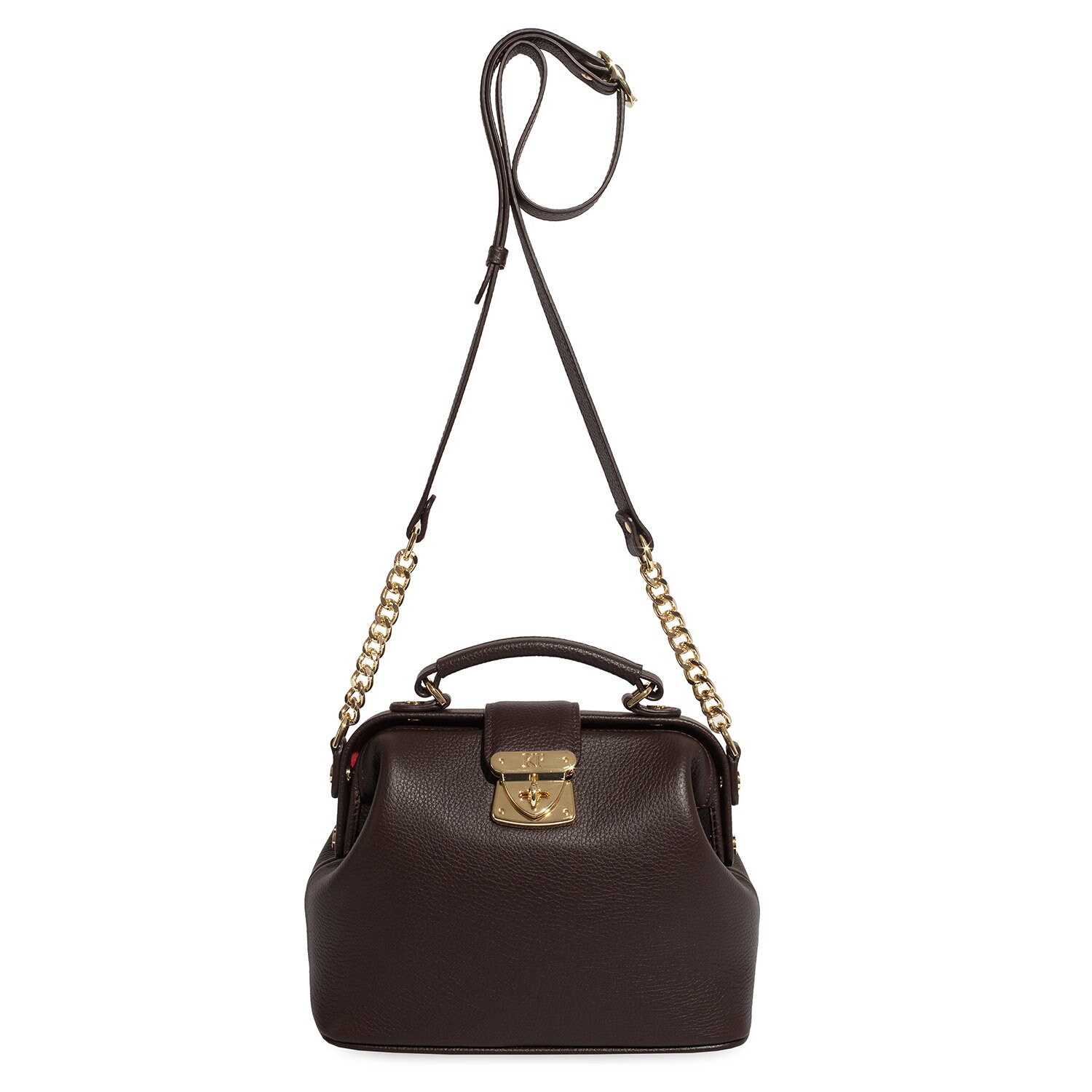 Women's leather doctor bag made of genuine leather, hardware with galvanic coating and microfiber lining. The internal space of a bag is equipped with one spacious compartment, one patch-pocket and one zipper pocket. The bag is closed with a clasp. The kit also includes a storage bag.