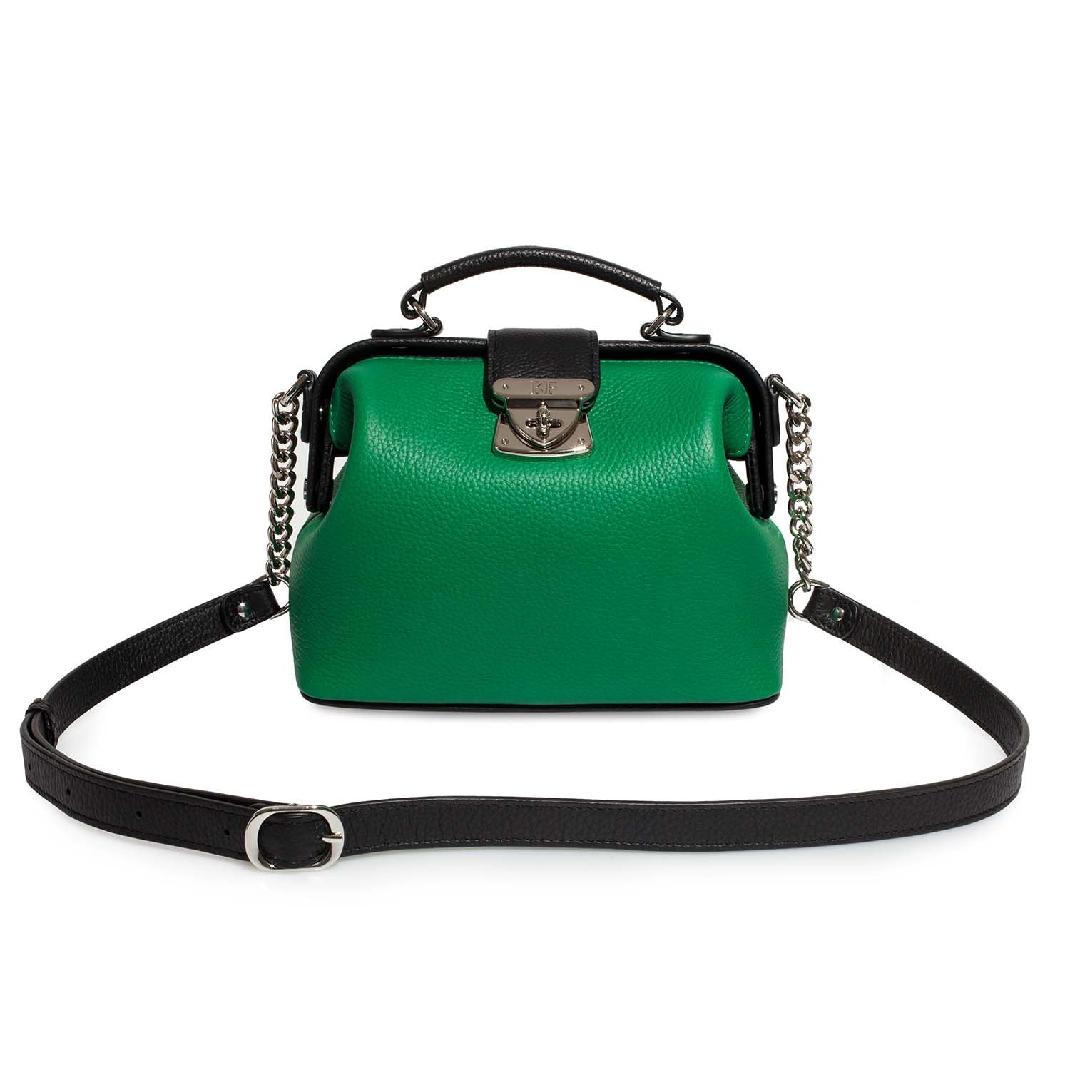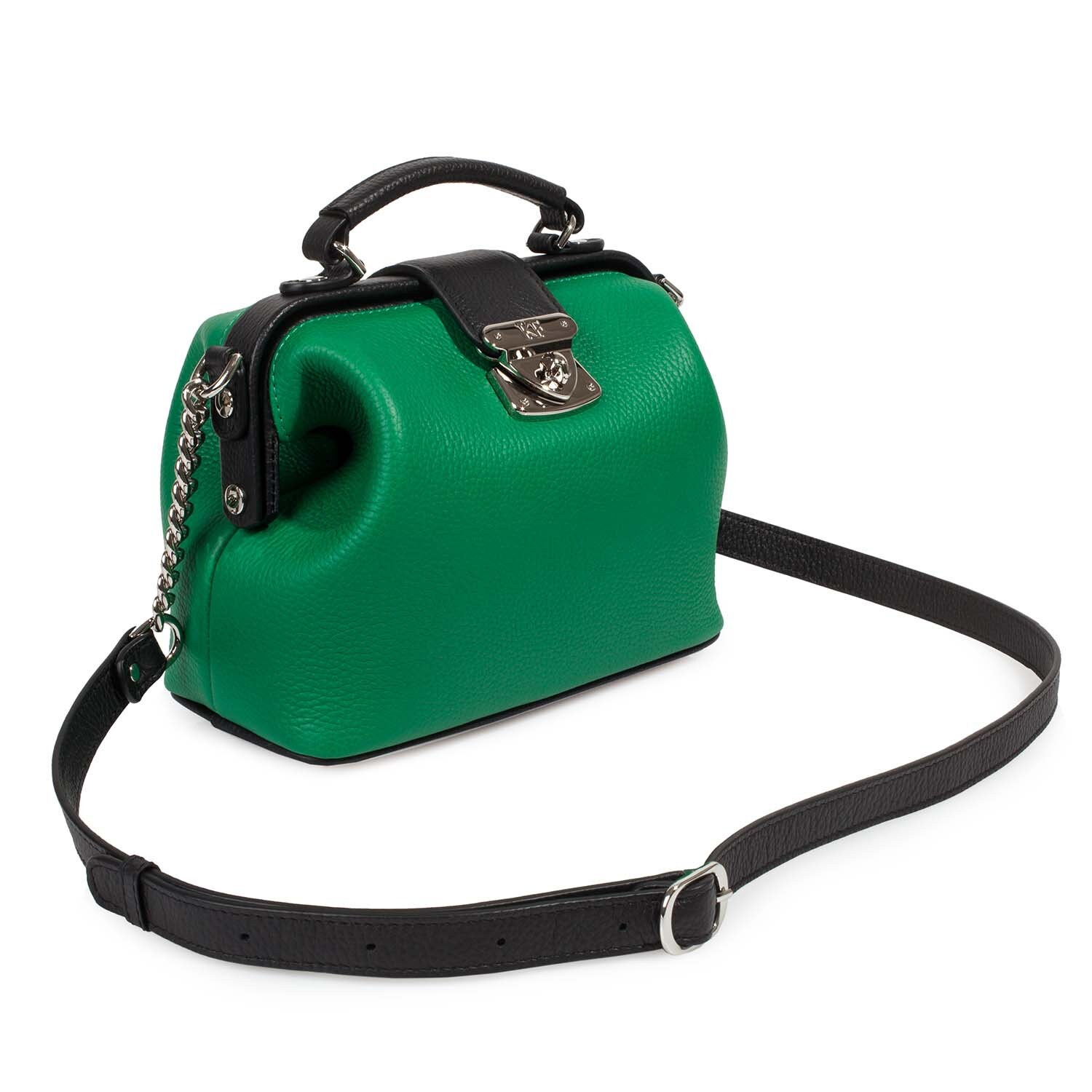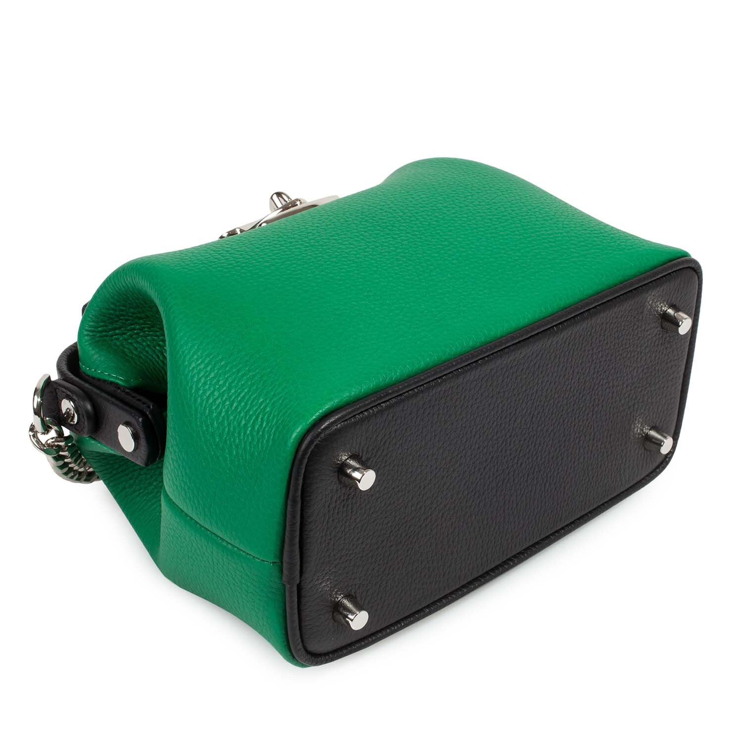 Women's leather doctor bag made of genuine leather, hardware with galvanic coating and microfiber lining. The internal space of a bag is equipped with one spacious compartment, one patch-pocket and one zipper pocket. The bag is closed with a clasp. The kit also includes a storage bag.