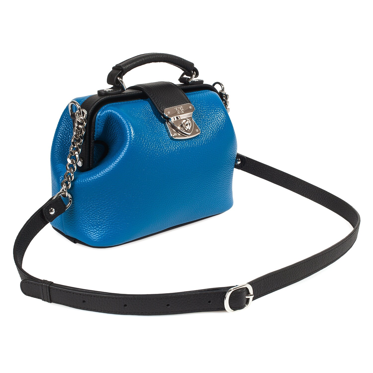 Women's leather doctor bag made of genuine leather, hardware with galvanic coating and microfiber lining. The internal space of a bag is equipped with one spacious compartment, one patch-pocket and one zipper pocket. The bag is closed with a clasp. The kit also includes a storage bag.