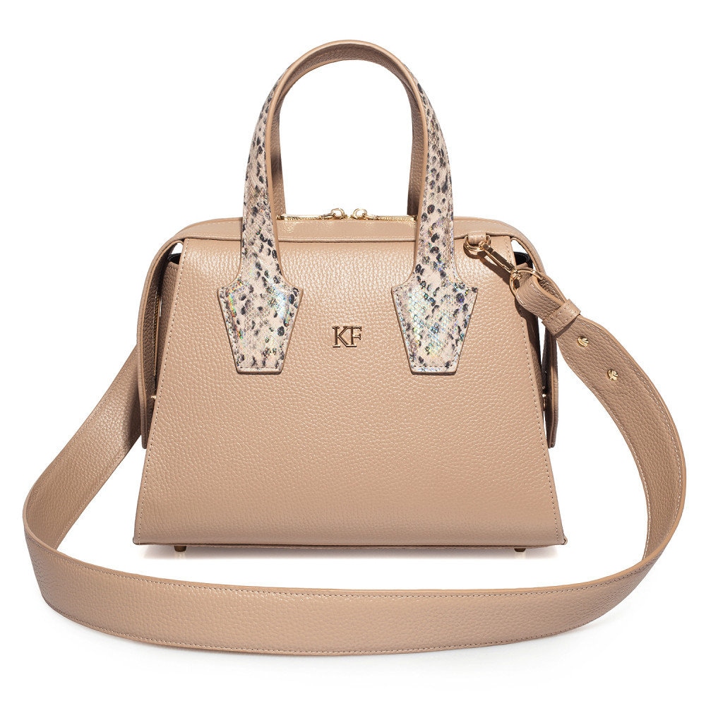 Beige genuine leather handbag from Ukrainian designer Katerina Fox. This model is designed for women who appreciate the sleek design combined with functionality and comfort. High-quality and reliable hardware ensure long service bags. The internal space of a bag is equipped with one spacious compartment and two pockets. The bag is closed with a zipper. The bottom of the bag is protected with metal legs. There is a long handle that allows you to wear the bag on the shoulder. The kit also includes a storage bag.