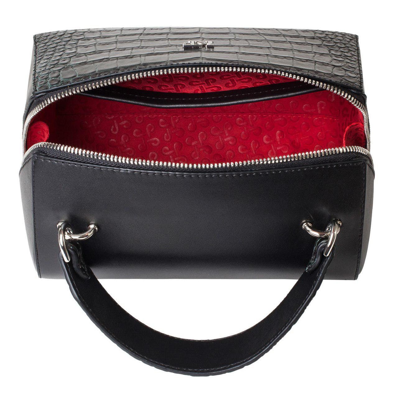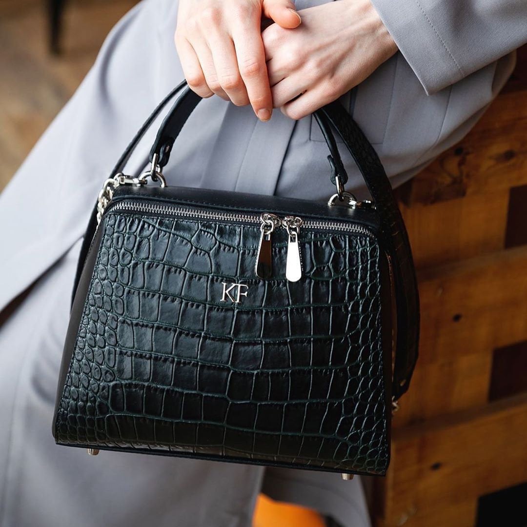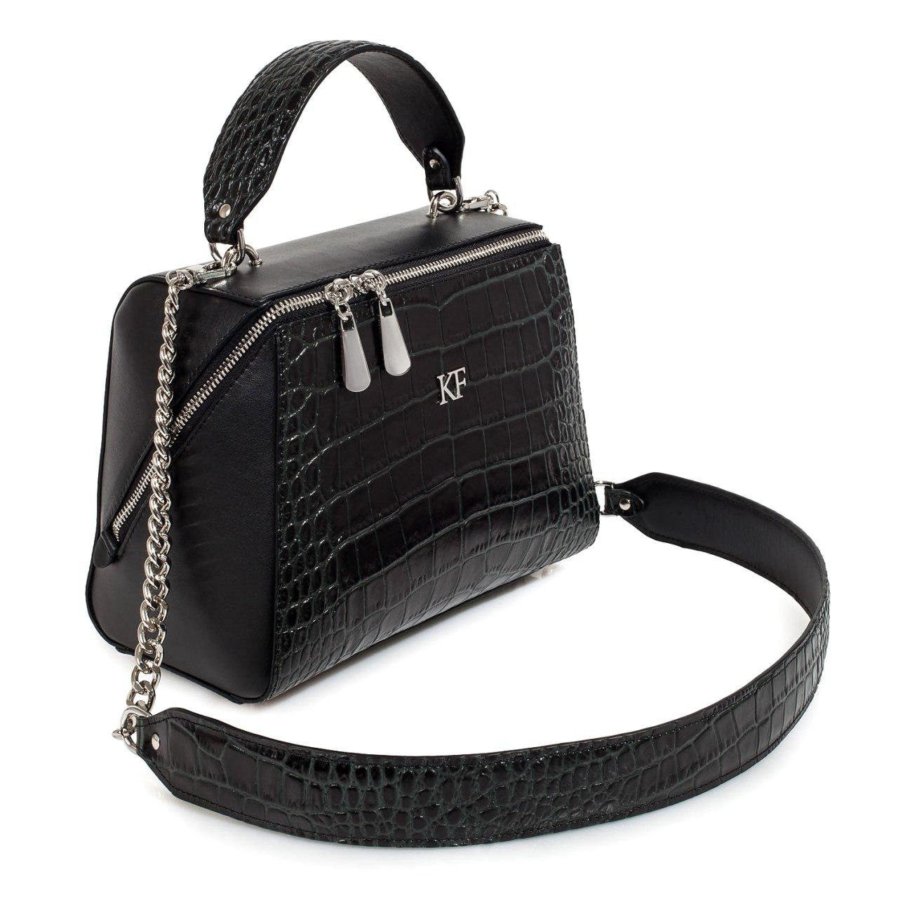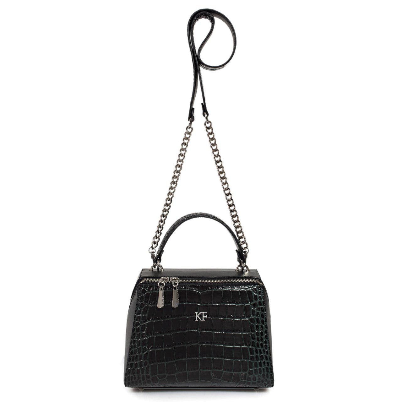 Black/Green genuine leather handbag from ukrainian designer Katerina Fox. This model is designed for women who appreciate the sleek design combined with functionality and comfort. High-quality and reliable hardware ensure long service bags. The internal space of a bag is equipped with one spacious compartment and two patch-pockets and one zipper pocket. The bag is closed with a zipper. The bottom of the bag is protected with metal legs. There is a long handle that allows you to wear the bag on the shoulder. The kit also includes a storage bag.