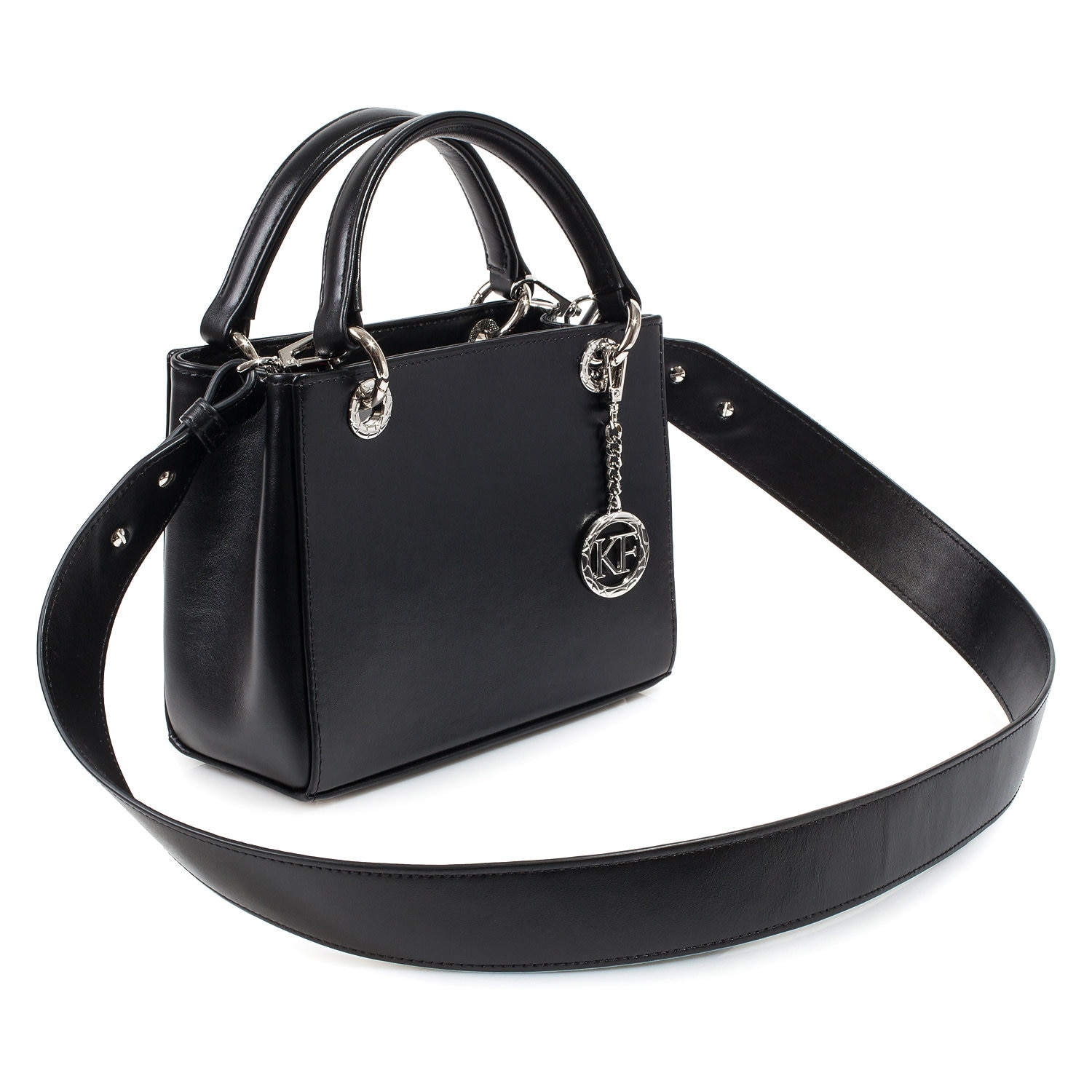 Delivery: In most cases our goods are shipped by FedEx or Ups Express. On rare occasions the goods might be shipped by Ukrposhta. The clients should check in advance an estimate of the amount of customs duty and value added tax.Black genuine leather handbag from ukrainian designer Katerina Fox. This model is designed for women who appreciate the sleek design combined with functionality and comfort. Despite the simplicity, this bag stands out thanks to a triangular insert in black suede leather. High-quality and reliable hardware ensure long service bags. Inside the bag are three spacious compartments, one with zip, two patch pockets and one zippered pocket closes with a zipper. The bottom of the bag protected by metal feet.