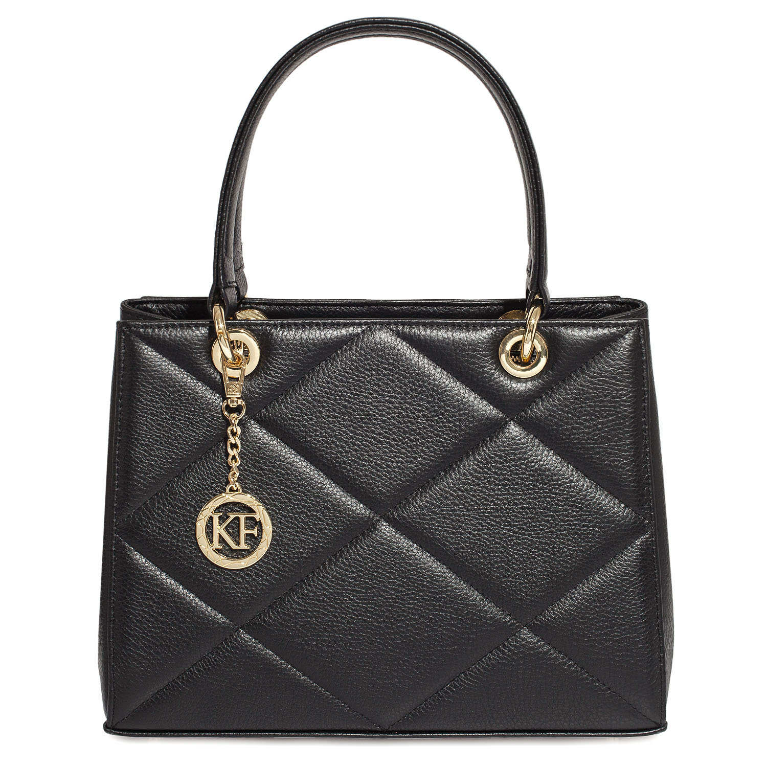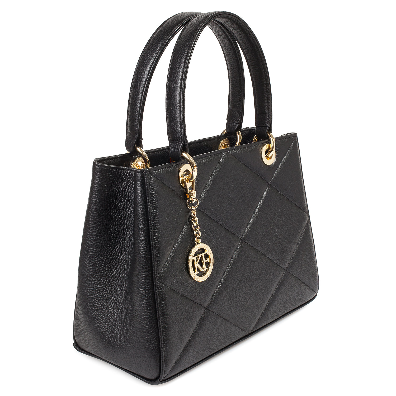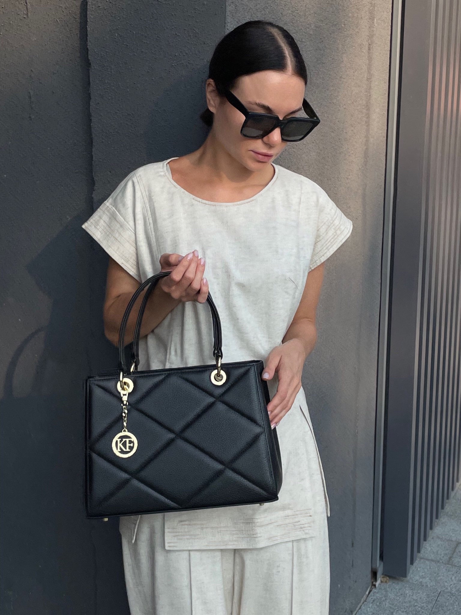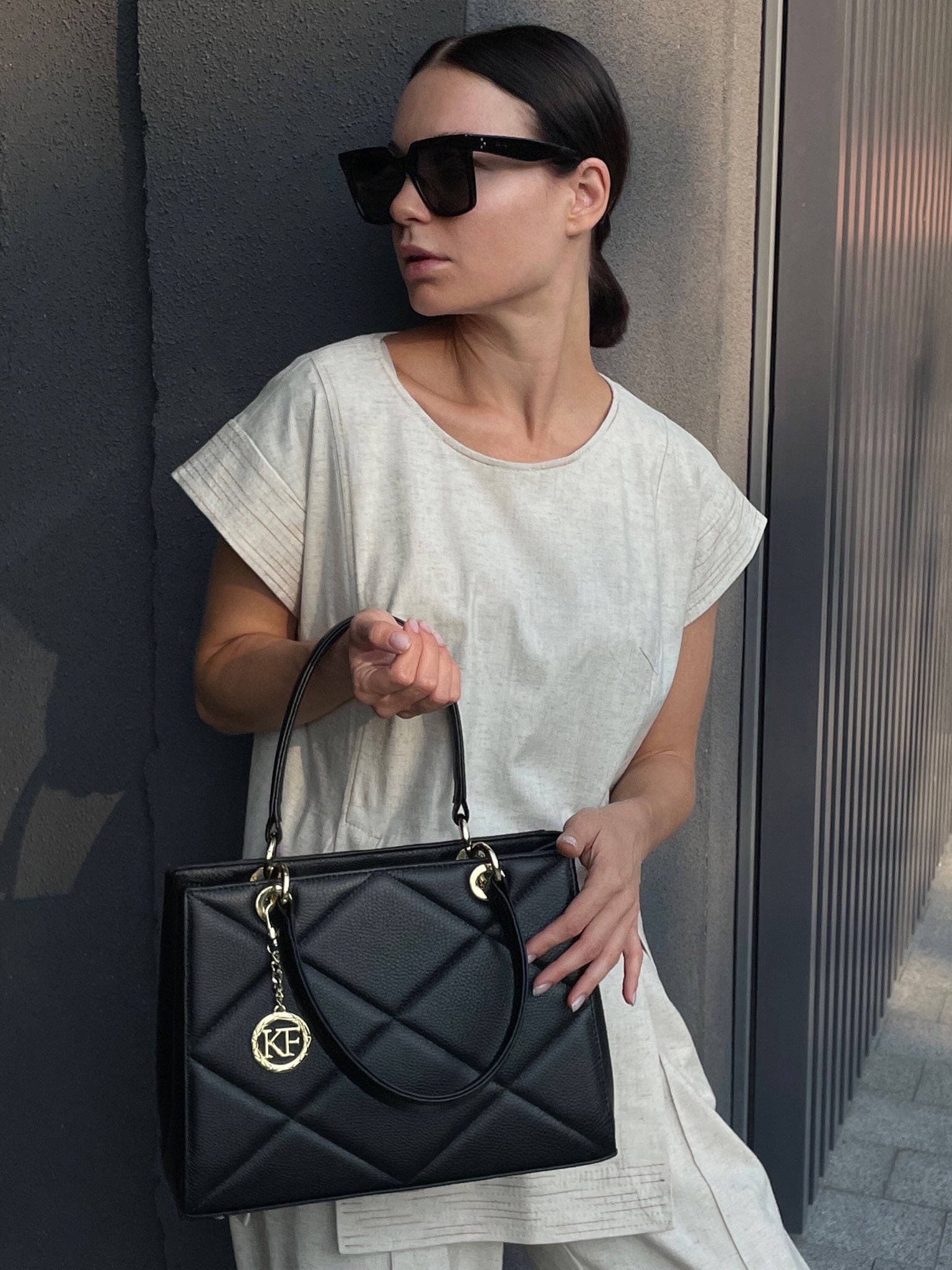 Black genuine leather handbag from ukrainian designer Katerina Fox. This model is designed for women who appreciate the sleek design combined with functionality and comfort. Despite the simplicity, this bag stands out thanks to a triangular insert in black suede leather. High-quality and reliable hardware ensure long service bags. Inside the bag are three spacious compartments, one with zip, two patch pockets and one zippered pocket closes with a zipper. The bottom of the bag protected by metal feet.