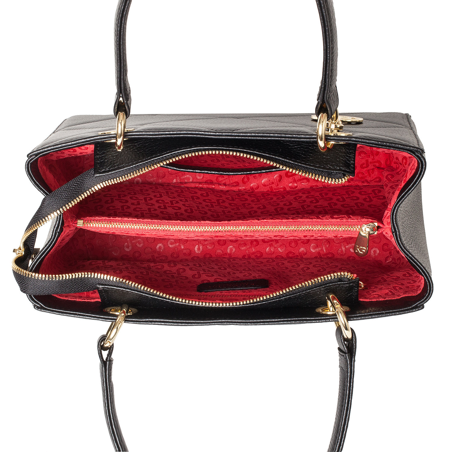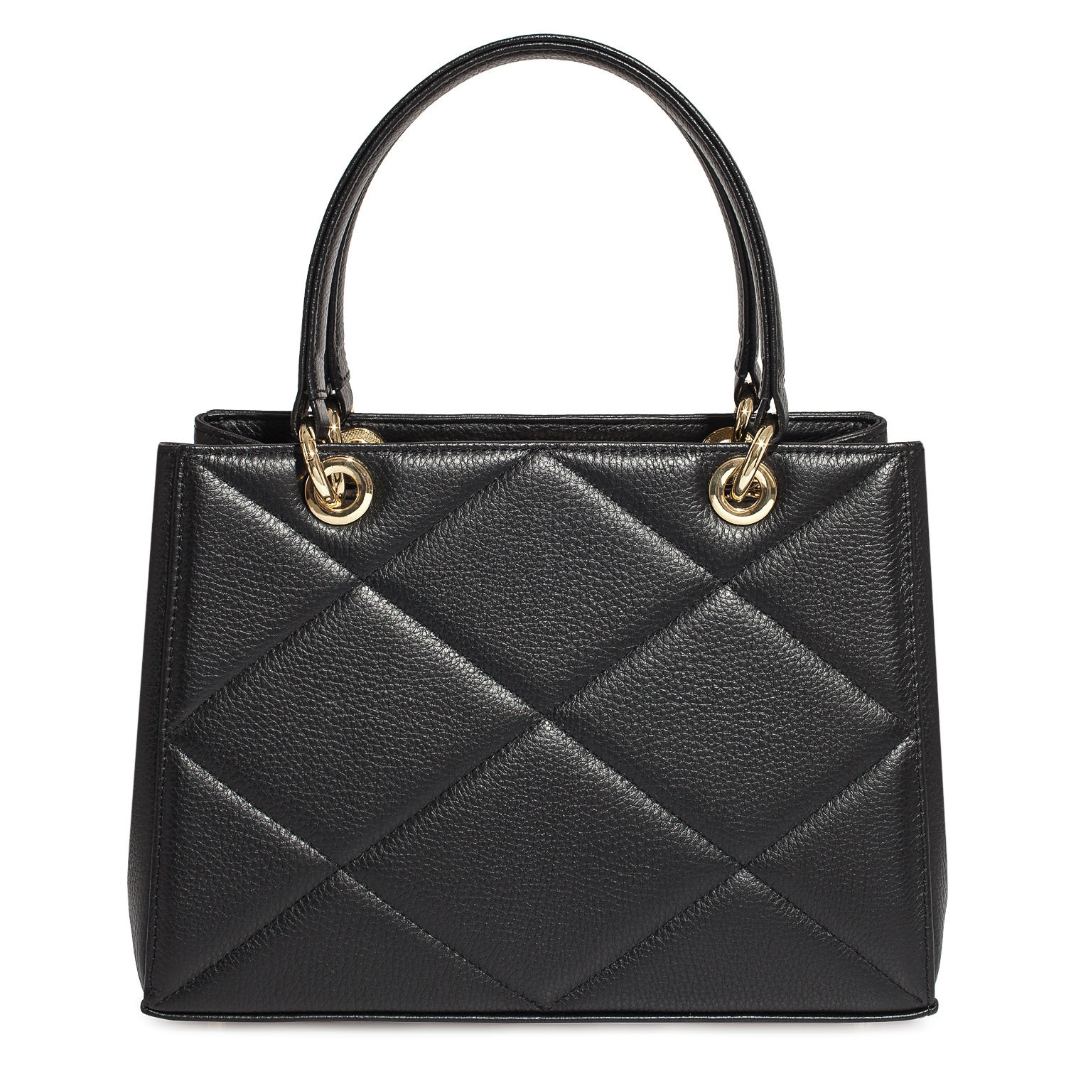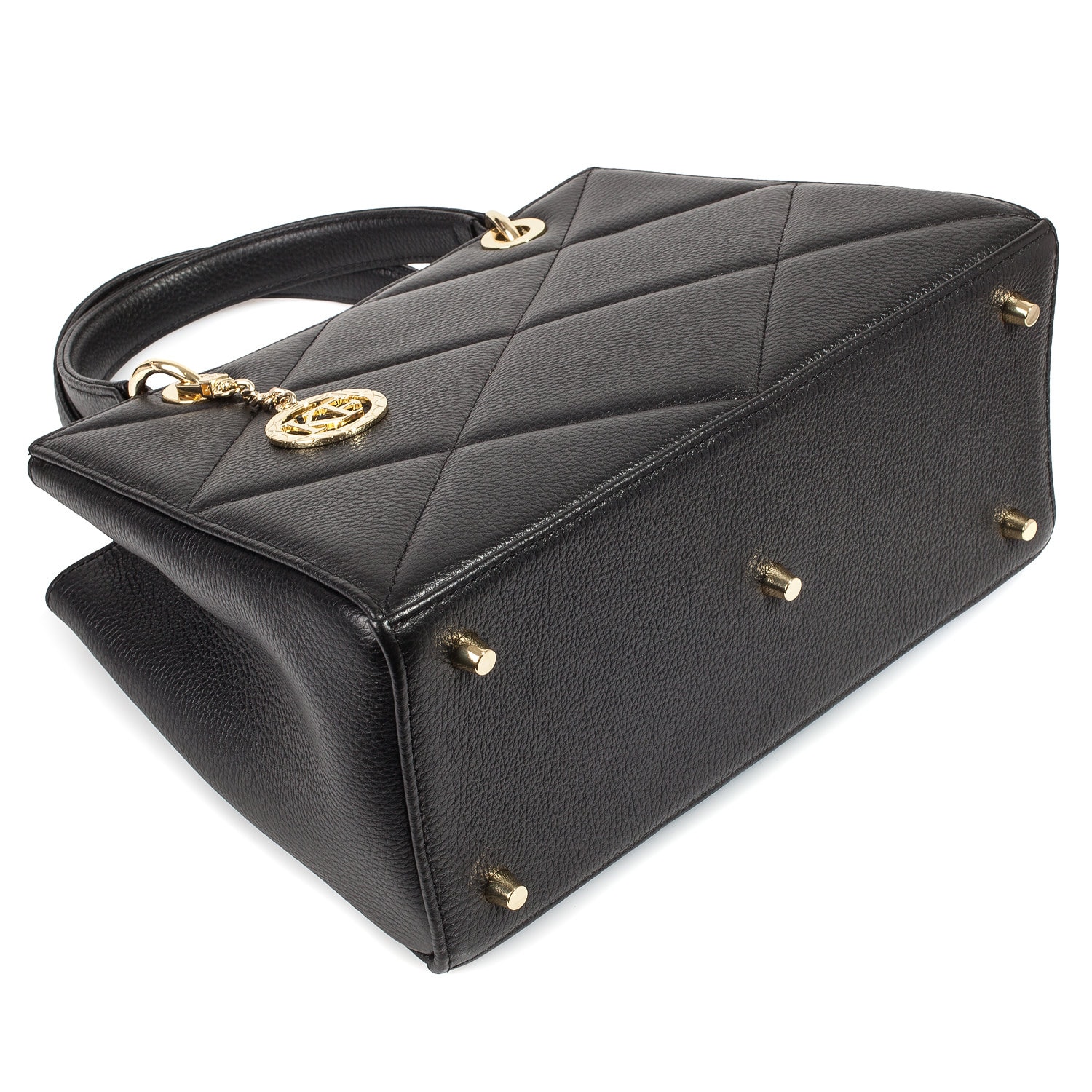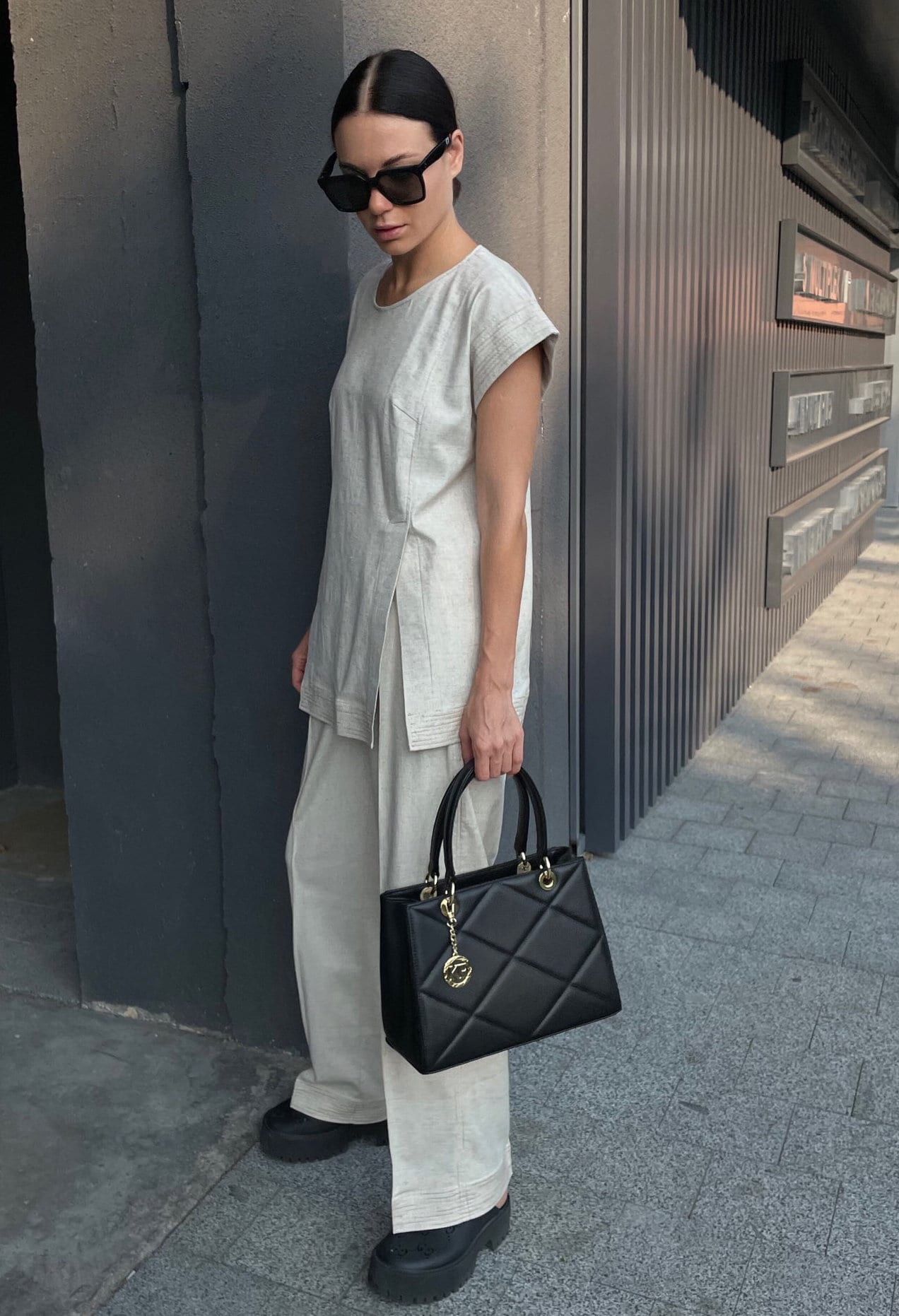 Black genuine leather handbag from ukrainian designer Katerina Fox. This model is designed for women who appreciate the sleek design combined with functionality and comfort. Despite the simplicity, this bag stands out thanks to a triangular insert in black suede leather. High-quality and reliable hardware ensure long service bags. Inside the bag are three spacious compartments, one with zip, two patch pockets and one zippered pocket closes with a zipper. The bottom of the bag protected by metal feet.
