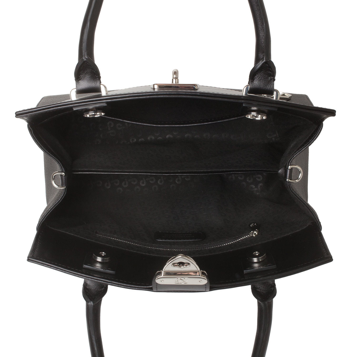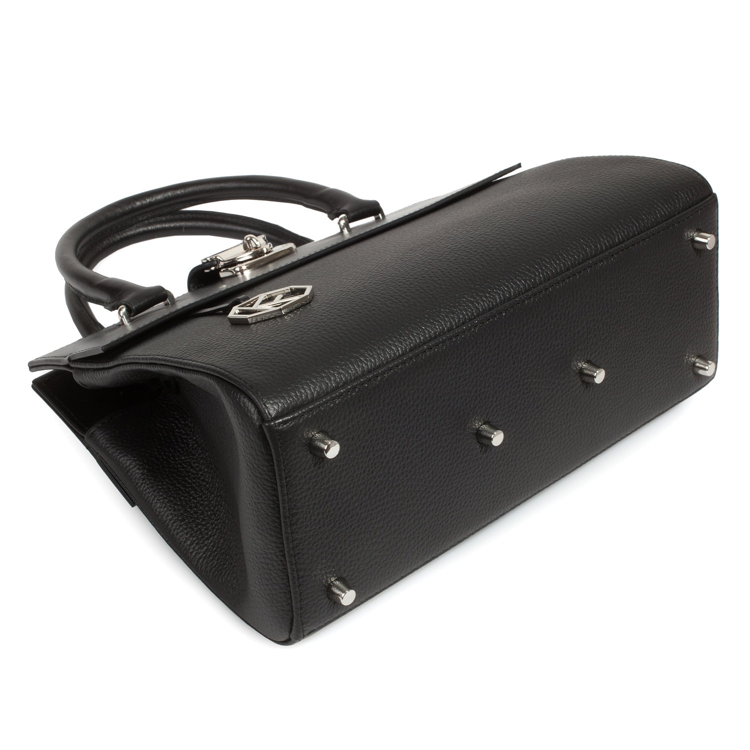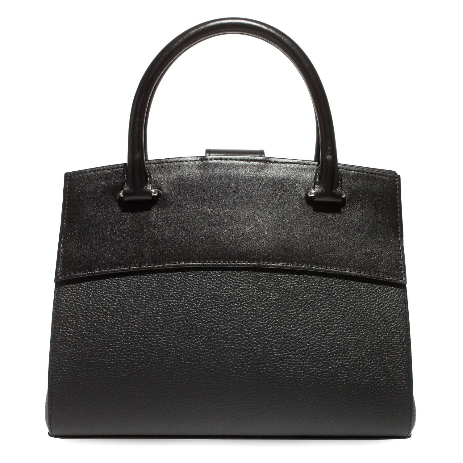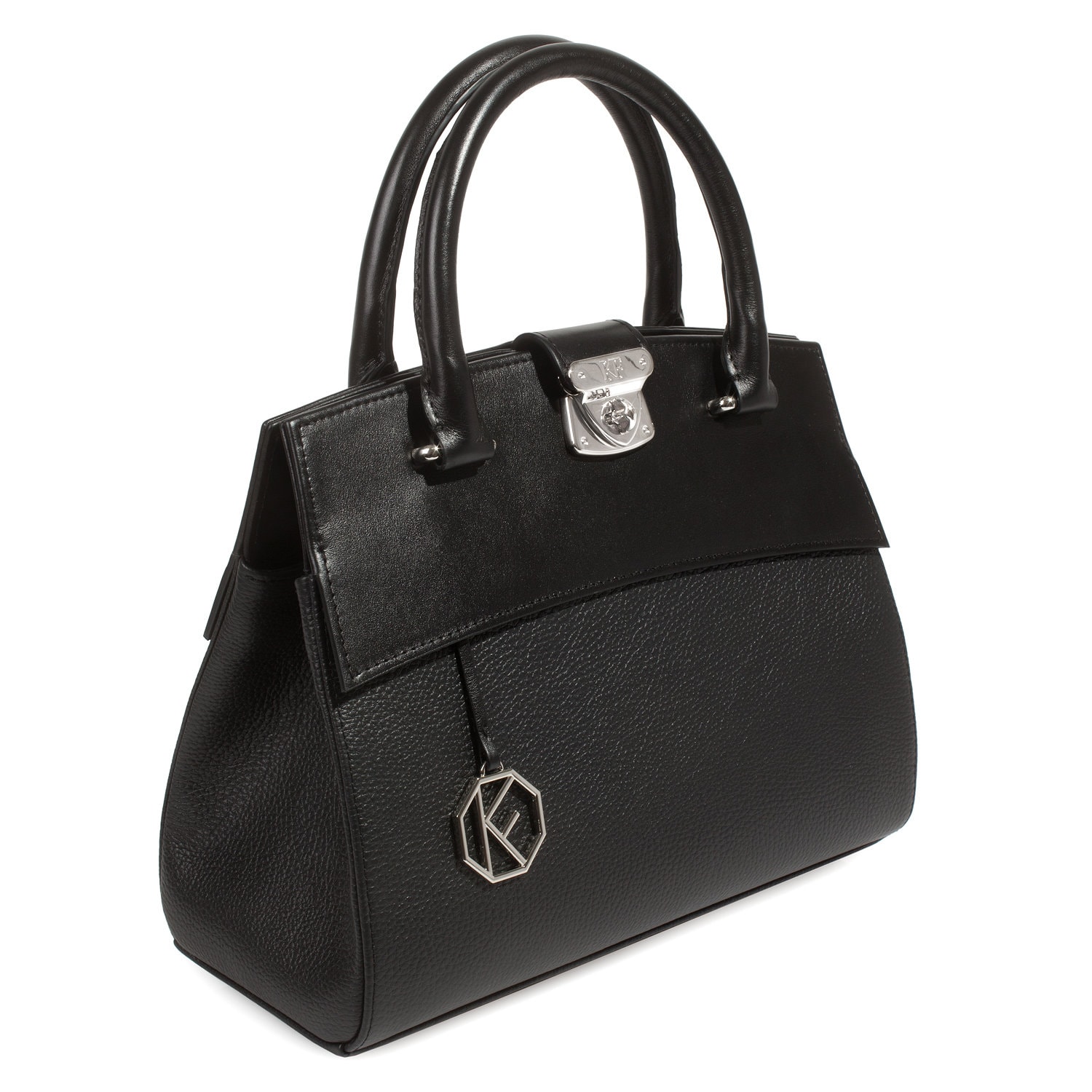 Women's leather bag made of genuine leather, hardware with galvanic coating and microfiber lining. The internal space of a bag is equipped with three compartments, two compartments and two side pockets, one of them with a zipper. It closes with a lock and two magnet buttons. The bottom of the bag is protected with metal legs. There is a long handle that allows you to wear the bag on the shoulder. The kit also includes a storage bag.