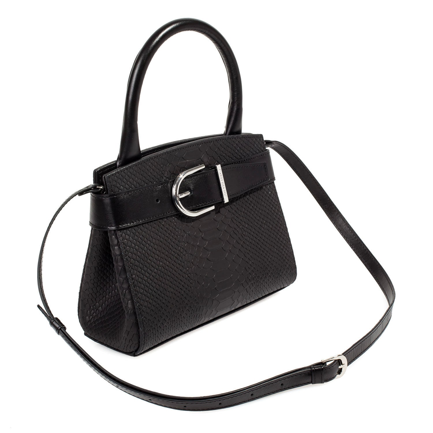 Women's leather bag made of genuine leather, hardware with galvanic coating and microfiber lining. The internal space of a bag is equipped with three compartments, one compartment and two side pockets, one with a zipper. §³loses with 3 magnet buttons. The bottom of the bag is protected with metal legs. There is a long handle that allows you to wear the bag on the shoulder. The kit also includes a storage bag.
