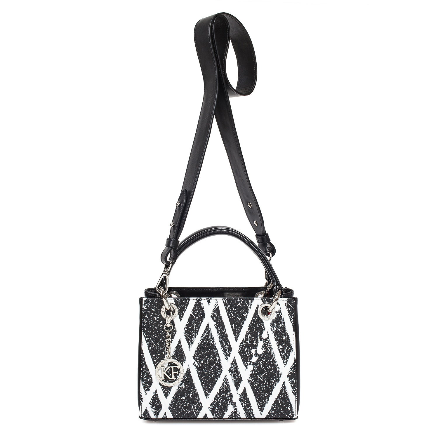 Delivery: In most cases our goods are shipped by FedEx or Ups Express. On rare occasions the goods might be shipped by Ukrposhta. The clients should check in advance an estimate of the amount of customs duty and value added tax.Black-white genuine leather handbag from ukrainian designer Katerina Fox. This model is designed for women who appreciate the sleek design combined with functionality and comfort. Despite the simplicity, this bag stands out thanks to a triangular insert in black suede leather. High-quality and reliable hardware ensure long service bags. Inside the bag are three spacious compartments, one with zip, two patch pockets and one zippered pocket closes with a zipper. The bottom of the bag protected by metal feet.