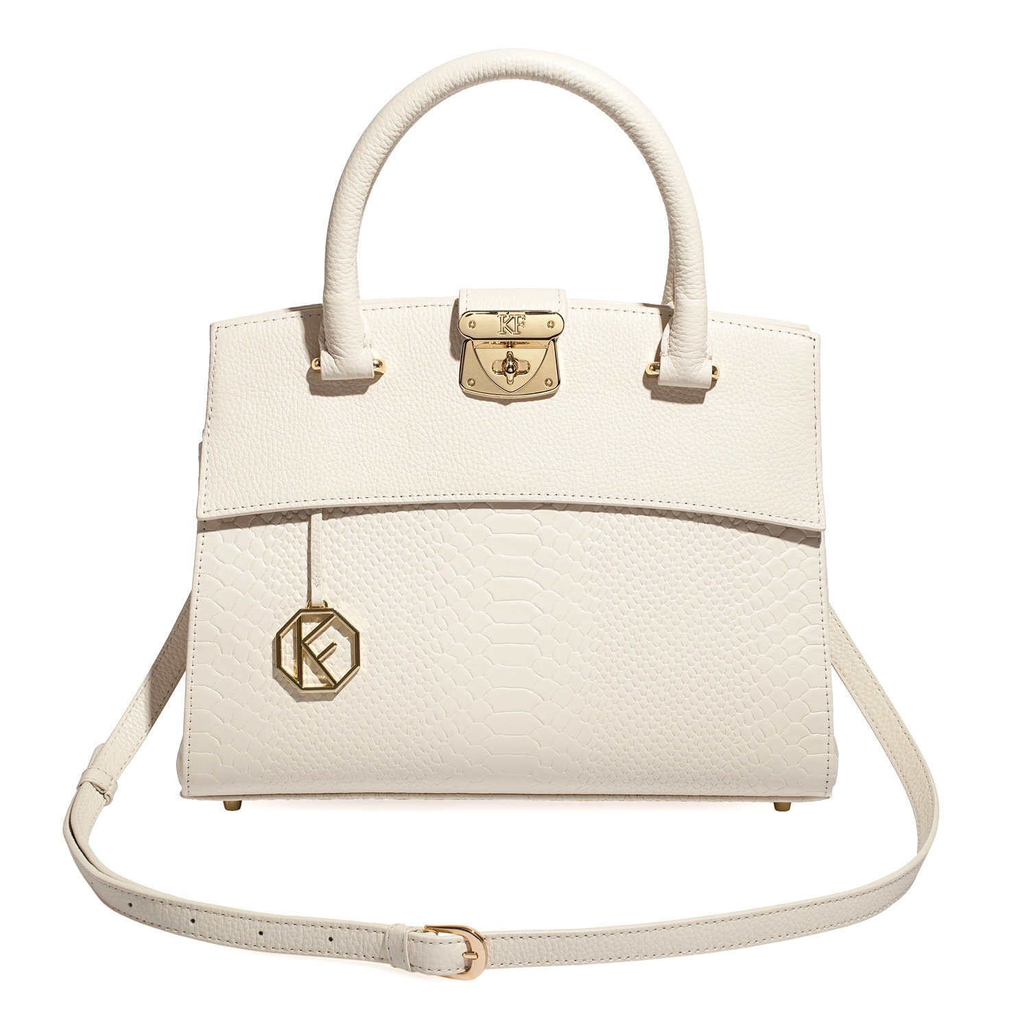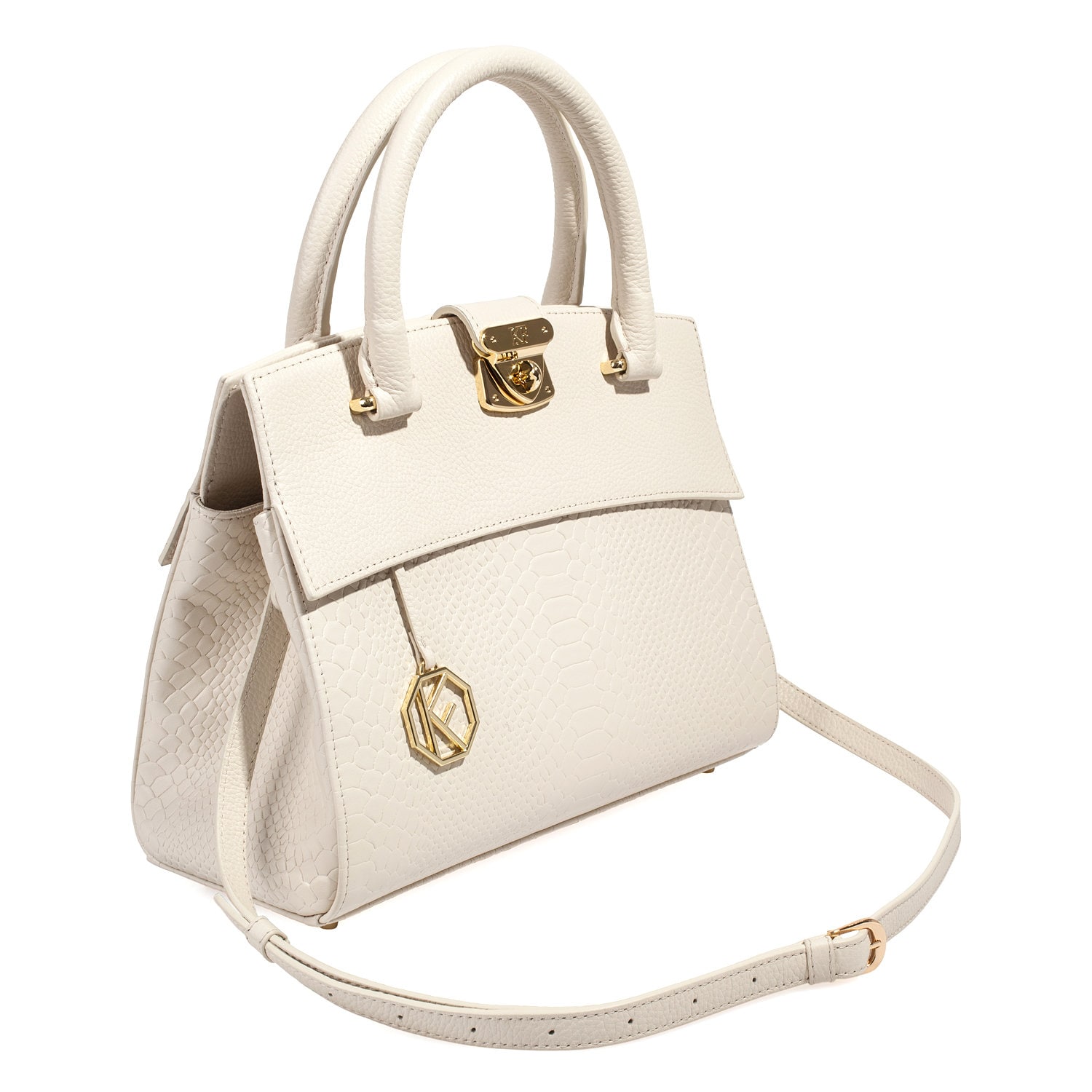Women's leather bag made of genuine leather, hardware with galvanic coating and microfiber lining. The internal space of a bag is equipped with three compartments, two compartments and two side pockets, one of them with a zipper. It closes with a lock and two magnet buttons. The bottom of the bag is protected with metal legs. There is a long handle that allows you to wear the bag on the shoulder. The kit also includes a storage bag.