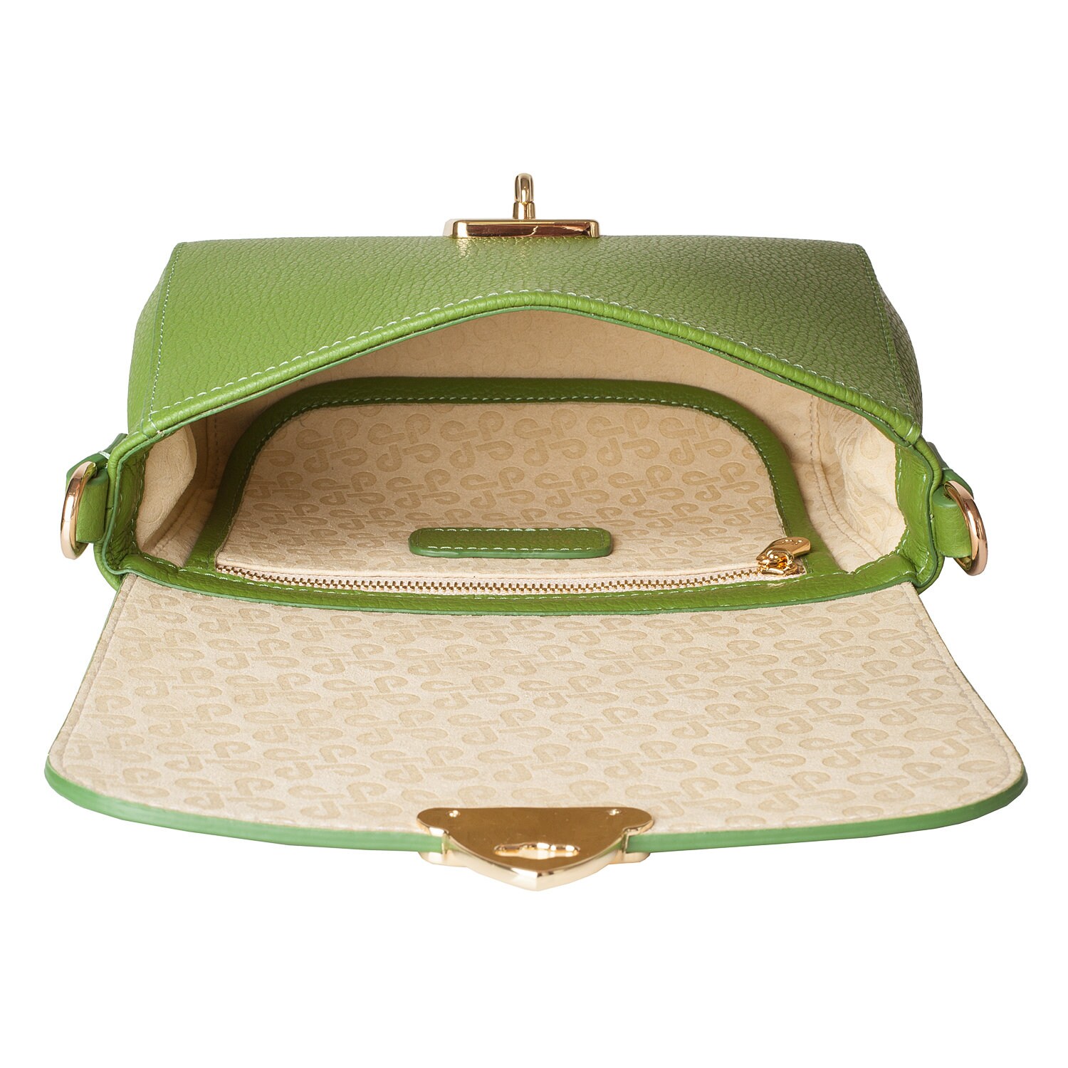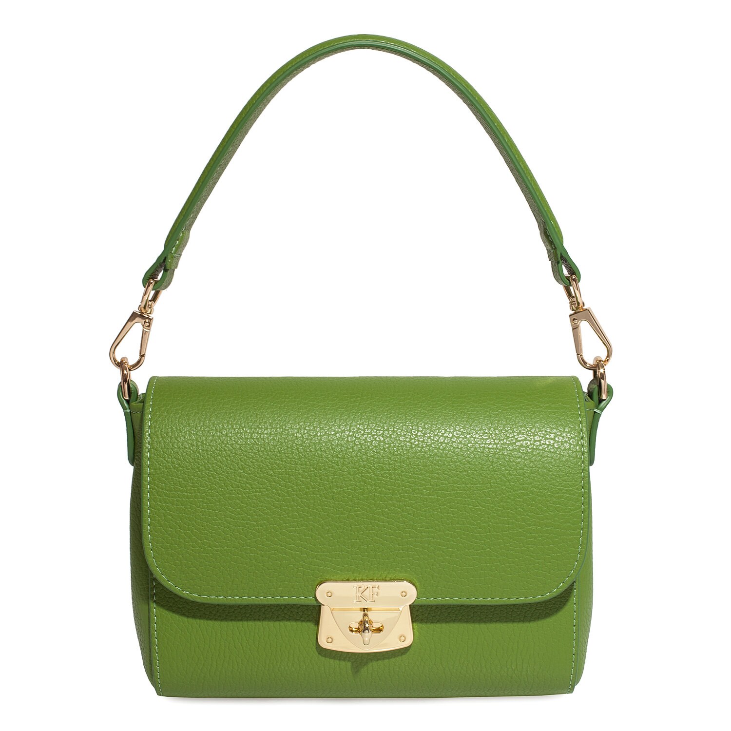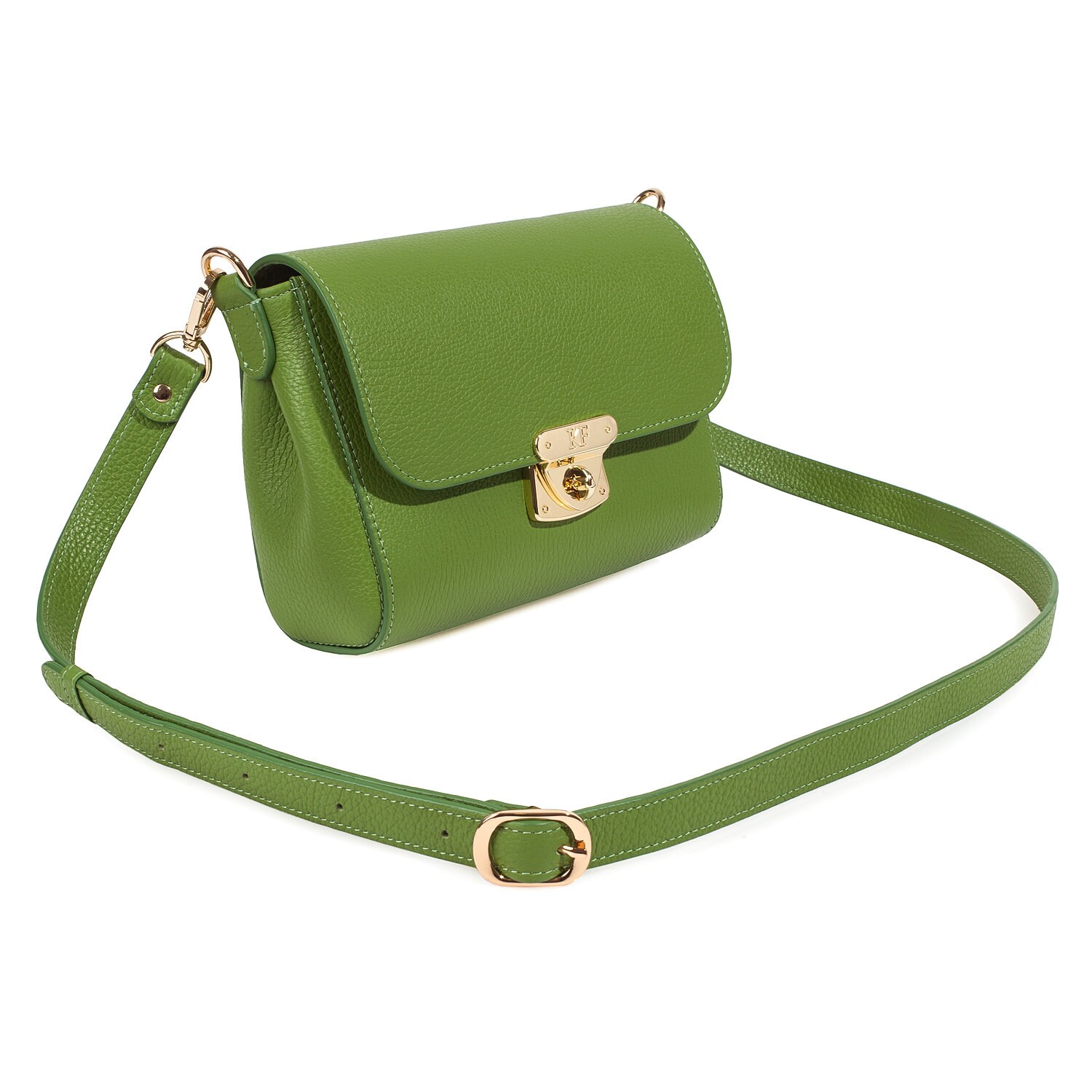 Green genuine leather woman shoulder bag from ukrainian designer Katerina Fox. Fashionable and elegant modern bag KF for bright girls and women. This bag is able to attract attention and highlight your exquisite taste. Inside the bag is one large compartment and a convenient zippered pocket for small items, closes the bag on the clasp. The bag is comfortable to wear on the shoulder or across the shoulder.