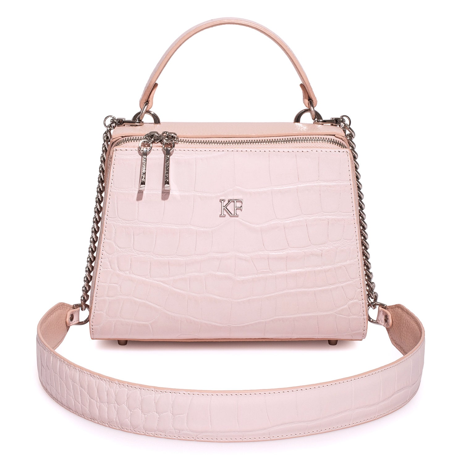 Light pink genuine leather handbag from ukrainian designer Katerina Fox. This model is designed for women who appreciate the sleek design combined with functionality and comfort. High-quality and reliable hardware ensure long service bags. The internal space of a bag is equipped with one spacious compartment and two patch-pockets and one zipper pocket. The bag is closed with a zipper. The bottom of the bag is protected with metal legs. There is a long handle that allows you to wear the bag on the shoulder. The kit also includes a storage bag.