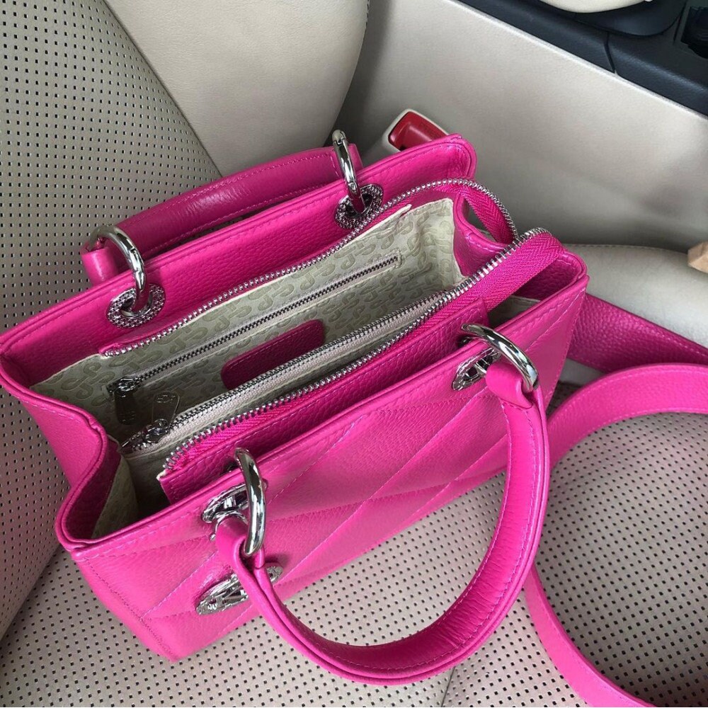 Pink genuine leather handbag from ukrainian designer Katerina Fox. This model is designed for women who appreciate the sleek design combined with functionality and comfort. High-quality and reliable hardware ensure long service bags. Inside the bag are three spacious compartments, one with zip, two patch pockets and one zippered pocket closes with a zipper. The bottom of the bag protected by metal feet.