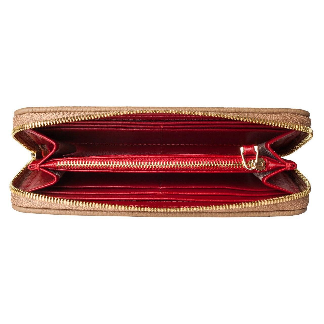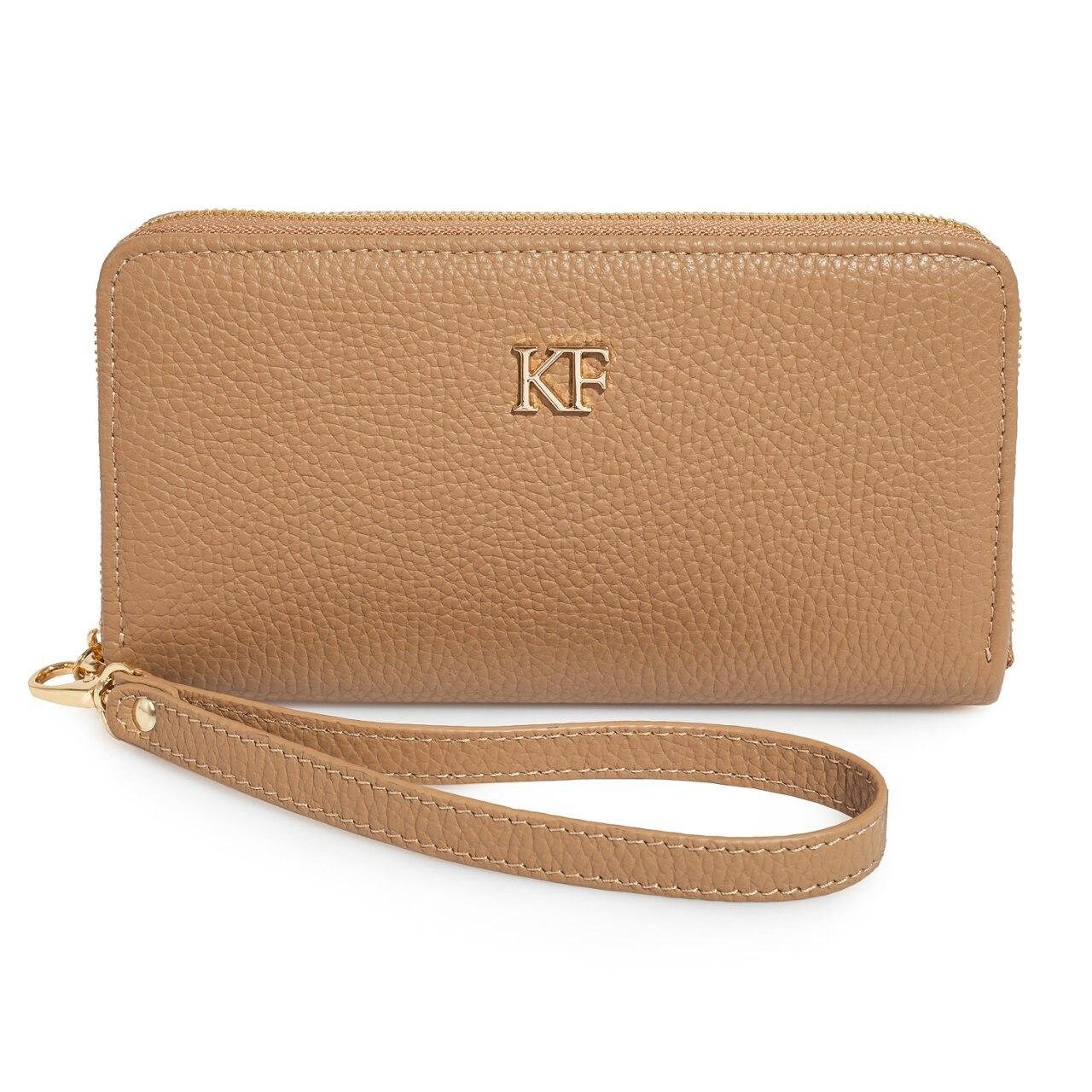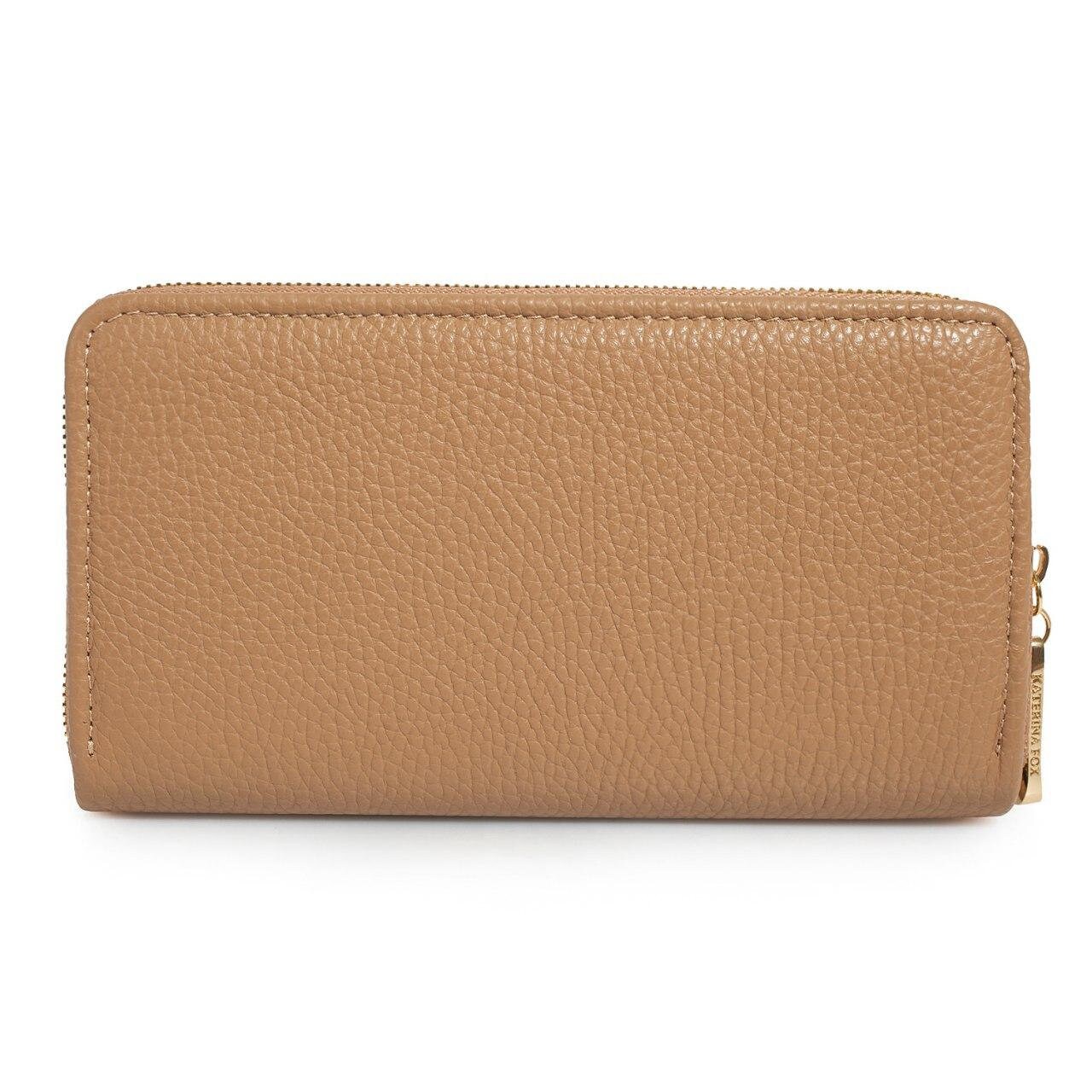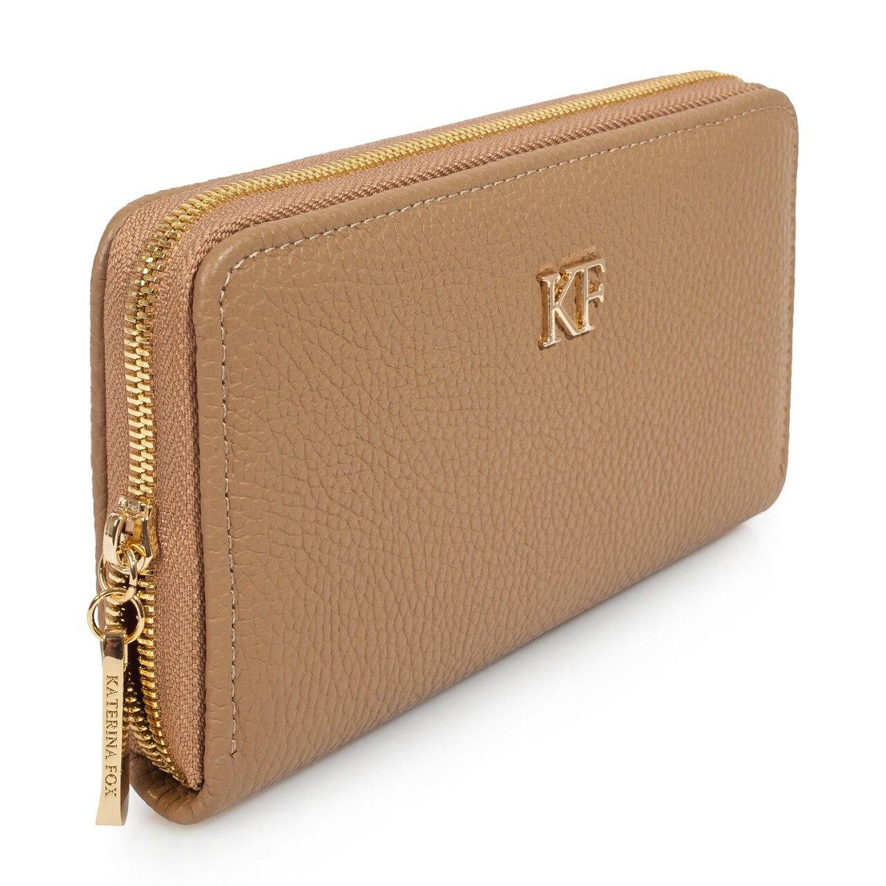 Beige genuine leather woman wallet from ukrainian designer Katerina Fox. A stylish accessory – a necessary purchase for many women. Wallet KF like women who value practicality and beauty. Inside two large compartments for notes, separating zipper pocket for coins, nine pockets for business cards and two department, closed wallet on zipper. Wallet has a short handle on a removable wrist.