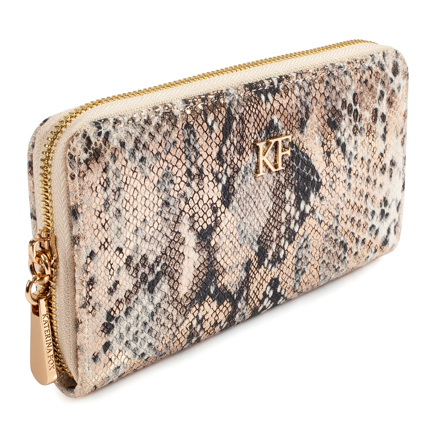 Beige genuine leather woman wallet from ukrainian designer Katerina Fox. A stylish accessory – a necessary purchase for many women. Wallet KF like women who value practicality and beauty. Inside two large compartments for notes, separating zipper pocket for coins, nine pockets for business cards and two department, closed wallet on zipper. Wallet has a short handle on a removable wrist.