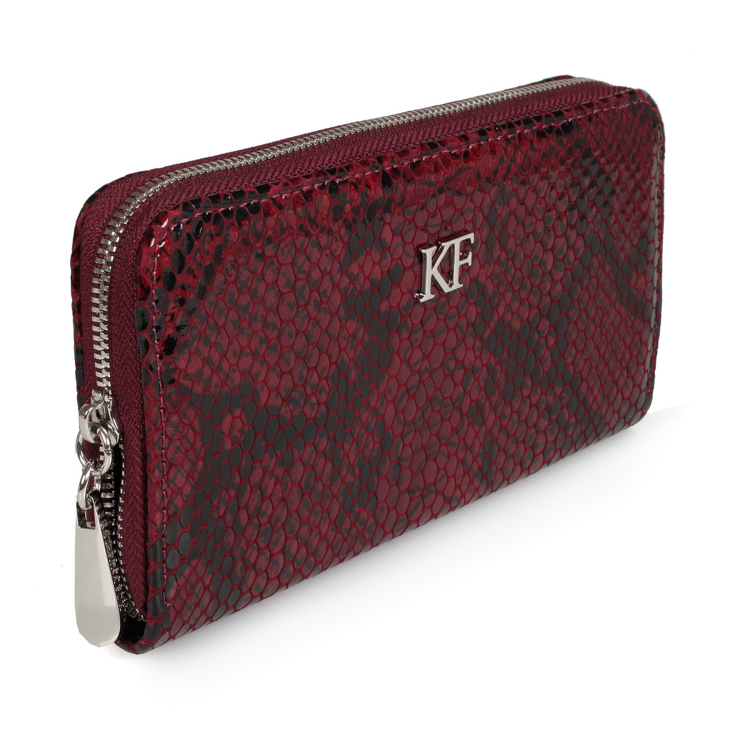 Red genuine leather snake print woman wallet from ukrainian designer Katerina Fox. A stylish accessory – a necessary purchase for many women. Wallet KF like women who value practicality and beauty. Inside two large compartments for notes, separating zipper pocket for coins, nine pockets for business cards and two department, closed wallet on zipper. Wallet has a short handle on a removable wrist.