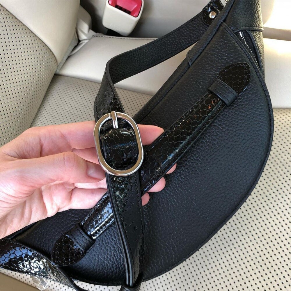 Black genuine leather woman banana bag from Ukrainian designer Katerina Fox. Fashionable and elegant modern bag KF for bright girls and women. This bag is able to attract attention and highlight your exquisite taste. Inside the bag is one large compartment and a convenient zippered pocket for small items that closes the bag on the zipper.