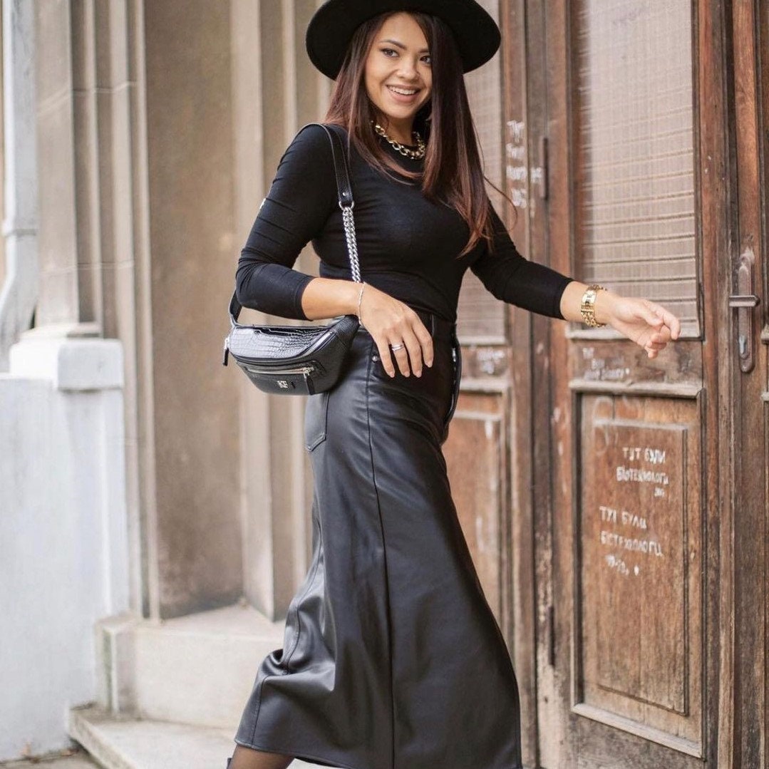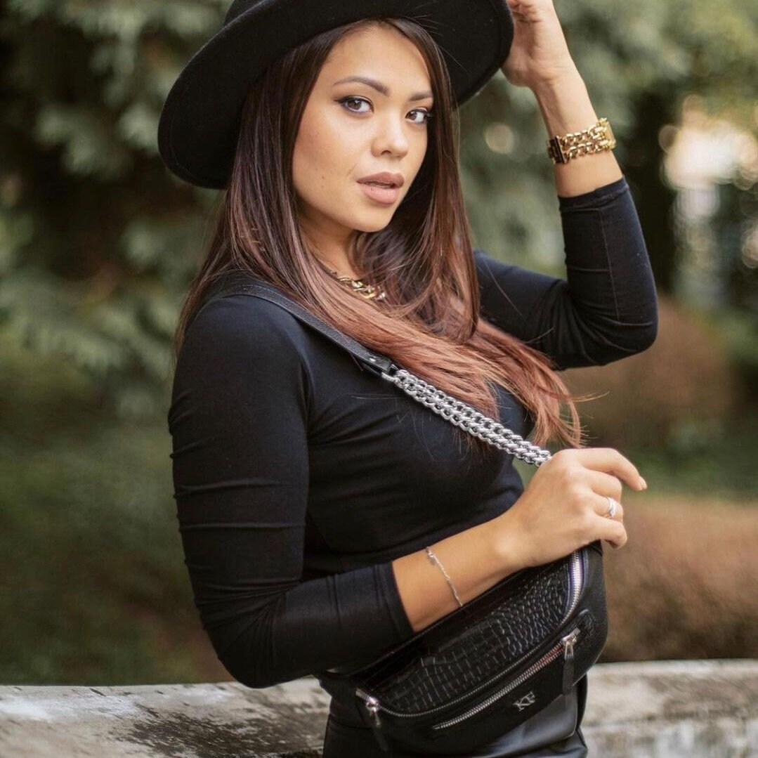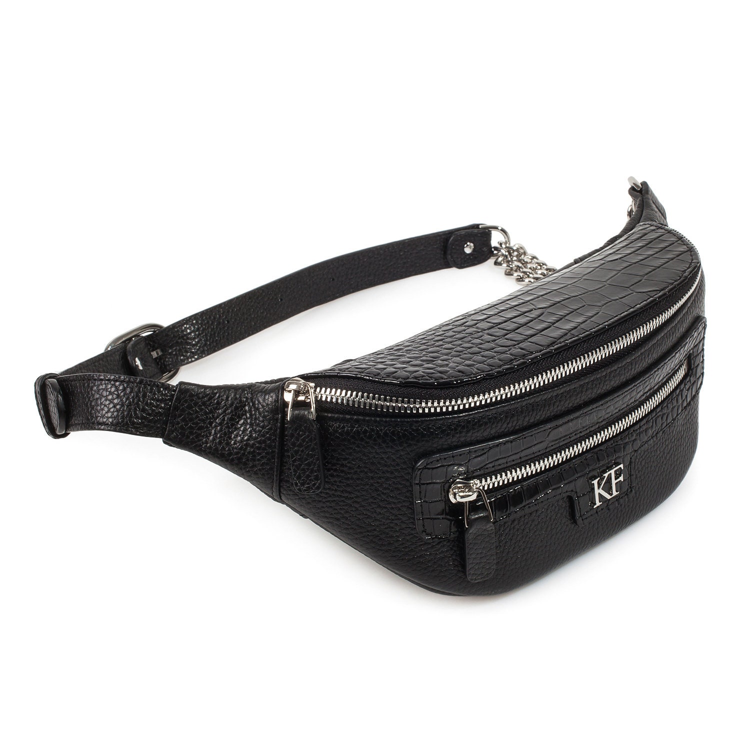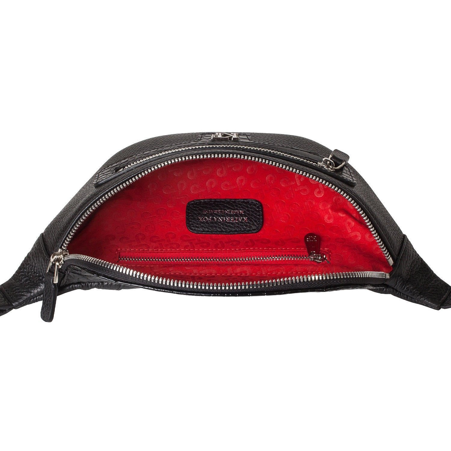 Black genuine leather woman bananka bag from ukrainian designer Katerina Fox. Fashionable and elegant modern bag KF for bright girls and women. This bag is able to attract attention and highlight your exquisite taste. Inside the bag is one large compartment and a convenient zippered pocket for small items, closes the bag on the zipper.