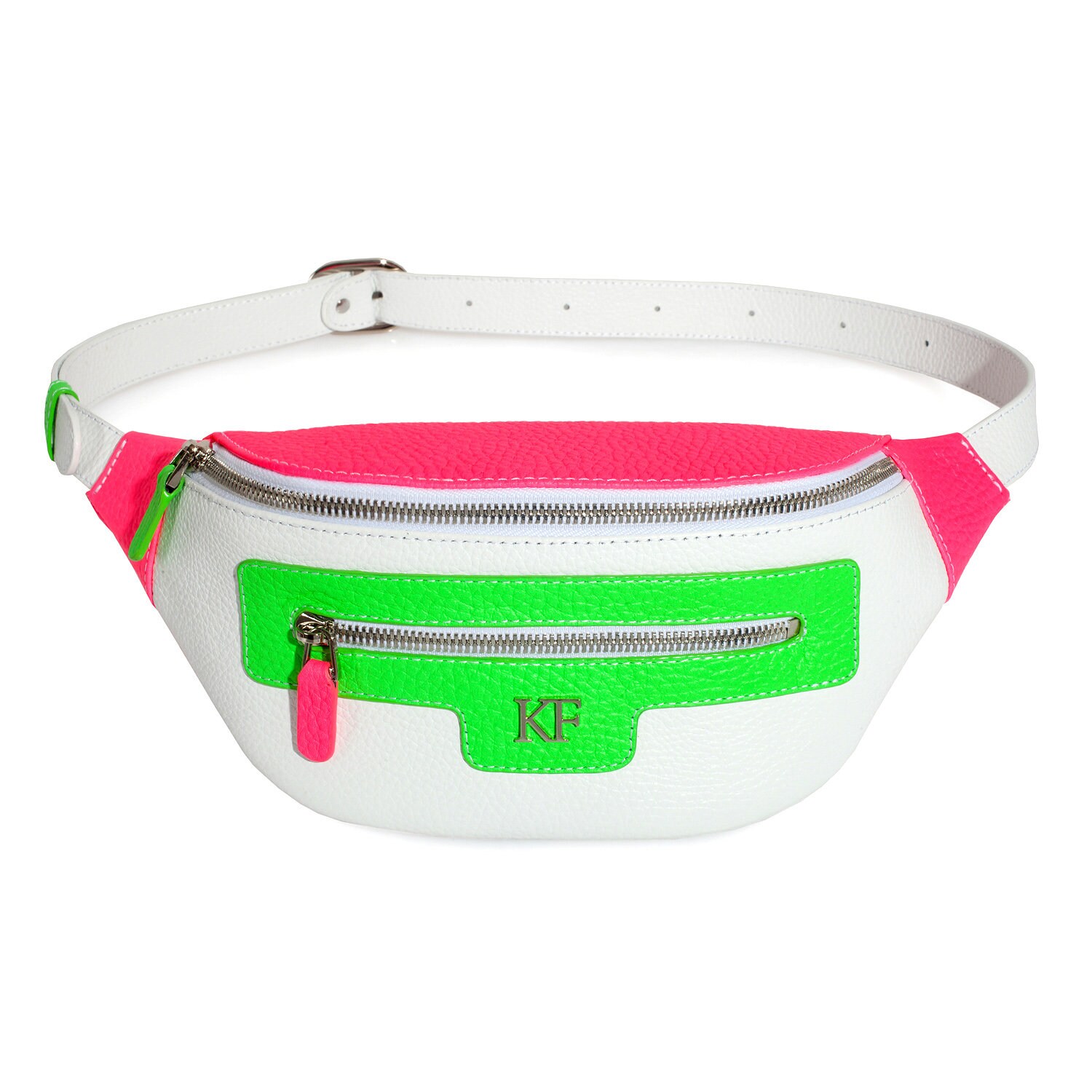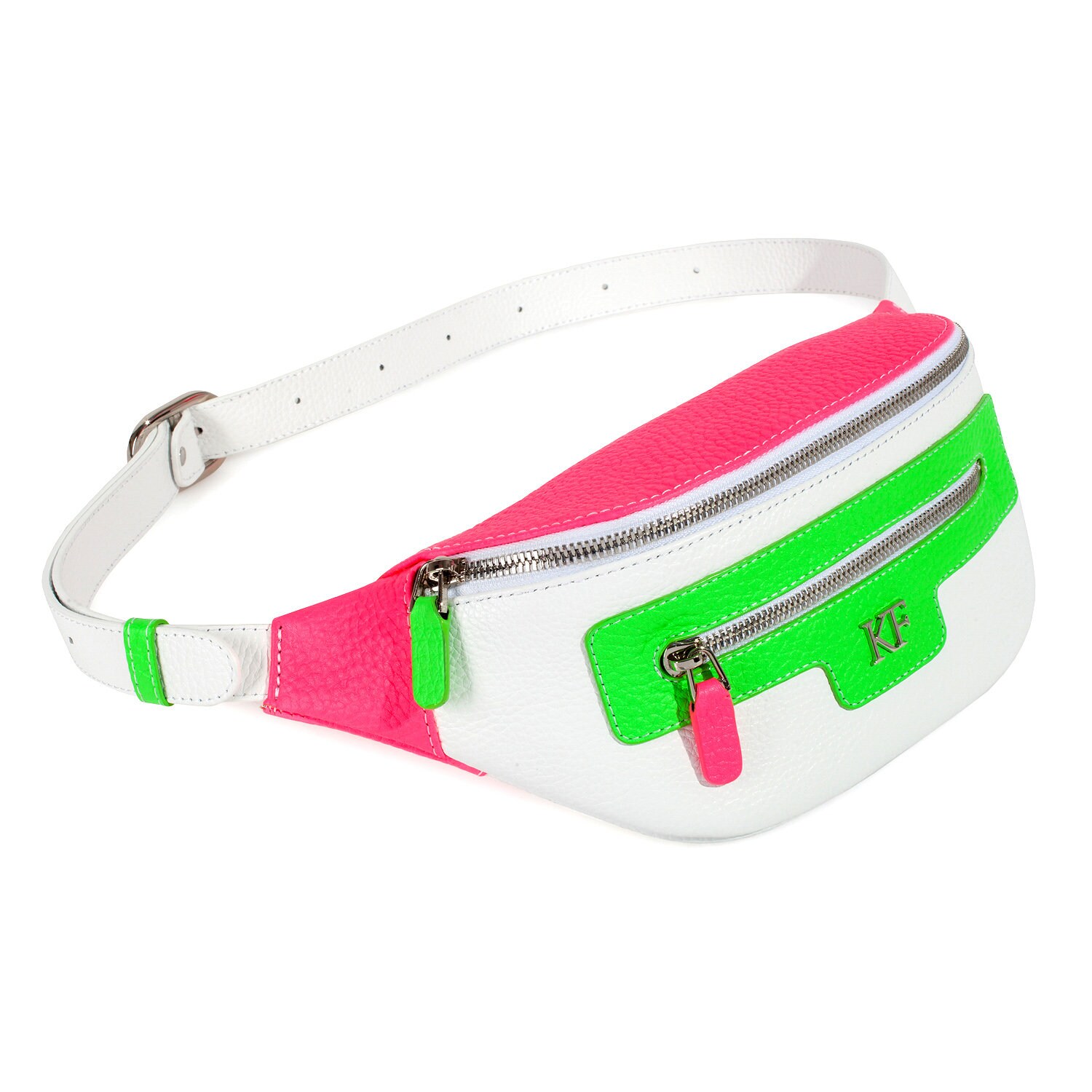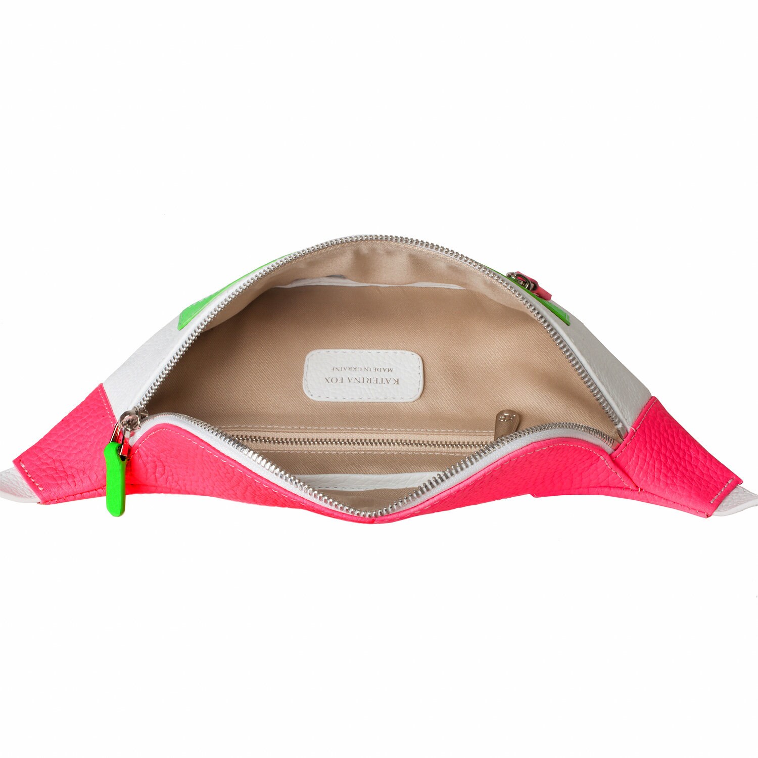 White genuine leather woman bananka bag from ukrainian designer Katerina Fox. Fashionable and elegant modern bag KF for bright girls and women. This bag is able to attract attention and highlight your exquisite taste. Inside the bag is one large compartment and a convenient zippered pocket for small items, closes the bag on the zipper.