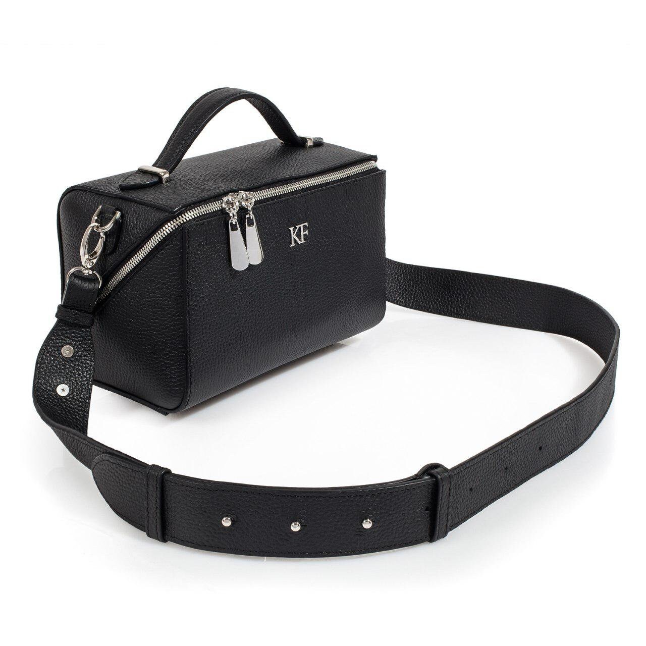 Black genuine leather woman shoulder bag from ukrainian designer Katerina Fox. Fashionable and elegant modern bag KF for bright girls and women. This bag is able to attract attention and highlight your exquisite taste. The internal space of a bag is equipped with one spacious compartment and one zipper pocket. The bag is closed with a zipper. The length of the strap is adjustable. The kit also includes a storage bag.